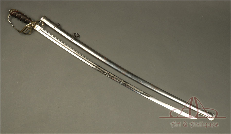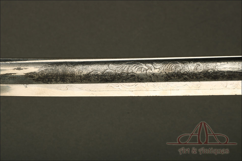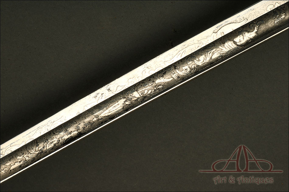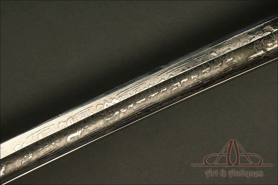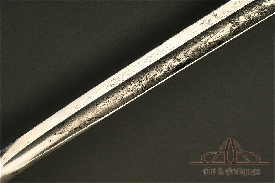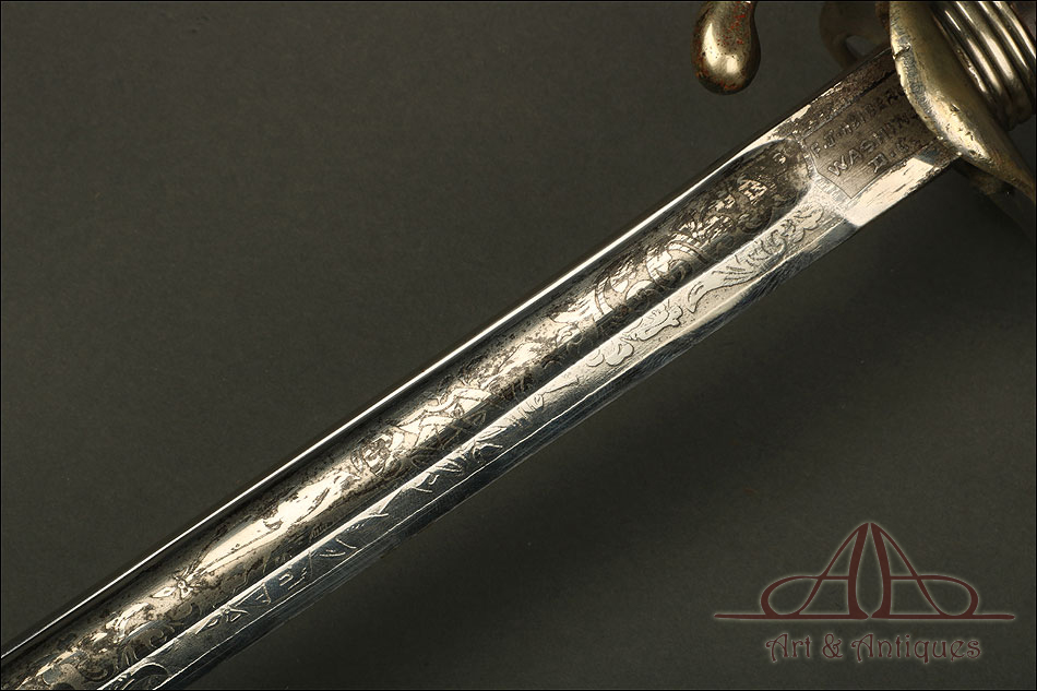 Bella y antigua espada de oficial de infantería modelo 1902, forjada en Estados Unidos y bien conservada. La espada se presenta con su vaina de acero original, también muy bien conservada, creando entre ambas una pieza de singular interés para los coleccionistas. La hoja está decorada al ácido con volutas clásicas e inscripciones. Cerca de la empuñadura podemos ver el sello de la forja con la ciudad de procedencia: WASHINGTON. La decoración está completa; aunque muestra un ligero desgaste producido por el paso del tiempo y el uso, sigue aportando a la espada una belleza fuera de lo común. La empuñadura lleva puño de madera maciza oscura y guardamano de latón; la guarda está dividida en varios gavilanes, creando un diseño lleno de originalidad e interés.