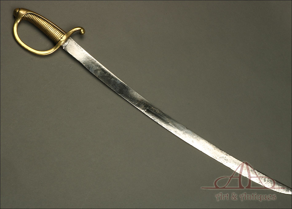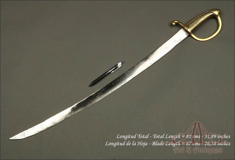 Magnífico sable briquet para sargento de infantería modelo 1818, forjado en España y muy bien conservado. El modelo es similar al sable francés AN13 de 1804; el ejército español imitó el diseño para fabricar los suyos. De acuerdo con el libro “Espadas españolas militares y civiles del Siglo XVI al XX”, "bajo la titulación genérica de tropa de infantería se bautizaron muchos sables para granaderos, cazadores, reales guardias valonas, etc., incluidas las clases de cabos y sargentos. Para estos últimos, este tipo de sable fue signo de rango hasta el siglo XX”. El arma que vemos en las imágenes lleva hoja de acero y empuñadura de latón, ambas en muy buenas condiciones. La empuñadura muestra un diseño sencillo y estilizado, muy elegante.