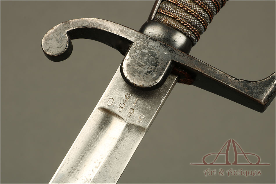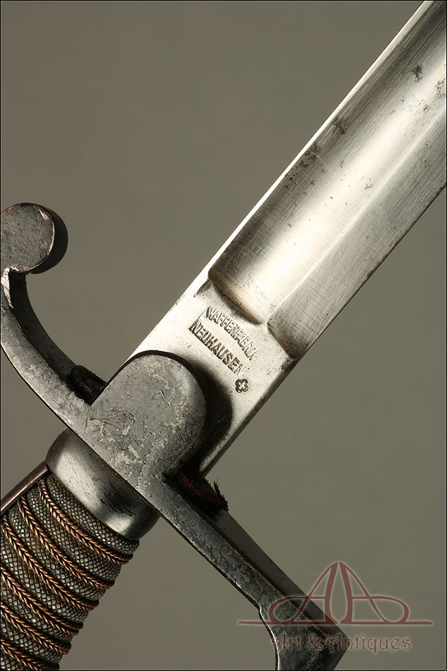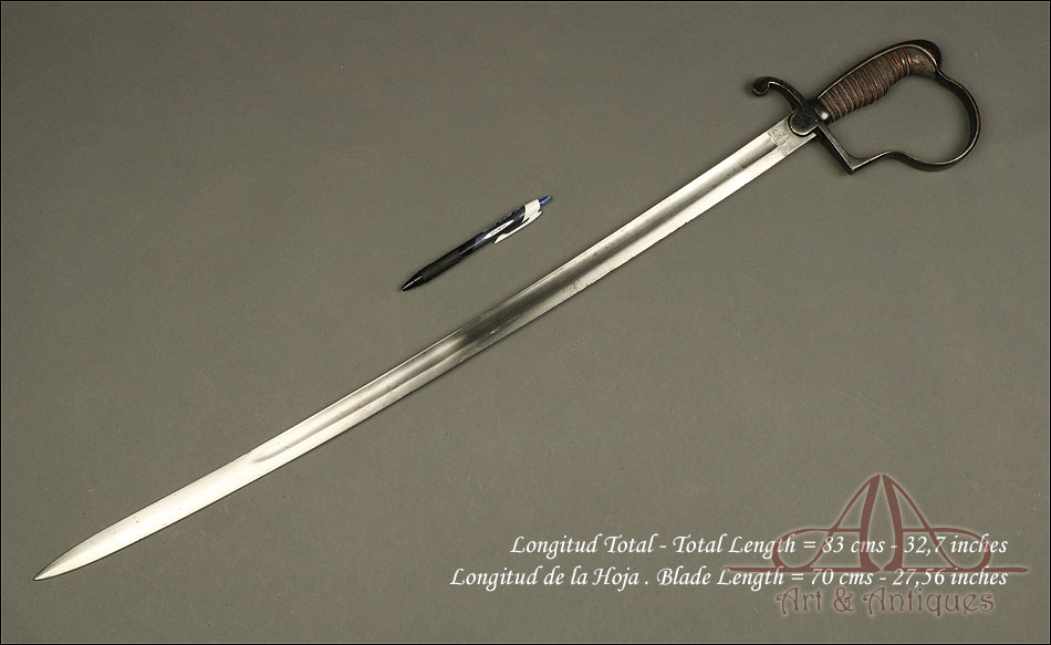 Bonita espada suiza de oficial de artillería modelo 1883, muy bien conservada y con sello grabado en la hoja. La espada muestra un diseño sencillo y funcional y ha llegado a nosotros en excelentes condiciones. En la hoja, junto a la empuñadura podemos ver un sello grabado con el nombre de la fábrica de armas y la localidad donde se encontraba: NEUHAUSSEN, junto con la cruz de la bandera suiza. En la otra cara hay un número grabado en el metal: 5680 15, perfectamente conservado y legible. La empuñadura conserva la lija y el torzal originales que protegen y refuerza el agarre; en el guardamano y la cruz distinguimos restos del acabado original, ahora desgastado por el paso del tiempo y el uso. Estos detalles hacen de esta espada una pieza de coleccionista, lleno de encanto y totalmente original.
