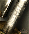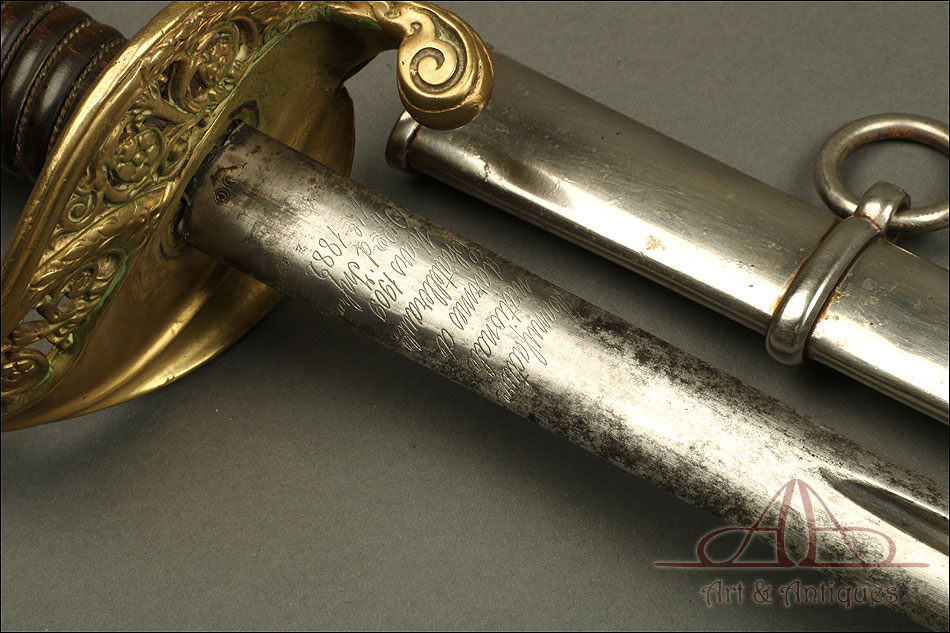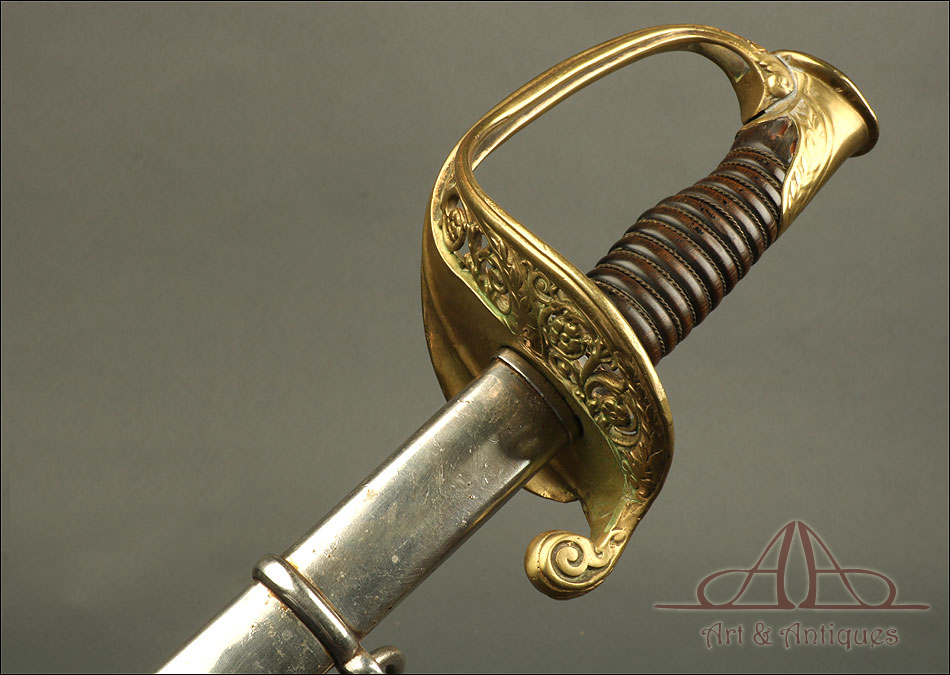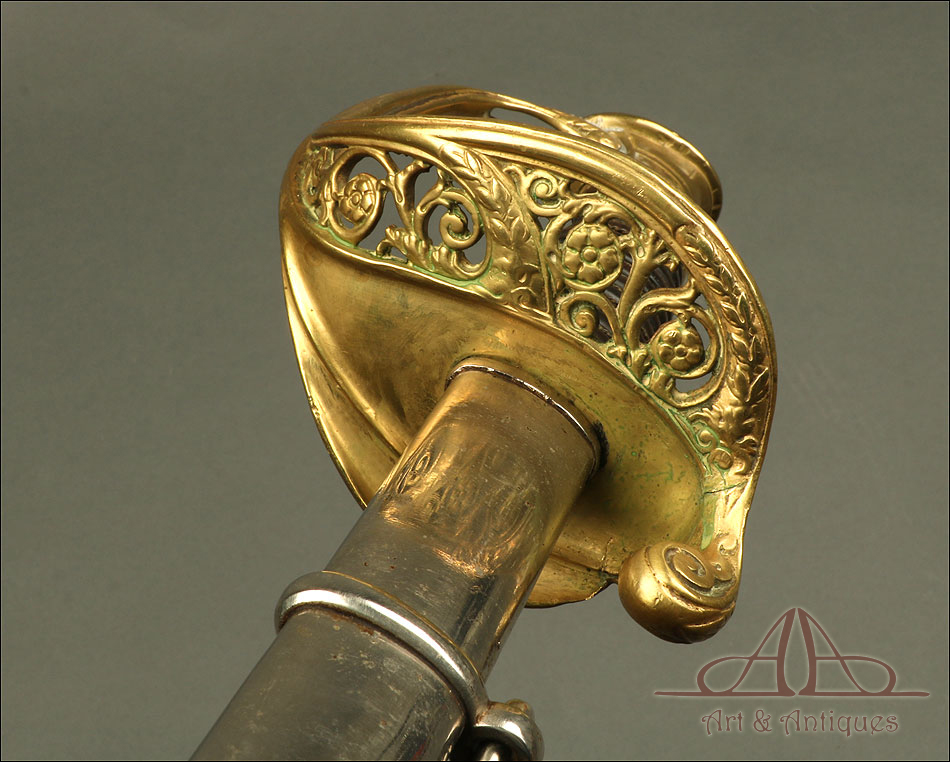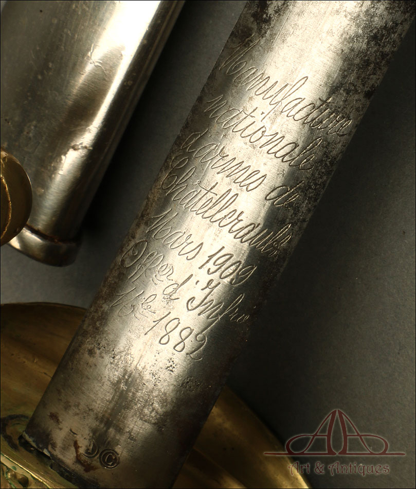 Antigua espada de oficial de infantería francesa modelo 1881, fechada en marzo de 1909 y procedente de Francia. La espada se encuentra en excelentes condiciones y va acompañada de su vaina de acero original. La hoja de acero está muy bien conservada y no muestra signos de deterioro evidentes. En su parte superior hay una inscripción grabada a mano donde podemos ver el nombre de la fábrica (Manufacture Nationale d'armes de Châtellerault), la fecha (Mars 1909) y el modelo (1882). La inscripción está bien conservada y perfectamente legible. La empuñadura de latón es de hermosa factura: está decorada con una serie de motivos y celosías florales con volutas, en buenas condiciones. El puño es de madera oscura maciza, con ranuras talladas en las que se enrolla el torzal original. El contraste entre la madera oscura y el metal brillante crea un diseño atractivo y atemporal.
