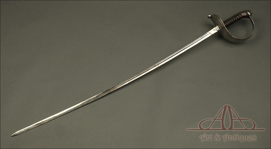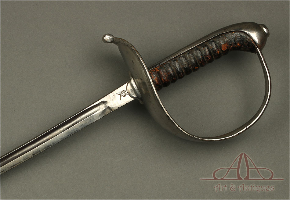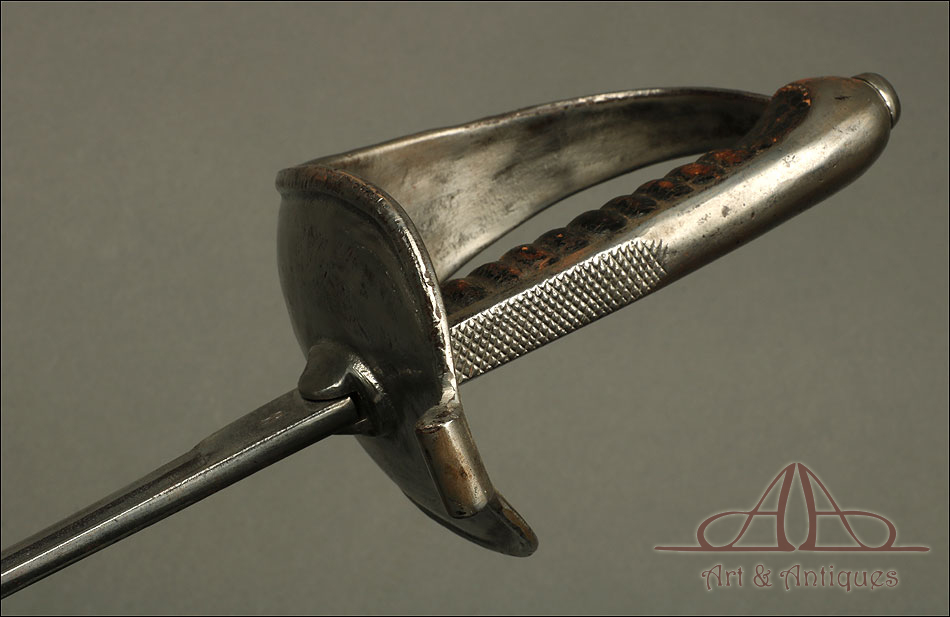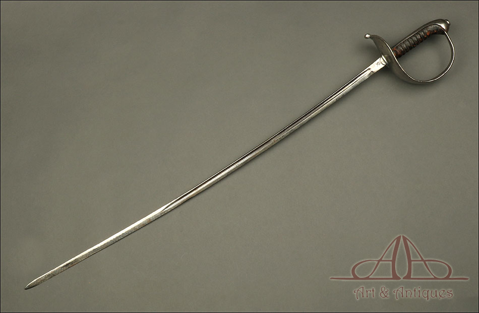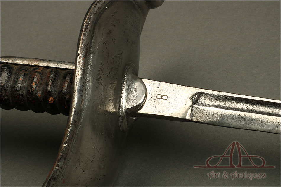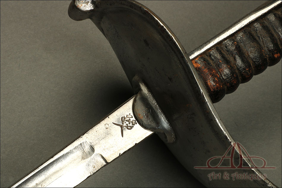Preciosa espada centroeuropea de oficial de infantería, fabricada a finales del siglo XIX y en buen estado de conservación. La espada destaca por su estilizado diseño, tan sobrio como elegante, y por hallase en buenas condiciones a pesar de tener más de un siglo de antigüedad. La hoja de acero no presenta signos destacables de deterioro; en su parte superior, junto a la cruz de la empuñadora podemos ver un número 8 grabado en uno de los lados. En el otro lado hay un sello en relieve con dos espadas y dos mazos cruzados. El sello está en perfecto estado y se aprecia con claridad. La empuñadura consta de puño de madera barnizada en tono oscuro y guardamano de cazoleta realizado en acero. De diseño sencillo y equilibrado, es el remate perfecto para esta fantástica espada antigua.