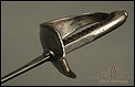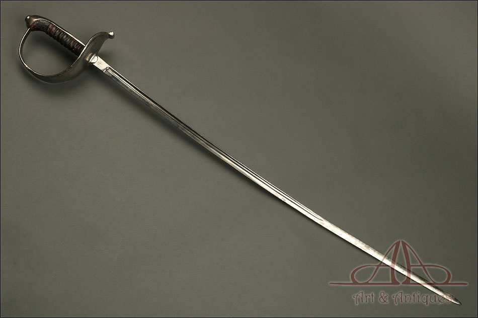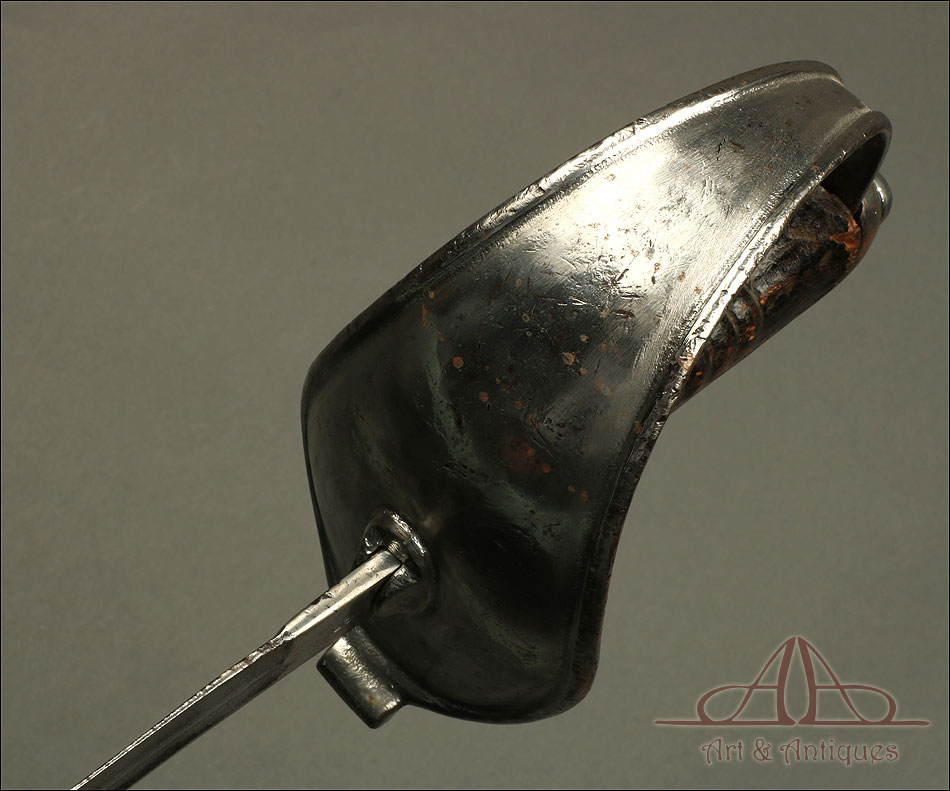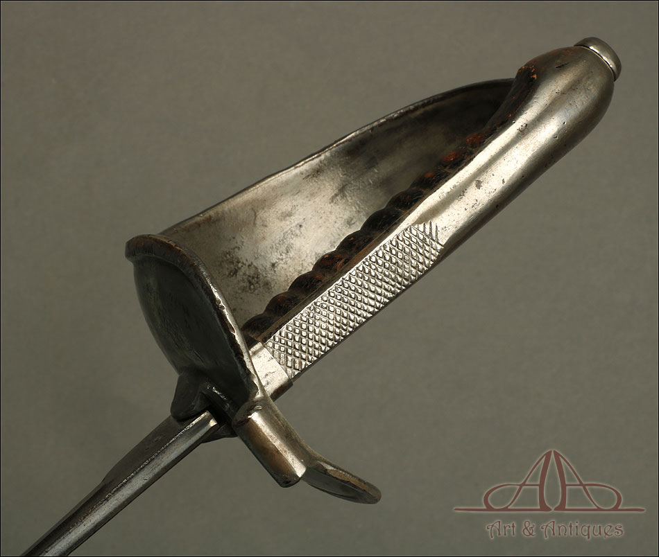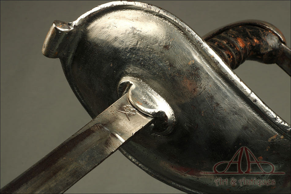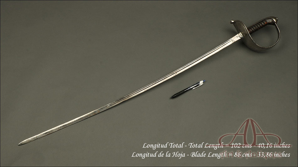 Preciosa espada centroeuropea de oficial de infantería, fabricada a finales del siglo XIX y en buen estado de conservación. La espada destaca por su estilizado diseño, tan sobrio como elegante, y por hallase en buenas condiciones a pesar de tener más de un siglo de antigüedad. La hoja de acero no presenta signos destacables de deterioro; en su parte superior, junto a la cruz de la empuñadora podemos ver un número 8 grabado en uno de los lados. En el otro lado hay un sello en relieve con dos espadas y dos mazos cruzados. El sello está en perfecto estado y se aprecia con claridad. La empuñadura consta de puño de madera barnizada en tono oscuro y guardamano de cazoleta realizado en acero. De diseño sencillo y equilibrado, es el remate perfecto para esta fantástica espada antigua.