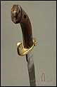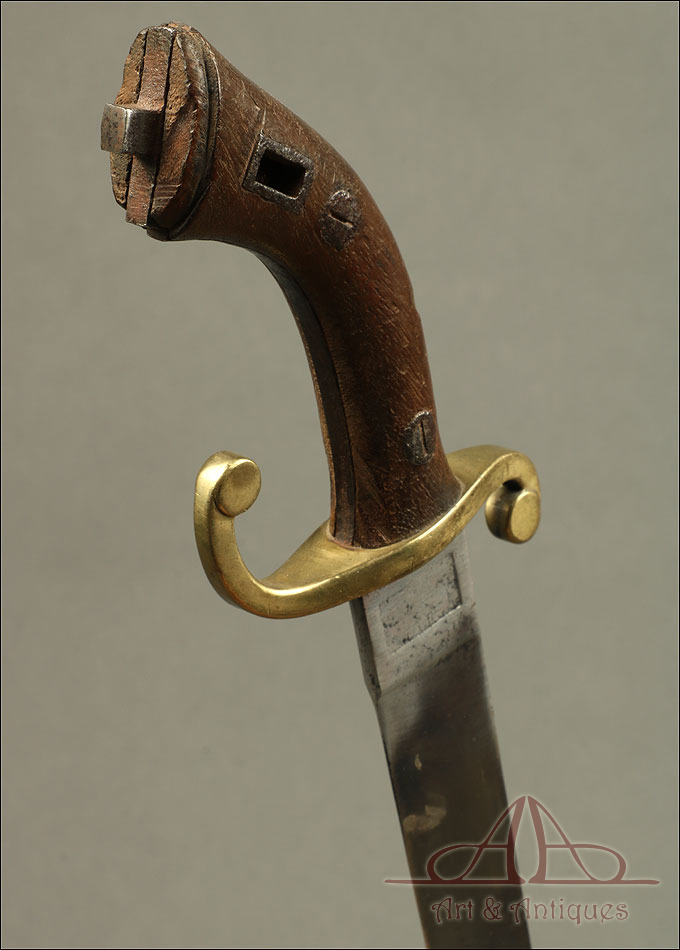 Antiguo machete español para fuerzas de seguridad modelo 1906. Esta arma destaca por su atractivo diseño, que combina tres materiales: acero, madera maciza y latón. En la empuñadura se echa de menos el pomo original, pero por lo demás el machete está completo y ha llegado a nosotros en buen estado de conservación. Este tipo de armas se caracterizan por su hoja corta y roma, sin apenas filo y sin punta, ya que se utilizaban para golpear. En la pieza que vemos en las fotos, la hoja de acero está magníficamente conservada y se muestra pulida y brillante. La empuñadura lleva cachas de madera maciza y cruz de latón, recta y con dos gavilanes curvos en los extremos. Las cachas son de un atractivo color castaño y están fijadas al puño con los remaches originales. En la parte superior, el puño lleva un agujero rectangular para pasar el correaje.