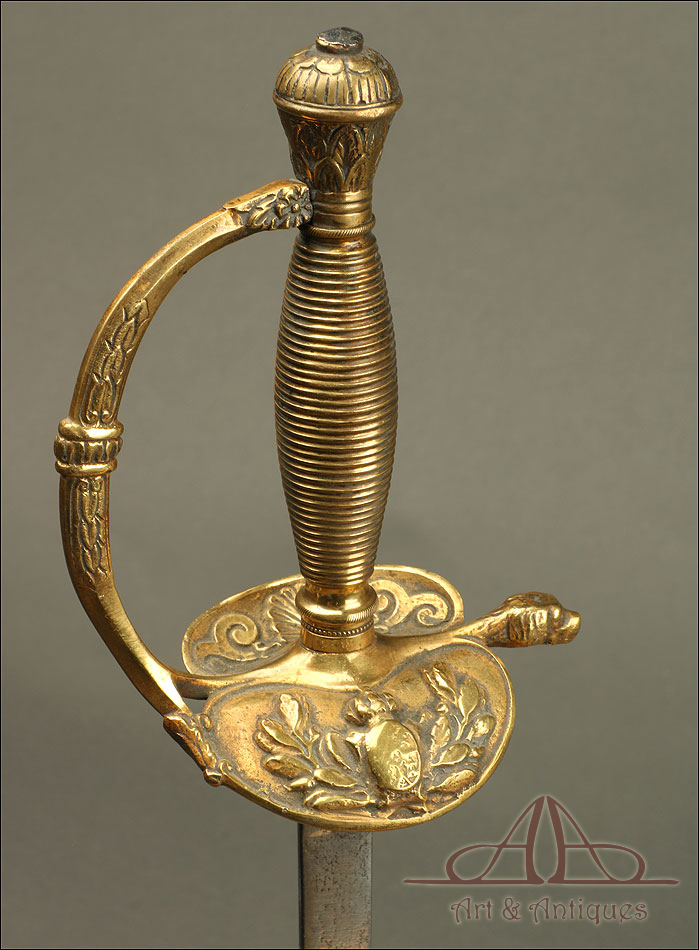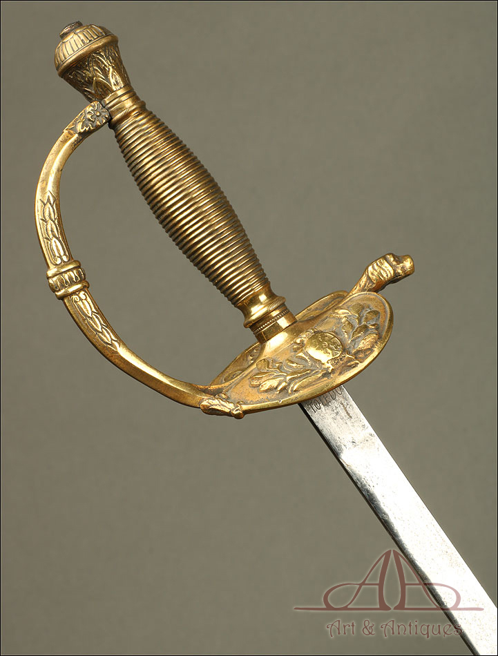 Preciosa y antigua espada de gala para oficial de infantería modelo 1867, fechada en 1887 y en buen estado. La espada que vemos en las imágenes lleva hoja de acero lisa, sin signos apreciables del paso del tiempo o el uso y con la fecha 1887 grabada cerca de la cruz. La empuñadura es una pieza muy hermosa, fabricada íntegramente en latón y con la decoración en relieve característica de las espadas de gala de la época. El guardamano está decorado con flores grabadas y va unido a la cruz, amplia y dividida en dos laterales circulares simétricos. En uno de ellos distinguimos un escudo oval sobre ramas de laurel, mientras que el otro muestra un motivo con volutas y una vieira central. En la parte central, entre ambos laterales surge un gavilán con forma de cabeza de perro. El puño ahusado está surcado de ranuras paralelas, mientras que el pomo muestra una delicada decoración grabada con motivos vegetales.