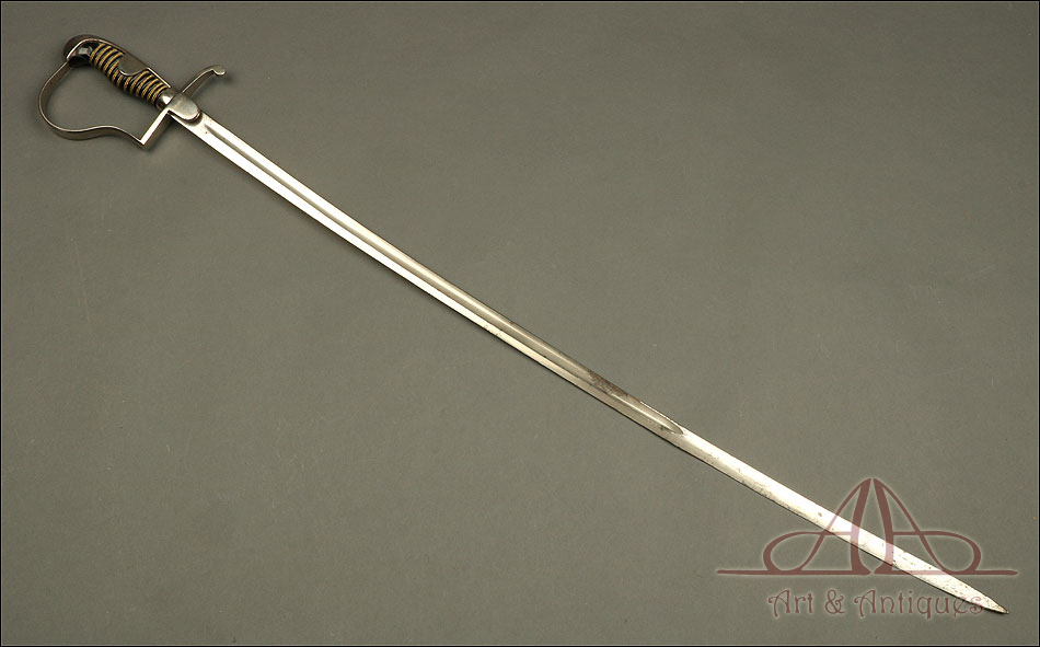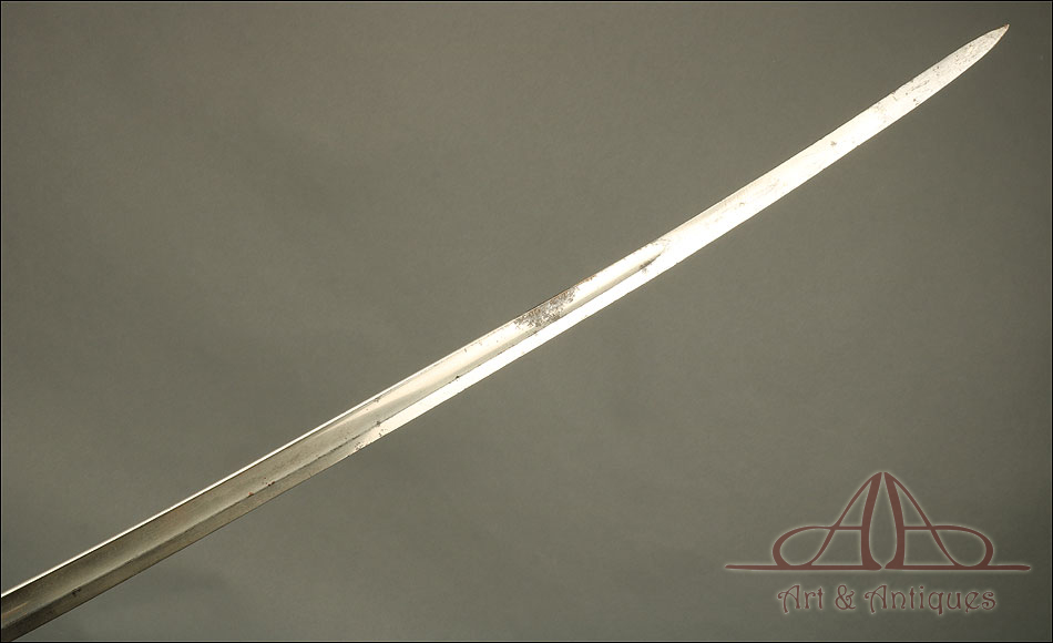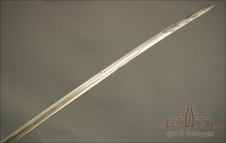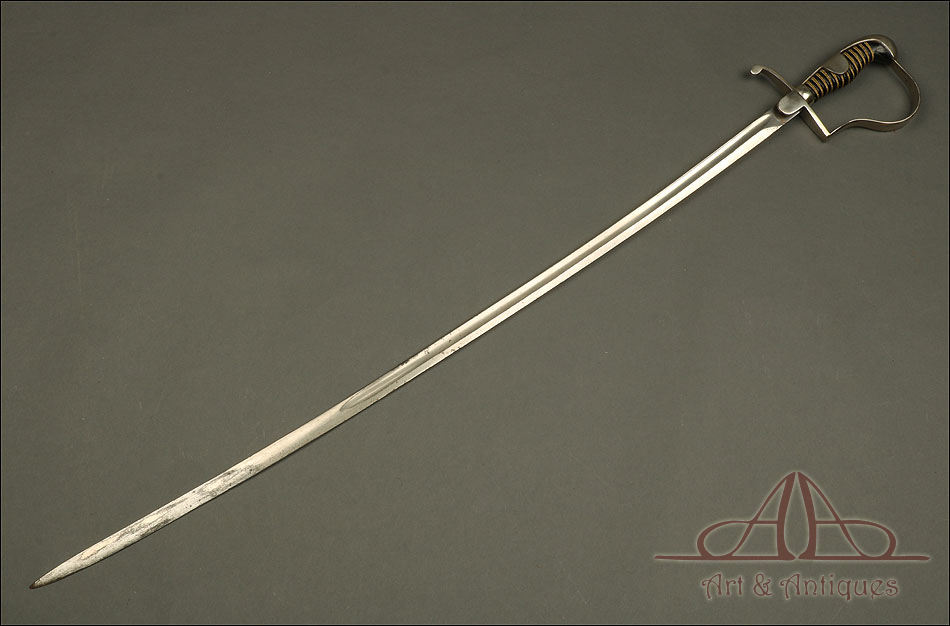 Fantástica espada sable para suboficial de la Wehrmacht alemana, modelo 1890 fabricada por Robert Klaas de Solingen. Esta espada es completamente original y fue empleada durante la II Guerra Mundial. Es el modelo oficial para el uniforme de los suboficiales de caballería y artillería alemanas del Tercer Reich. Se trata, por tanto, de un arma llena de interés y atractivo para cualquier apasionado por la historia contemporánea. La espada lleva montura anatómica con puño de madera maciza oscura. El puño está labrado en ranuras paralelas, que conservan el torzal original en perfectas condiciones. El resto de la empuñadura (cruz, guardamano y pomo) son de acero y muestran un diseño sencillo y funcional. En la hoja de acero, bajo la cruz podemos ver un sello grabado en el metal correspondiente a la fábrica de armas donde forjaron la espada, en este caso, Robert Klaas de Solingen.