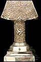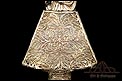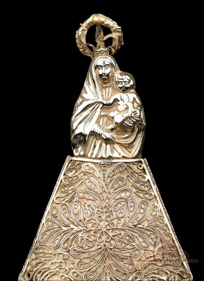 La parte superior con la imagen de la Virgen y el Niño es sencilla y hermosa, con líneas simples y relieves pronunciados. La parte inferior, correspondiente al gran faldón, está creada con tiras de plata moldeadas que dan forma a un intrincado diseño simétrico de inspiración floral. El pilar cilíndrico también está revestido de filigranas de plata, siguiendo la misma configuración. La base del pilar es de plata lisa, al igual que el revestimiento de la pieza portante. En este revestimiento podemos ver tres contrastes claramente marcados: el correspondiente al platero J. TABONGI, un sello con un león rampante y otro con la figura de una copa y las iniciales AG.