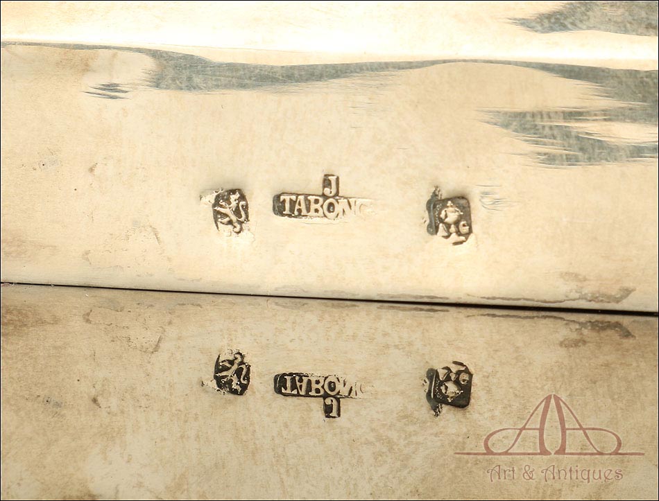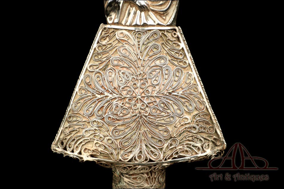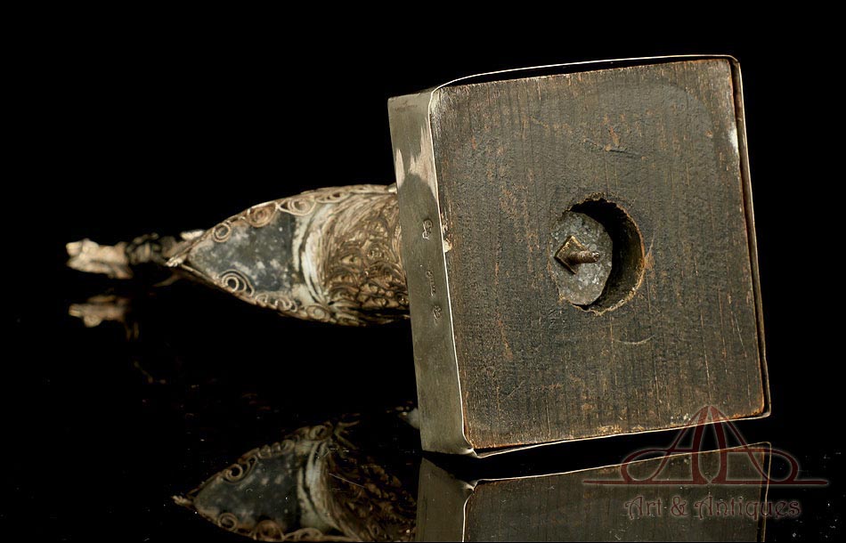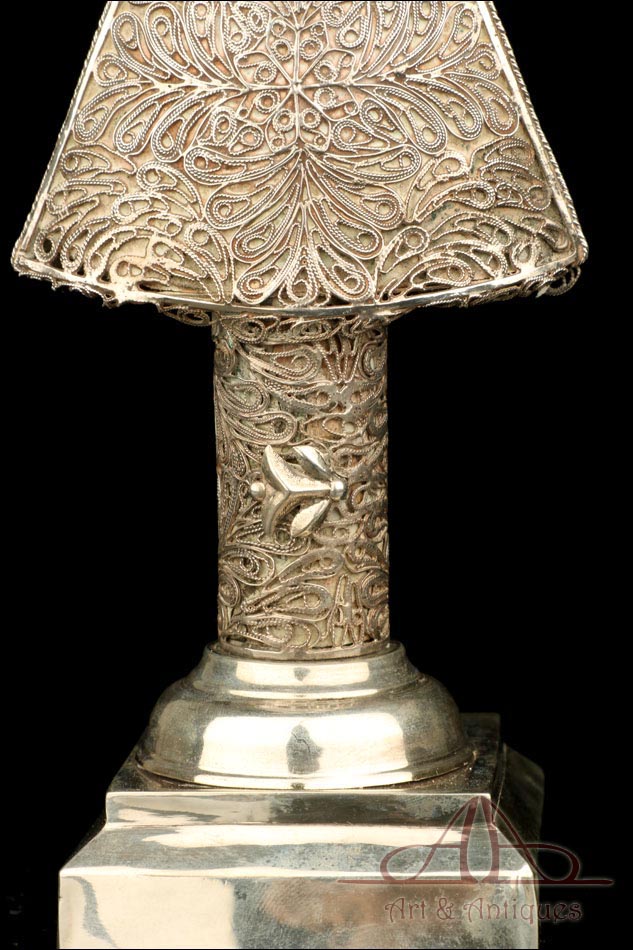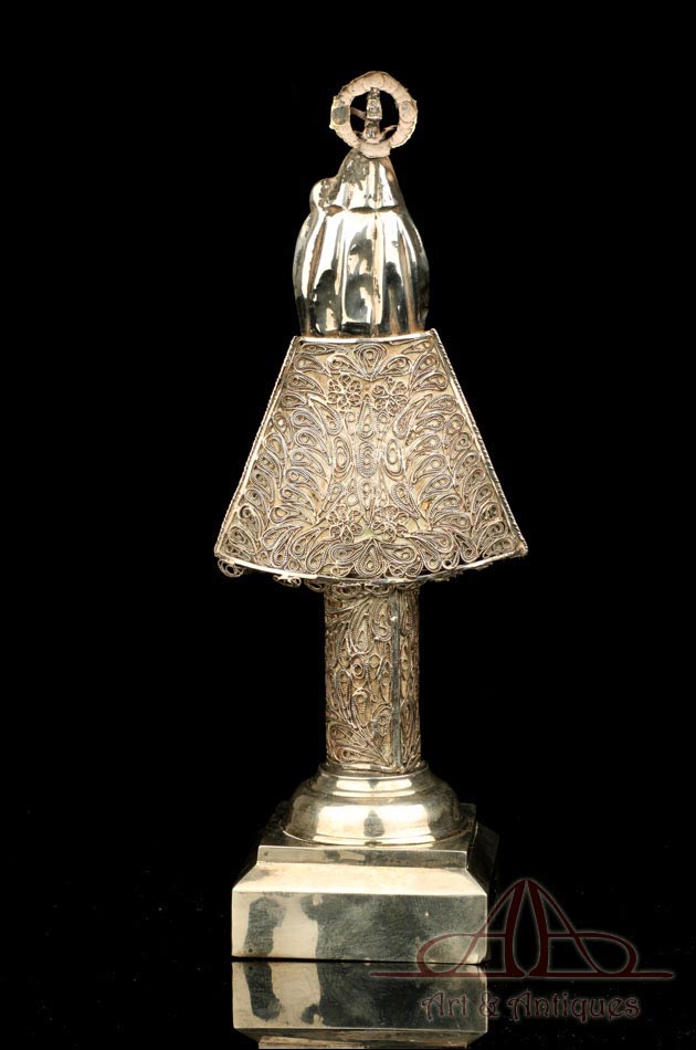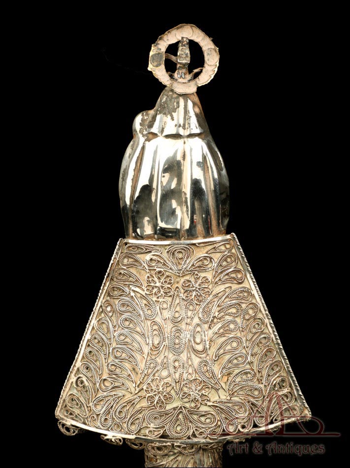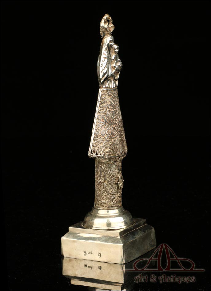 Magnífica y antigua Virgen del Pilar de plata procedente de Zaragoza, España y realizada en el siglo XIX. Se trata de una pieza original de época, muy bien conservada y con contrastes que dan fe de su autoría y calidad. La figura representa a la Virgen a la manera clásica, con el Niño Jesús en brazos y una amplia forma triangular debajo que representa un faldón. La Virgen está asentada sobre el Pilar que le da nombre, sustentado a su vez por una pieza cuadrada de madera maciza revestida de plata. Toda la figura está montada sobre una estructura de madera que le aporta solidez y estabilidad.