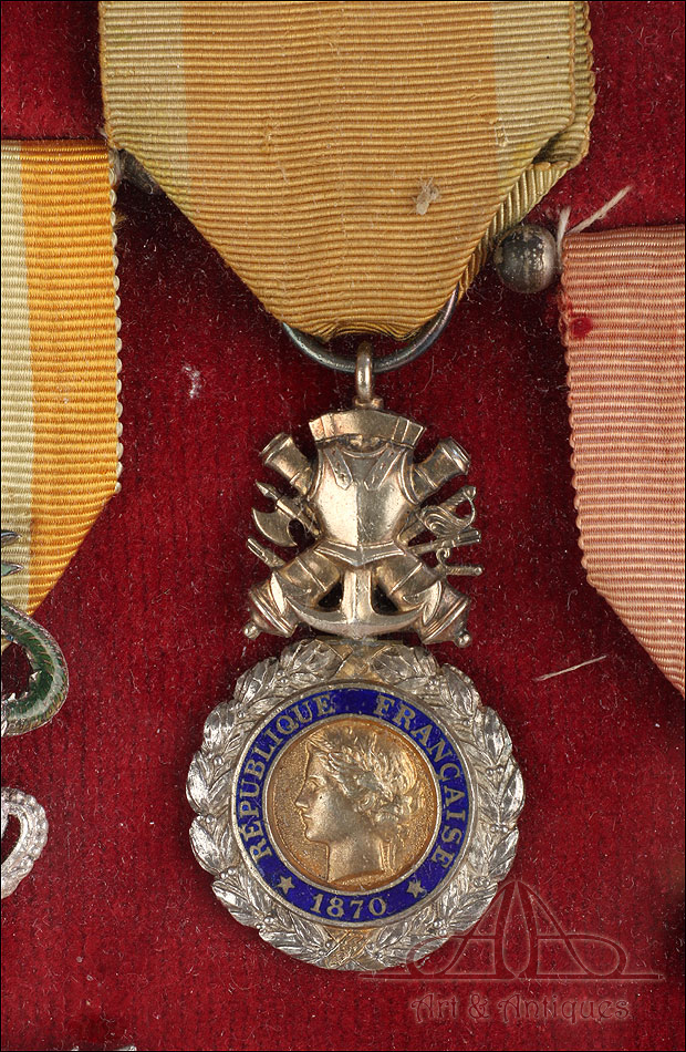 Magnífico conjunto de medallas de un combatiente francés en la 1ª y 2ª GM, enmarcadas y totalmente originales. Las medallas le fueron otorgadas a su propietario durante las dos guerras más importantes del siglo XX. Tras participar en la 1ª Guerra Mundial, el combatiente participó en la 2ª Guerra Mundial como parte de la Resistencia francesa. Las medallas están expuestas en un marco artesanal, de madera negra y con apliques de metal. Están fijadas en un fondo de terciopelo rojo oscuro, sobre el cual destacan los colores de la seda, los metales y los esmaltes.
