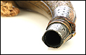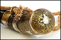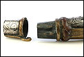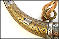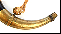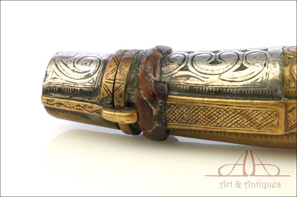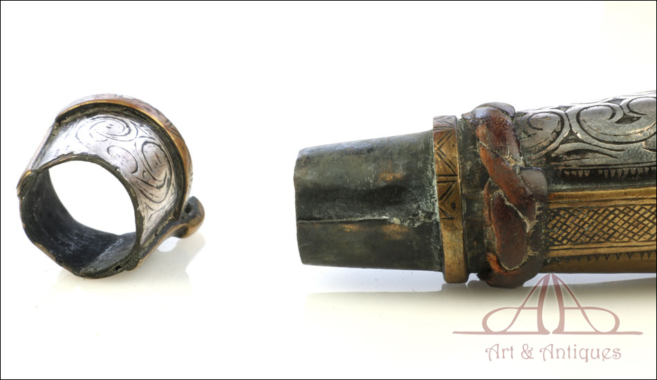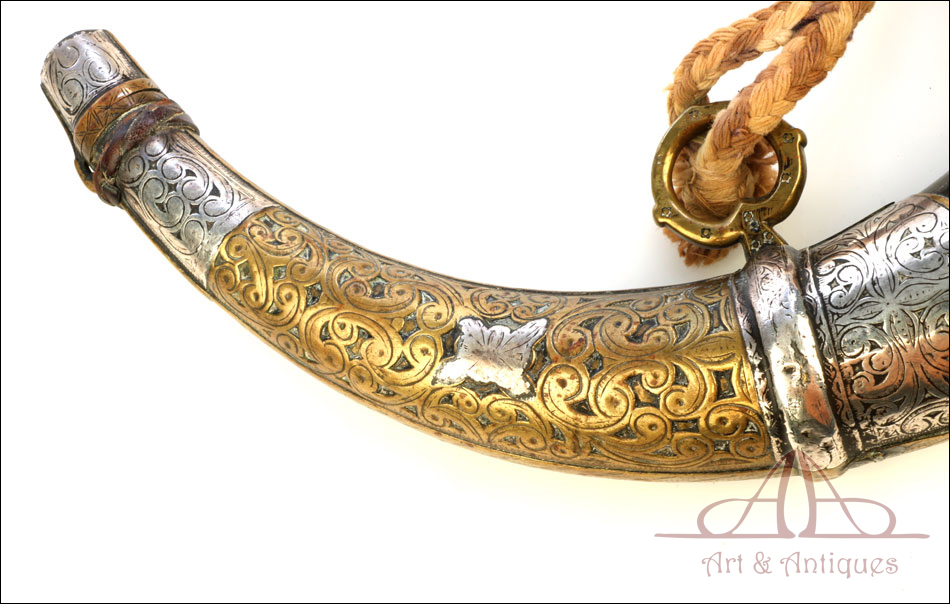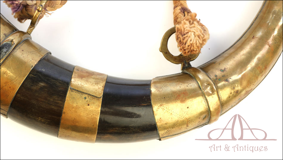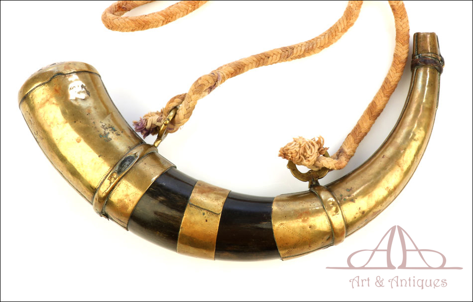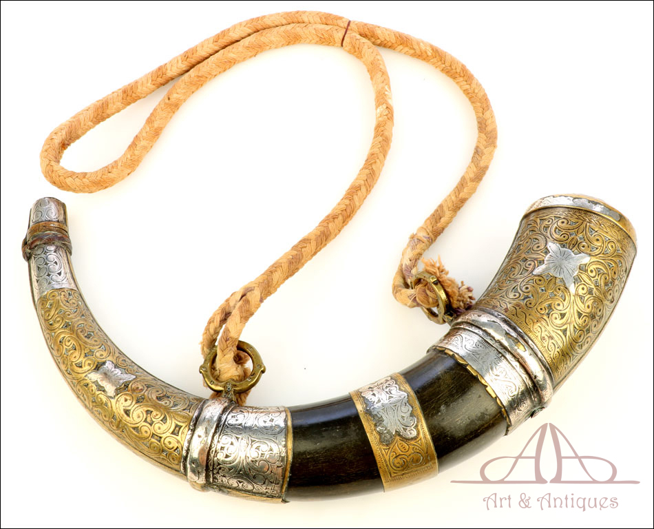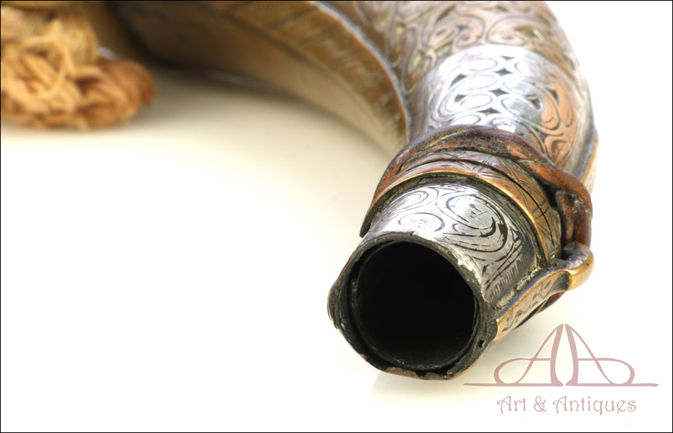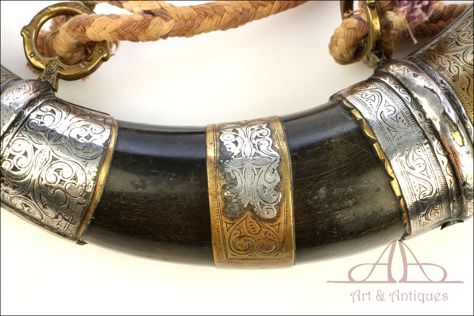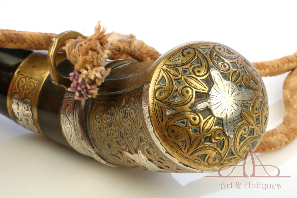 Antiguo cuerno de pólvora negra o polvorera en plata y latón, fabricado a principios del siglo XIX o posterior y en muy buen estado. El cuerno es natural, de color marrón muy oscuro, y destaca por la bellísima decoración de apliques en plata maciza y latón que lo recubren casi por completo. Por la cara delantera de la polvorera, los revestimientos de metal están totalmente decorados con detalles repujados de inspiración mudéjar, realizados con el máximo detalle y de gran delicadeza. Por su cara posterior, la polvorera está forrada únicamente con hojas de latón lisas, sin detalles de plata ni decoración repujada. El artículo está casi completo: la única pieza que falta es la tapa del tapón. El resto, incluyendo las hermosas anillas de latón a las que se ata la cuerda, son originales.