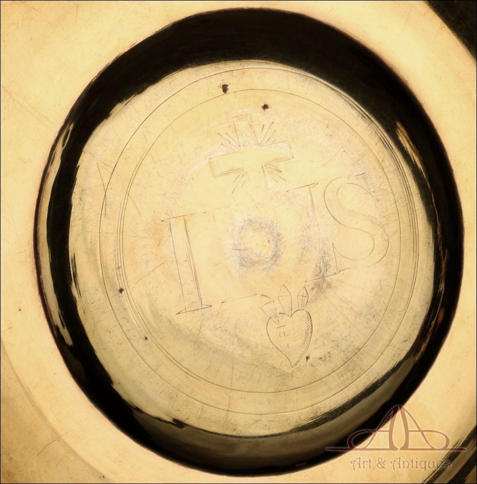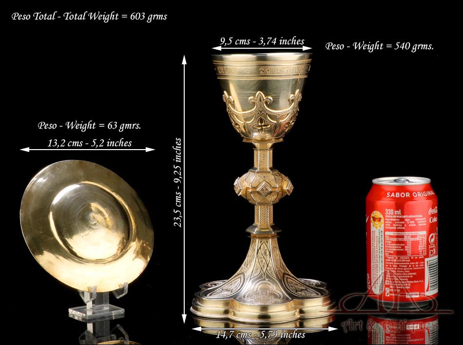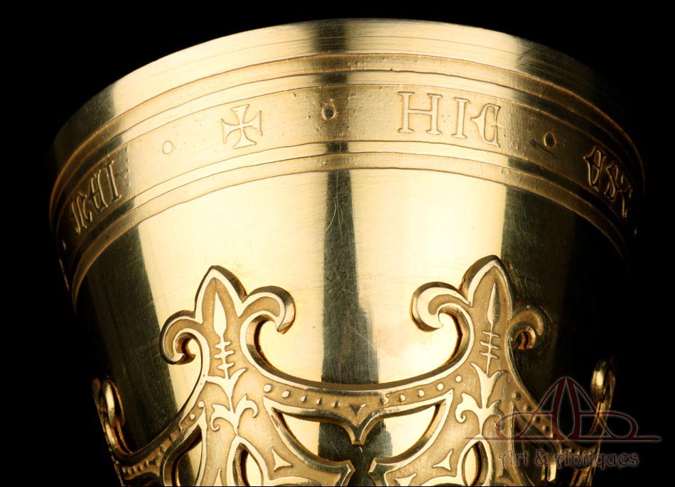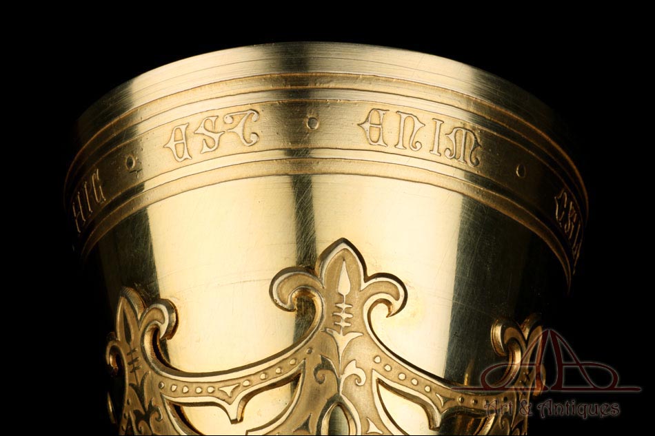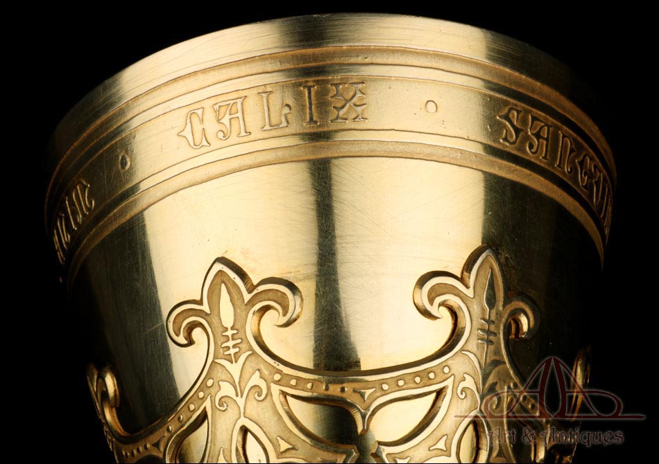 Coronando el cáliz se alza la copa, con sobrecopa rematada en flores de lis y motivos medievales abstractos. Junto al borde de la copa podemos ver una inscripción latina grabada a mano, con letras en relieve: “HIC EST ENIM CALIX SANGUINIS MEI” (“Éste es el Cáliz de Mi Sangre”). La patena que acompaña a esta fantástica pieza es de plata dorada contrastada, con el acrónimo IHS, la cruz y el Sagrado Corazón grabados a mano. Es original de París y lleva un contraste que sitúa su fabricación circa 1820.