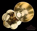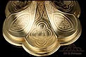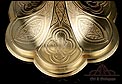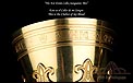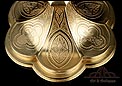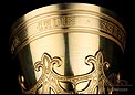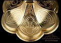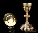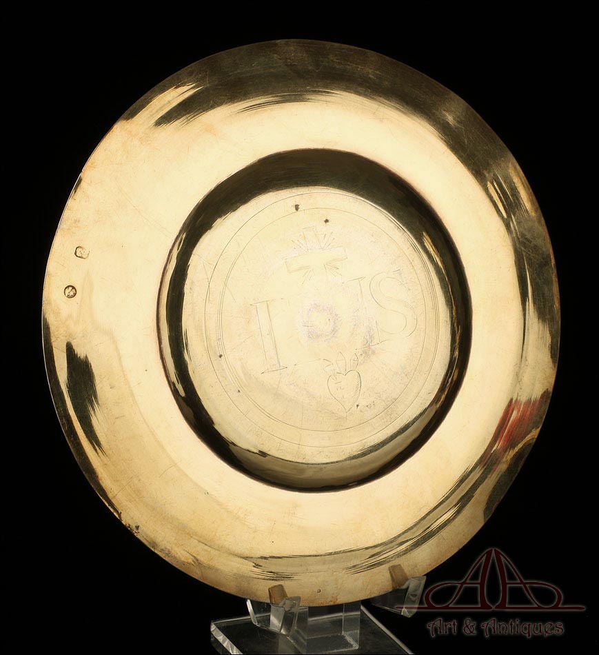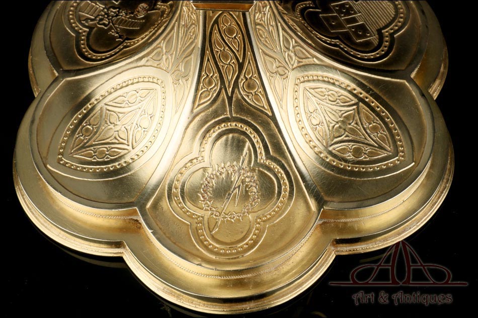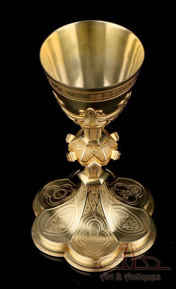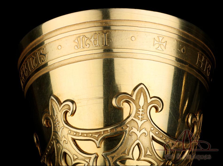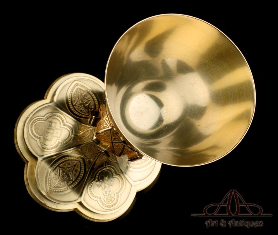 Coronando el cáliz se alza la copa, con sobrecopa rematada en flores de lis y motivos medievales abstractos. Junto al borde de la copa podemos ver una inscripción latina grabada a mano, con letras en relieve: “HIC EST ENIM CALIX SANGUINIS MEI” (“Éste es el Cáliz de Mi Sangre”). La patena que acompaña a esta fantástica pieza es de plata dorada contrastada, con el acrónimo IHS, la cruz y el Sagrado Corazón grabados a mano. Es original de París y lleva un contraste que sitúa su fabricación circa 1820.