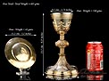 Medidas: Cáliz: Ancho de la Base: 14,7 cm. Altura: 23,5 cm. Ancho de la Copa: 9,5 cm. Peso: 547 g. Patena: Diámetro: 13,2 cm. Peso: 63 g. Peso Total: 610 g.