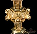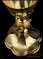 La base del cáliz es una pieza muy hermosa, con forma lobulada y dividida en pétalos. Cada sección lleva una figura que contiene un símbolo. Podemos ver los atributos de la crucifixión (la escalera, la lanza y la lanza con la esponja), la corona de espinas y los tres dados (con los que los soldados romanos se jugaron la ropa de Cristo). Entre los símbolos hay mandorlas ojivales con elementos decorativos y simétricos, todos ellos de inspiración medieval. Sobre la base se alza el tallo, de sección hexagonal y decorado con zonas en espiga. El nudo central prosigue con la decoración de estilo gótico, y lleva seis relieves con forma de rombo.
