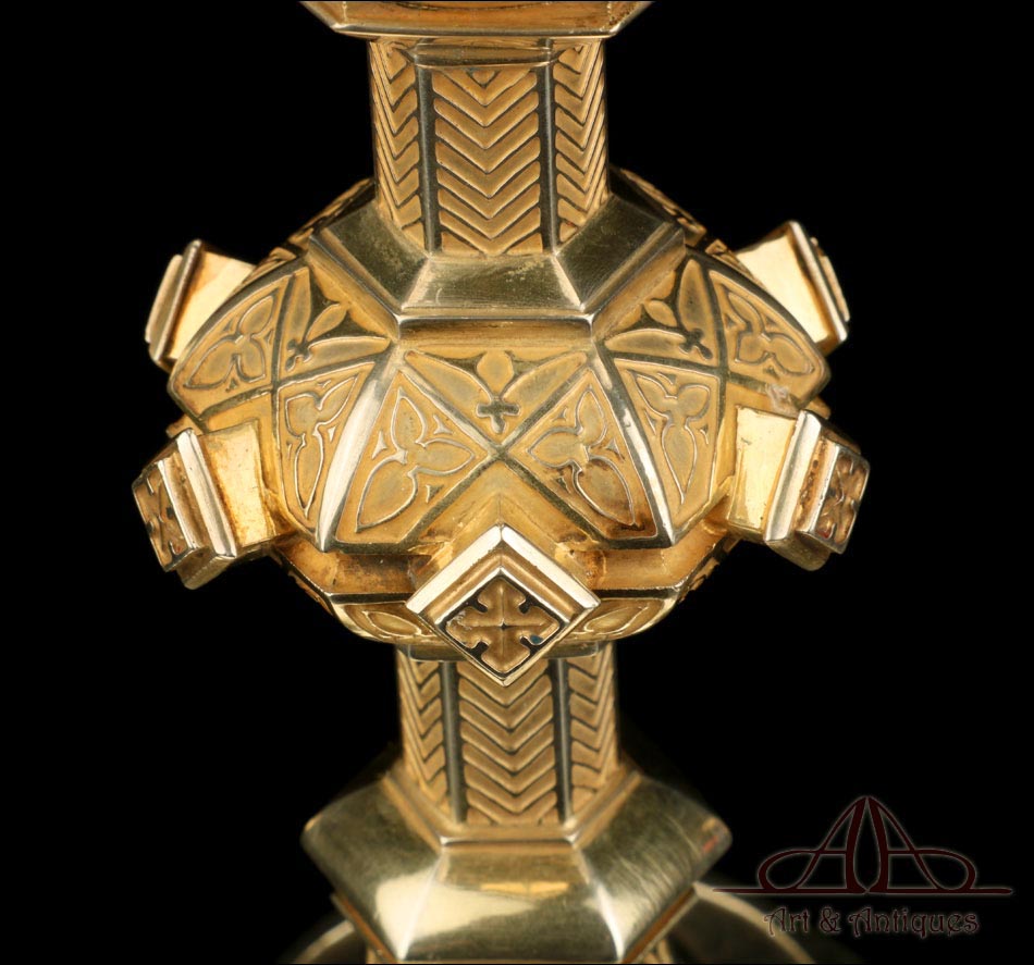 Antiguo cáliz neogótico de plata maciza dorada fabricado en España a principios del siglo XX. Esta bellísima pieza muestra un atractivo diseño de inspiración medieval, un estilo muy en boga en la época. Está fabricado íntegramente en plata maciza y lleva una bella decoración de motivos grabados a mano. El cáliz solo lleva un contraste situado en la parte interna de la base; corresponde al nombre del platero, que está incompleto. La patena que acompaña al cáliz es de origen francés, de plata maciza dorada y con contrastes.
