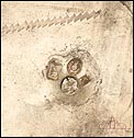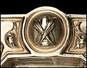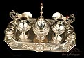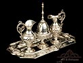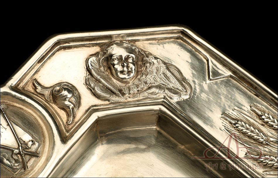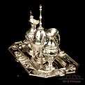 La bandeja está decorada con relieves tallados a mano que representan cabezas de querubines, espigas de trigo, racimos de uva, juncos y rosas. En la parte superior central podemos ver el Santo Sudario con el rostro de Cristo, y a ambos lados atributos del Martirio. Las vinajeras también llevan símbolos grabados a mano: podemos distinguir una trompeta del Juicio Final y un grupo de tres lanzas, entre otros. Están decoradas con motivos florales y cabezas de ángeles. La correspondiente al agua lleva engarzada una piedra de cristal blanco, mientras que la del vino es de color rojo. Además de los contrastes, las dos vinajeras llevan grabada en la base la marca en zigzag que suele encontrarse en la plata maciza española antigua.