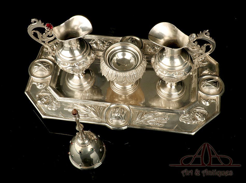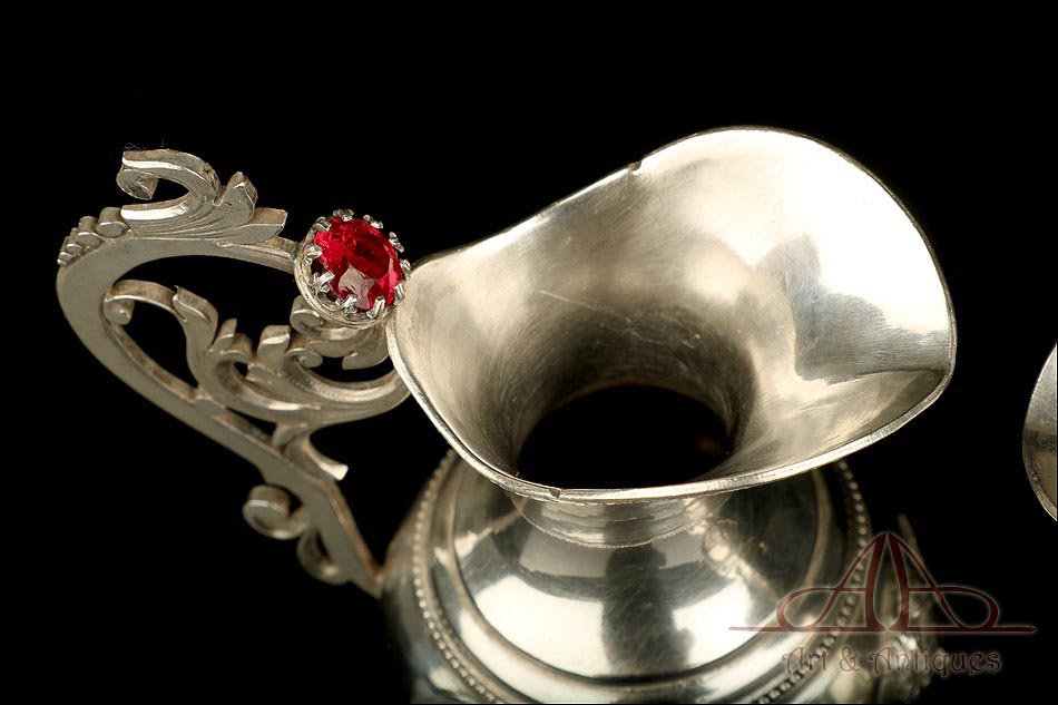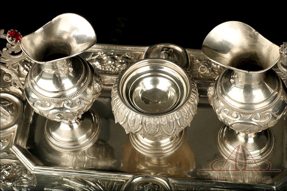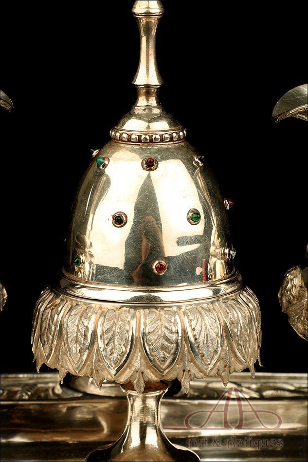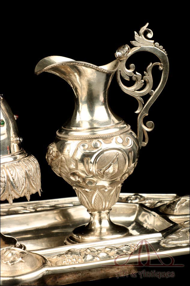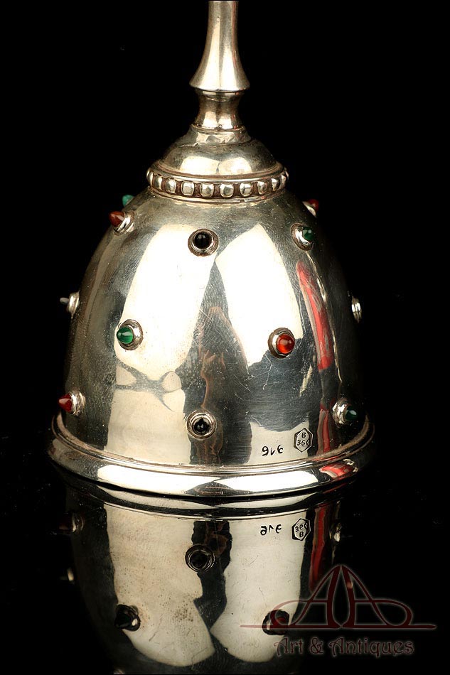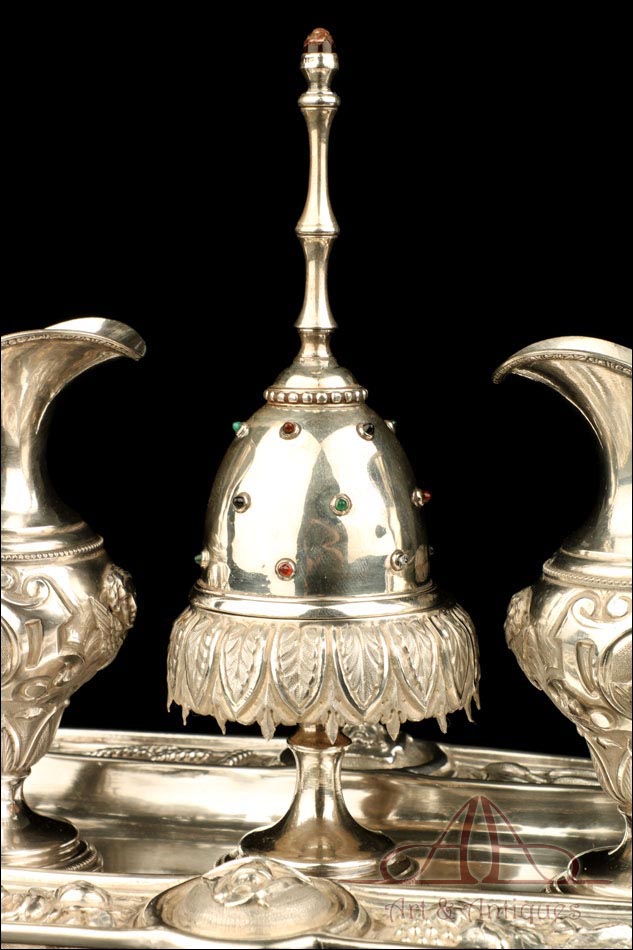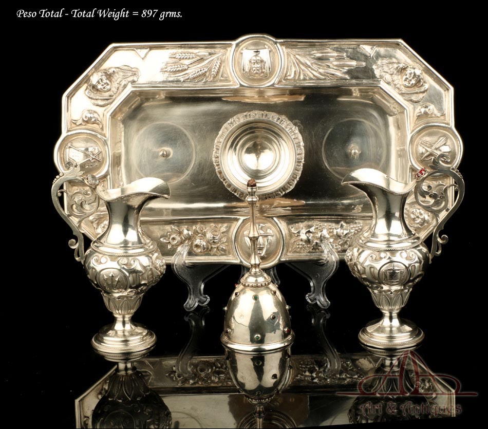 Rarísimo modelo de vinajeras litúrgicas antiguas con campanilla en plata maciza, fabricado en Barcelona en el siglo XIX. Se trata de un artículo realmente especial, ya que este tipo de conjuntos son muy difíciles de encontrar. De tamaño grande, las vinajeras llaman la atención por su cuidado diseño y su decoración. La campanilla que las acompaña no es la original, sino que fue añadida posteriormente; es también de plata maciza y está decorada con diminutos cristales de colores dispuestos ordenadamente en toda su superficie. La combinación de la plata y el cristal crea una pieza con gran encanto, hermosa y delicada. El conjunto se asienta sobre una bandeja en cuya cara inferior encontramos los contrastes de la ciudad de Barcelona y de la época (fines del siglo XIX).