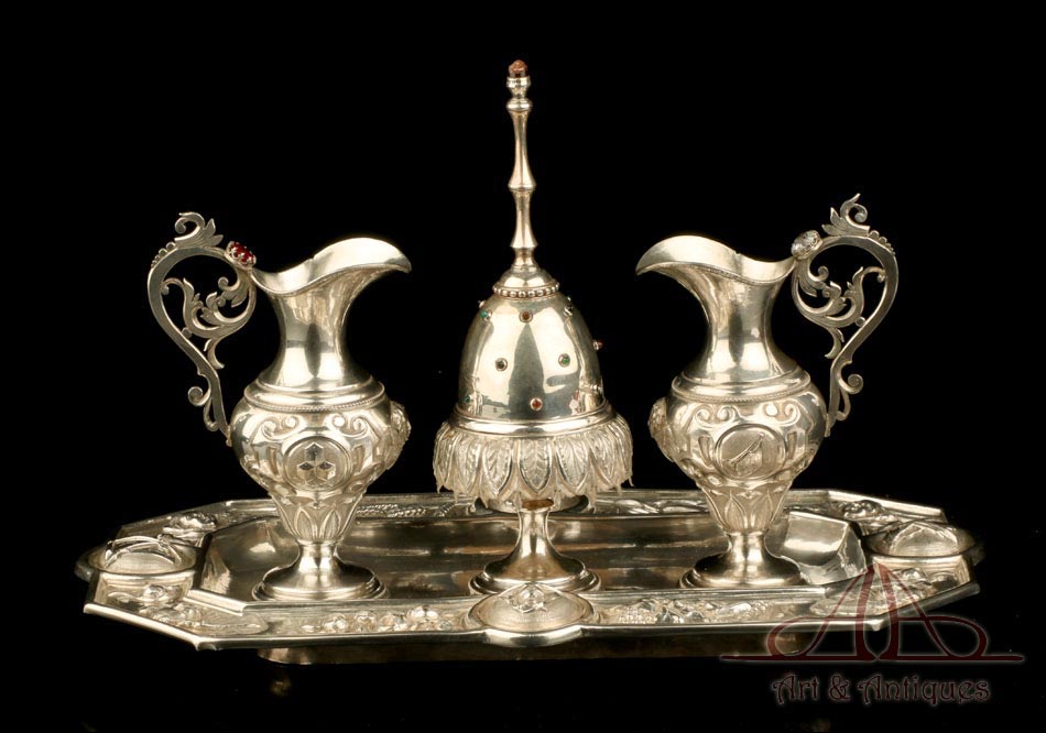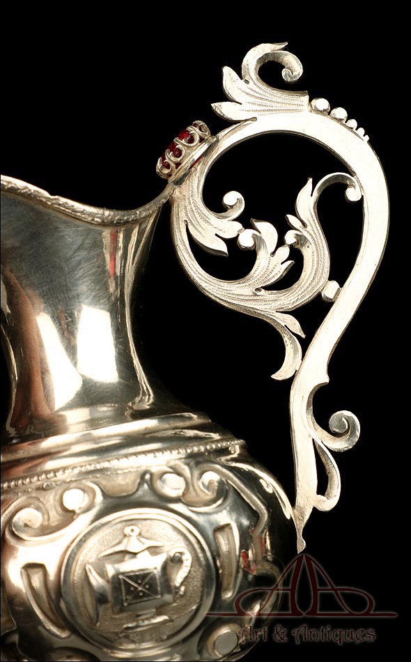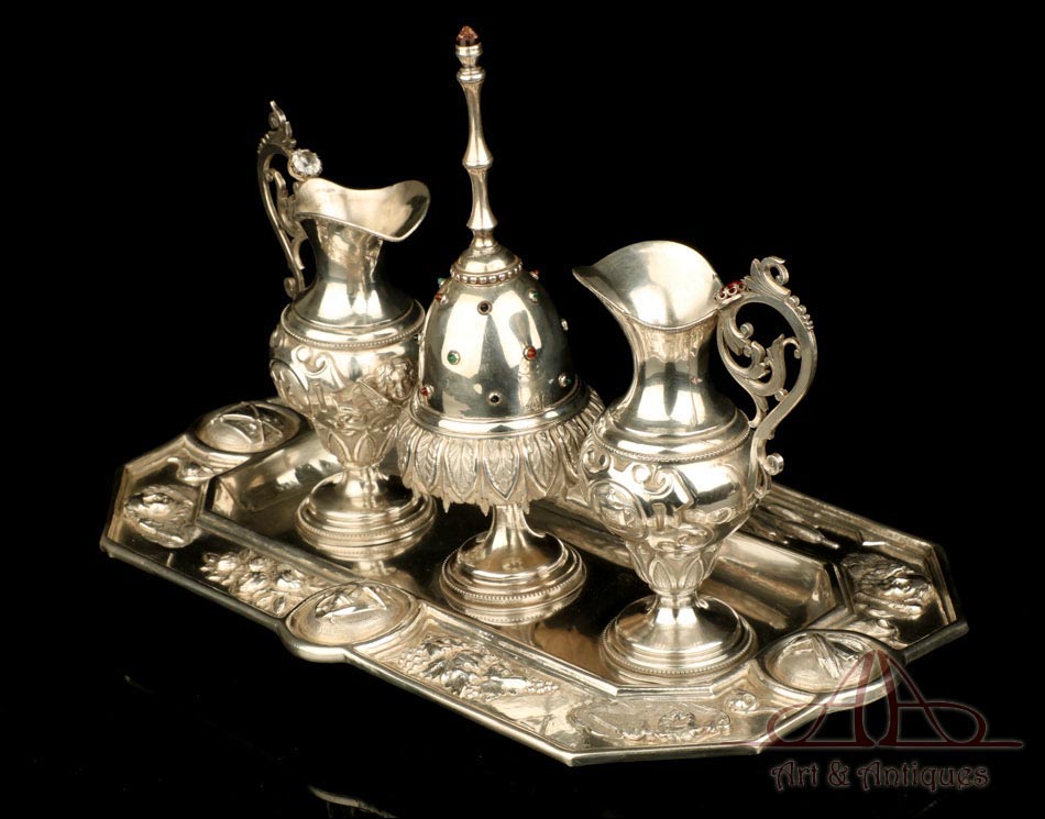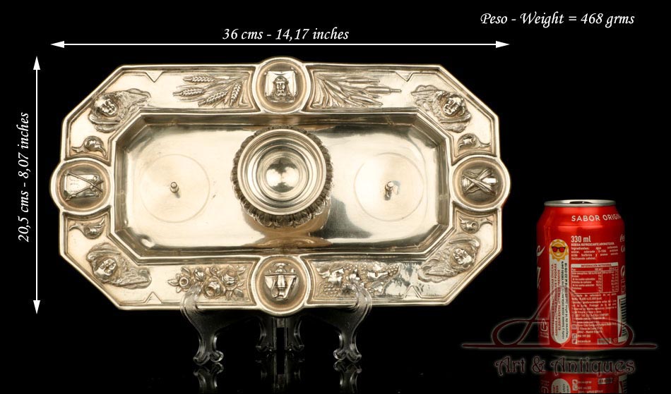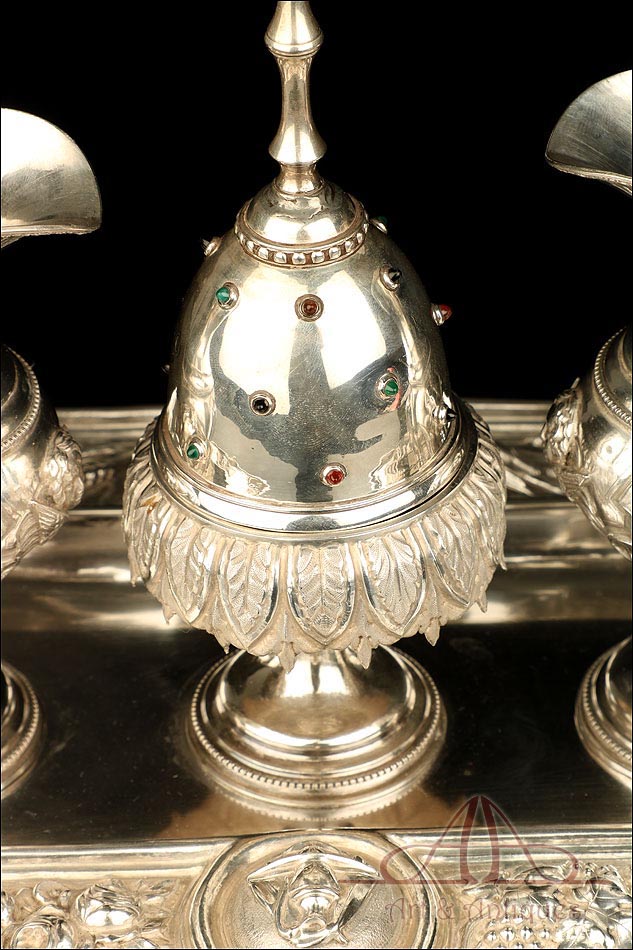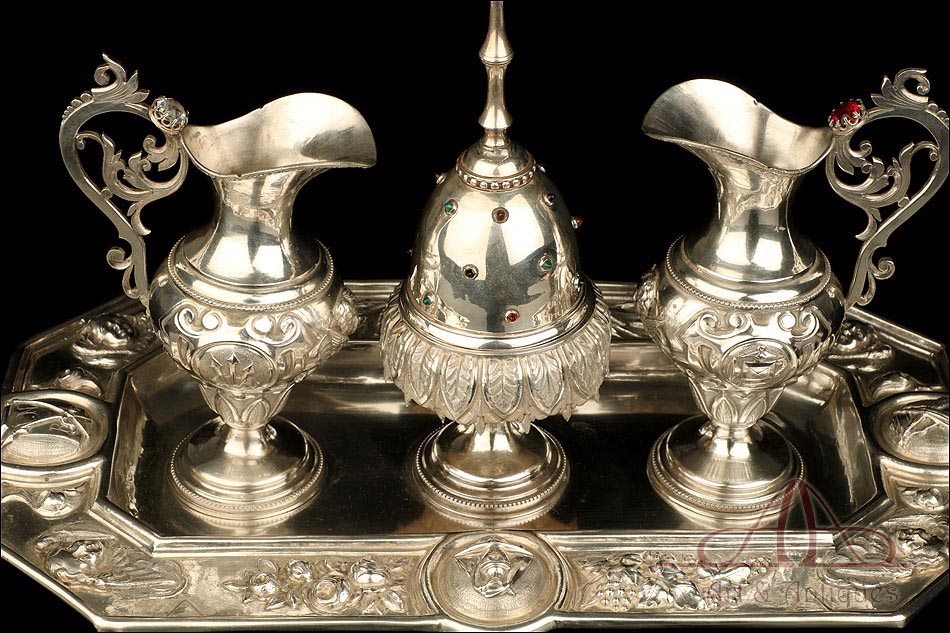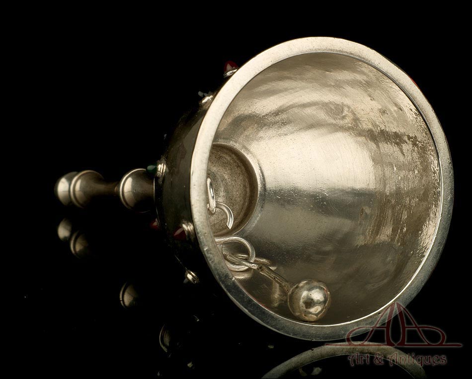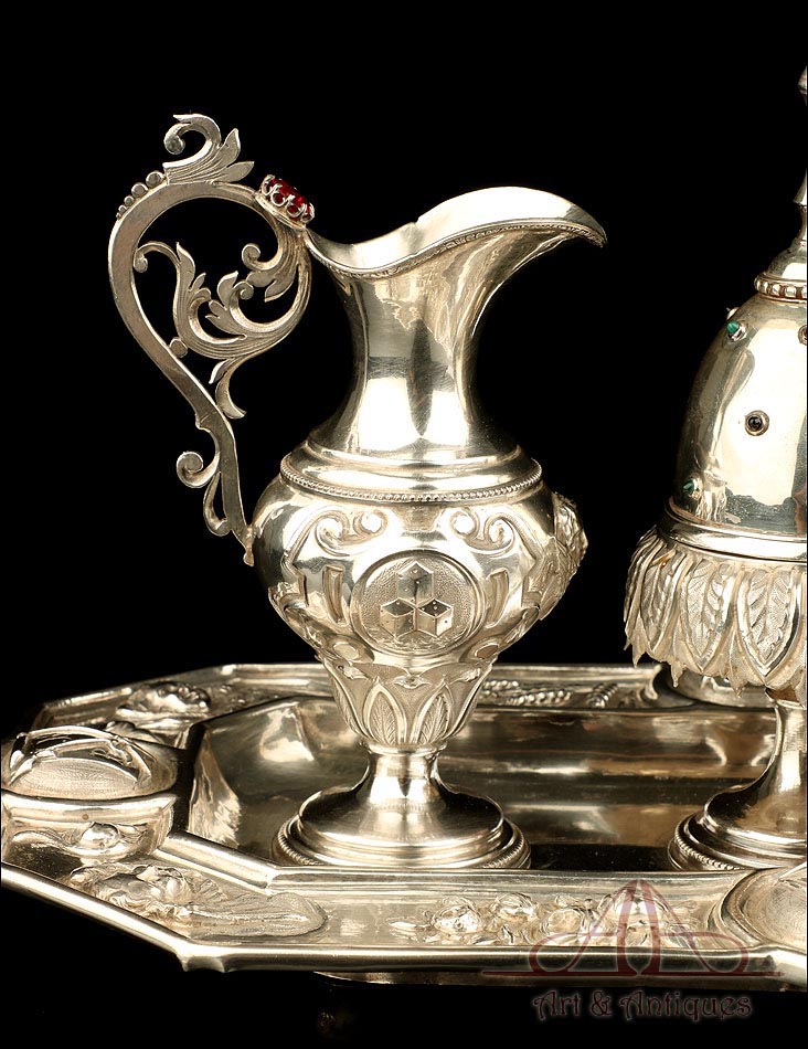 Rarísimo modelo de vinajeras litúrgicas antiguas con campanilla en plata maciza, fabricado en Barcelona en el siglo XIX. Se trata de un artículo realmente especial, ya que este tipo de conjuntos son muy difíciles de encontrar. De tamaño grande, las vinajeras llaman la atención por su cuidado diseño y su decoración. La campanilla que las acompaña no es la original, sino que fue añadida posteriormente; es también de plata maciza y está decorada con diminutos cristales de colores dispuestos ordenadamente en toda su superficie. La combinación de la plata y el cristal crea una pieza con gran encanto, hermosa y delicada. El conjunto se asienta sobre una bandeja en cuya cara inferior encontramos los contrastes de la ciudad de Barcelona y de la época (fines del siglo XIX).