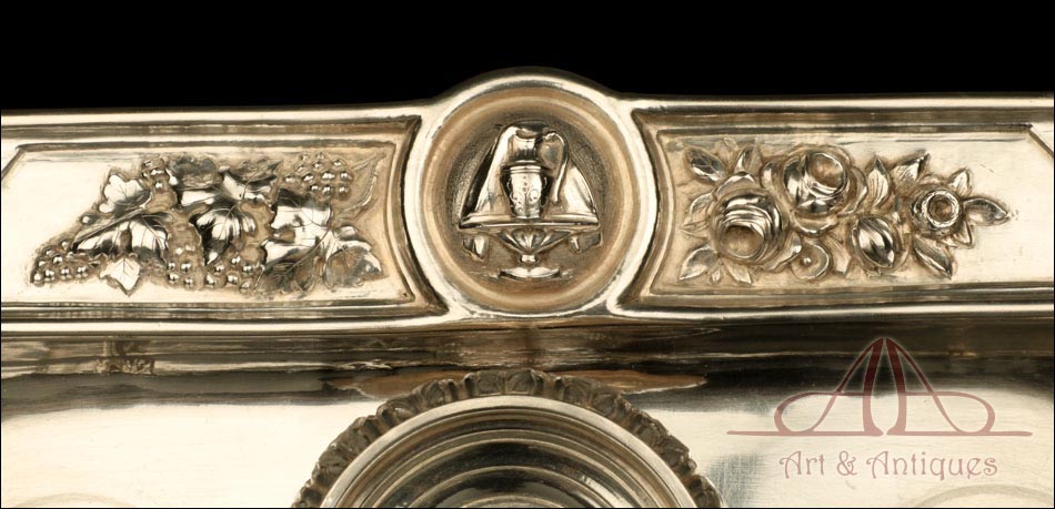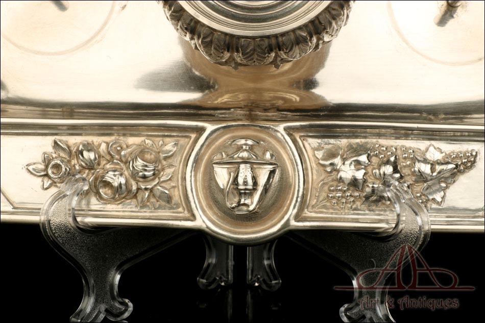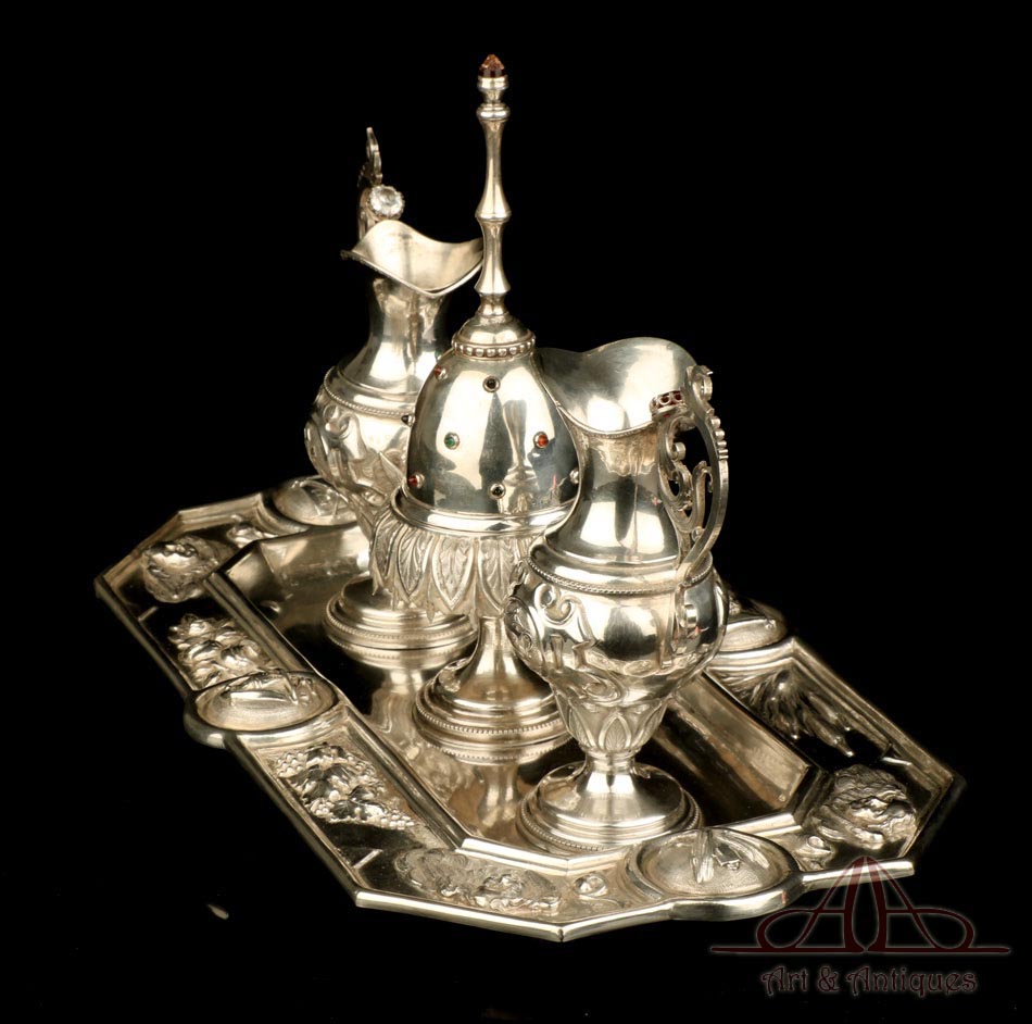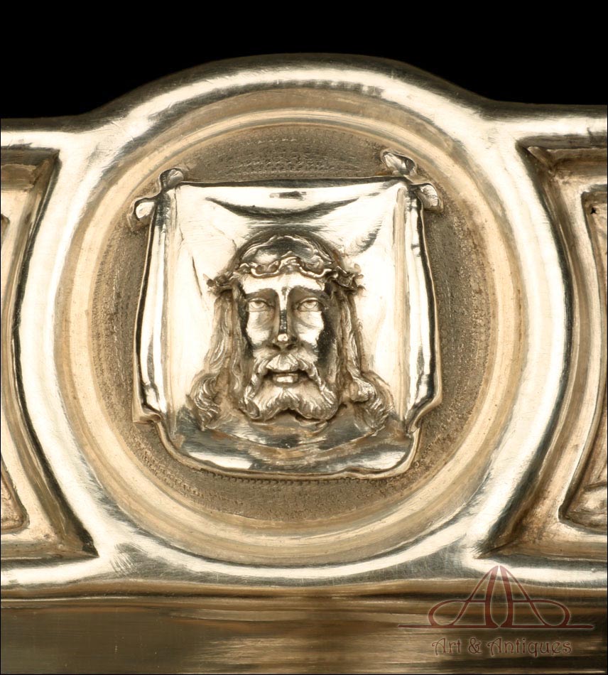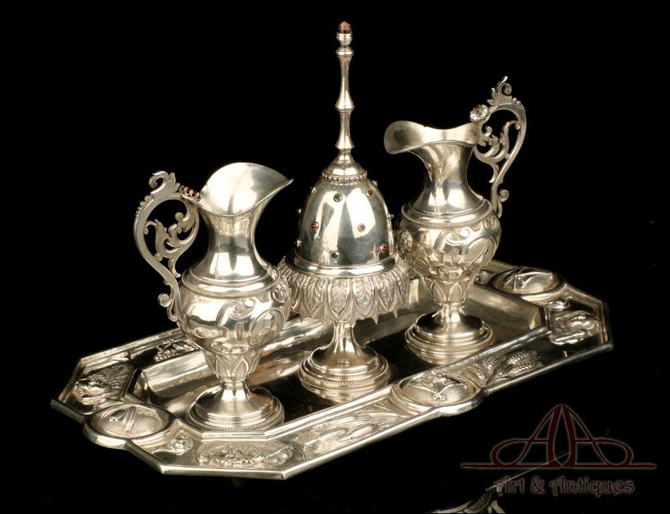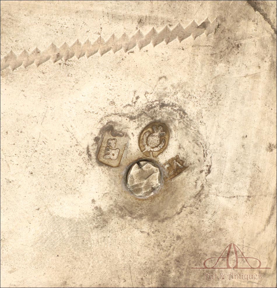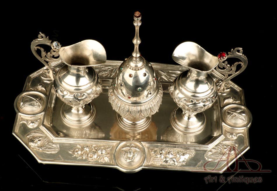 Rarísimo modelo de vinajeras litúrgicas antiguas con campanilla en plata maciza, fabricado en Barcelona en el siglo XIX. Se trata de un artículo realmente especial, ya que este tipo de conjuntos son muy difíciles de encontrar. De tamaño grande, las vinajeras llaman la atención por su cuidado diseño y su decoración. La campanilla que las acompaña no es la original, sino que fue añadida posteriormente; es también de plata maciza y está decorada con diminutos cristales de colores dispuestos ordenadamente en toda su superficie. La combinación de la plata y el cristal crea una pieza con gran encanto, hermosa y delicada. El conjunto se asienta sobre una bandeja en cuya cara inferior encontramos los contrastes de la ciudad de Barcelona y de la época (fines del siglo XIX).