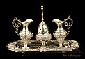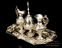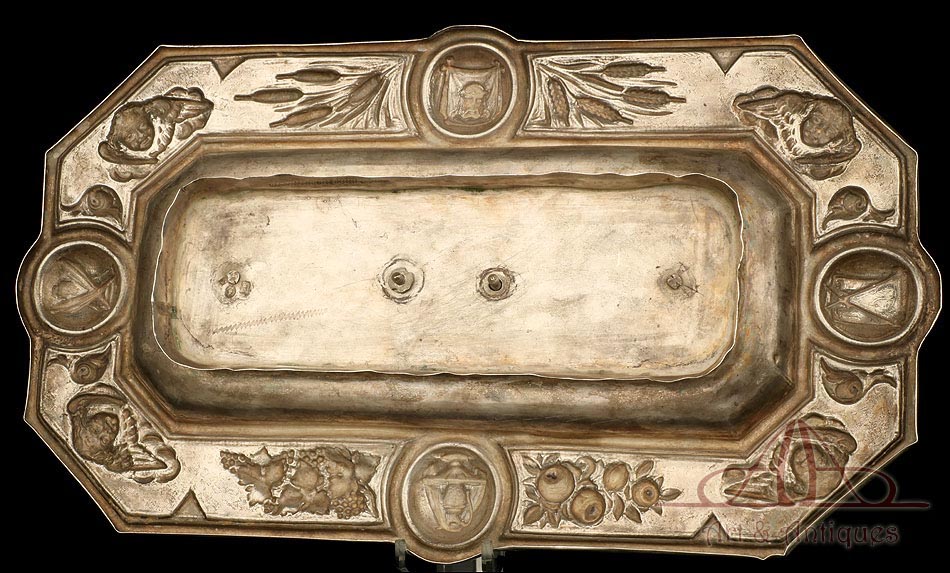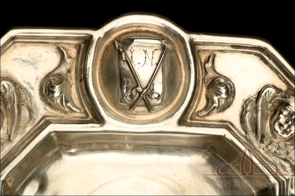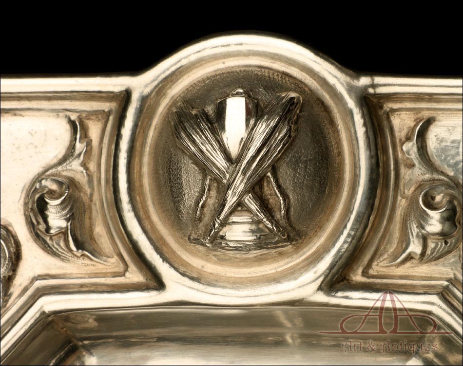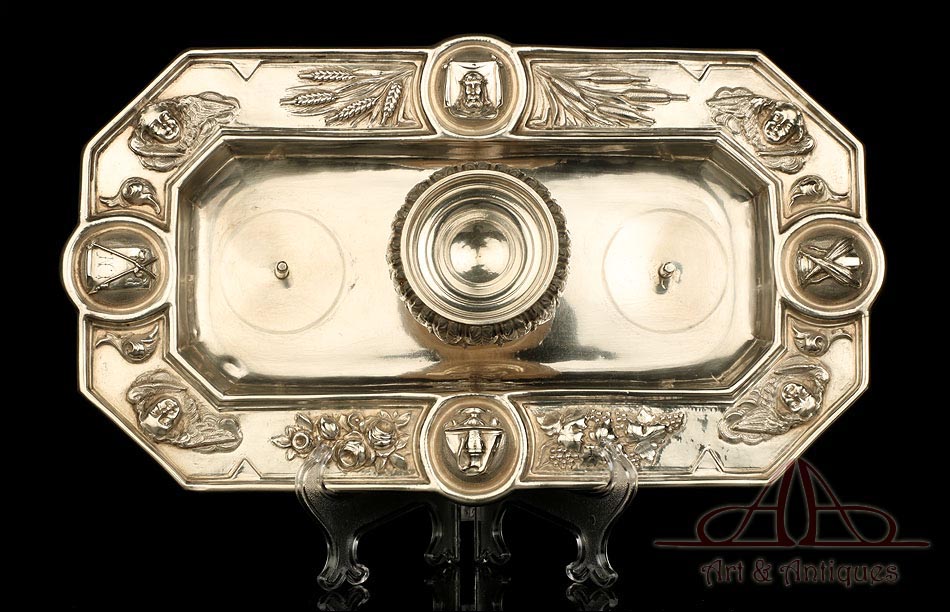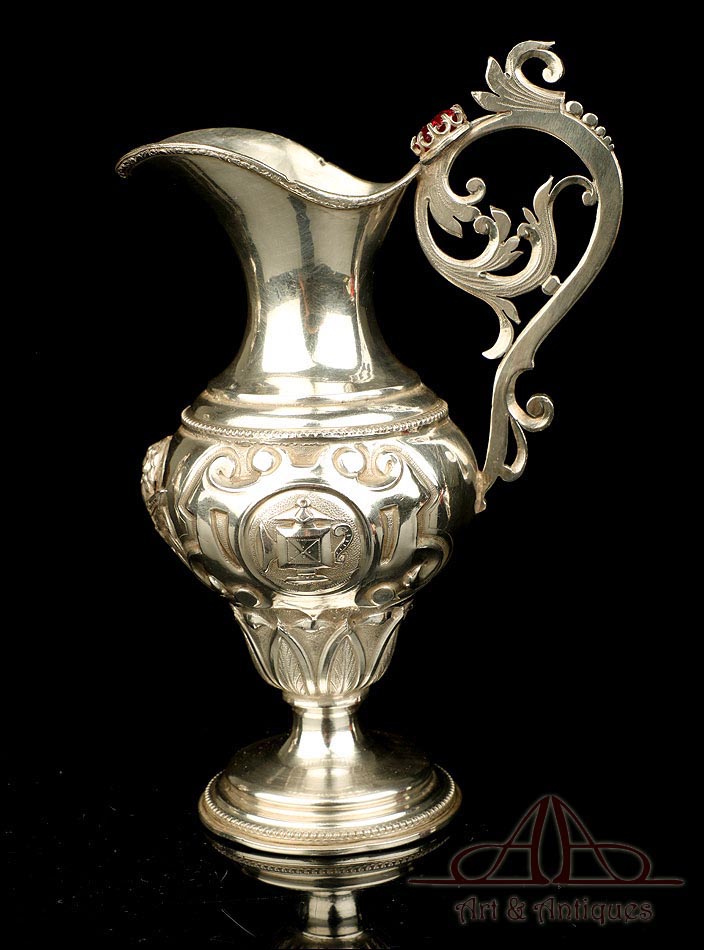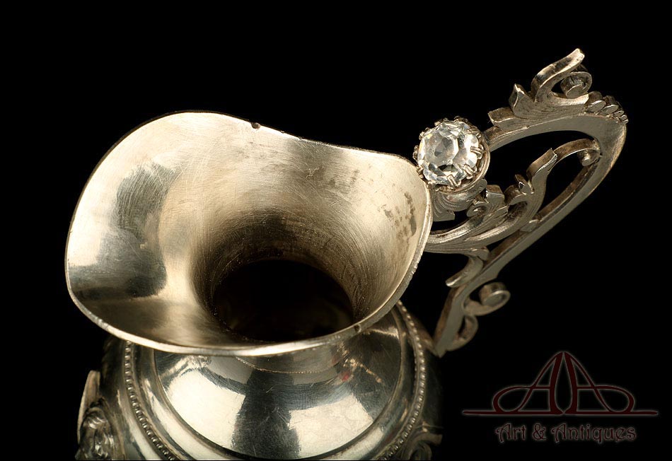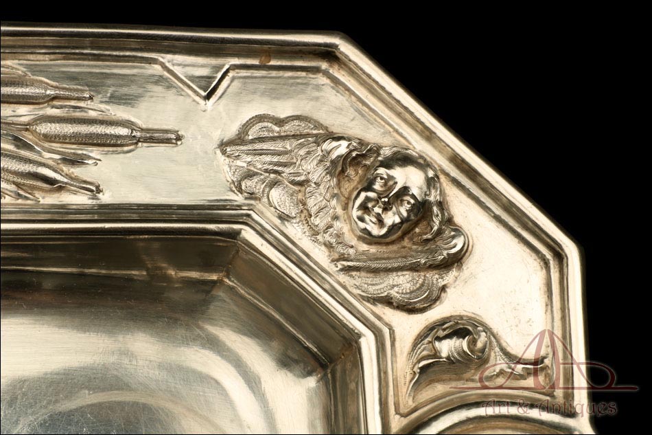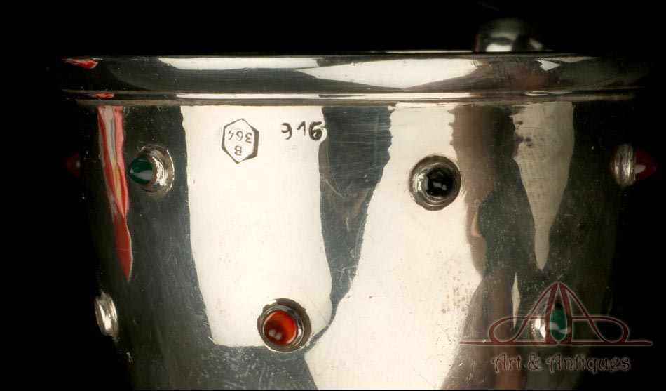 Rarísimo modelo de vinajeras litúrgicas antiguas con campanilla en plata maciza, fabricado en Barcelona en el siglo XIX. Se trata de un artículo realmente especial, ya que este tipo de conjuntos son muy difíciles de encontrar. De tamaño grande, las vinajeras llaman la atención por su cuidado diseño y su decoración. La campanilla que las acompaña no es la original, sino que fue añadida posteriormente; es también de plata maciza y está decorada con diminutos cristales de colores dispuestos ordenadamente en toda su superficie. La combinación de la plata y el cristal crea una pieza con gran encanto, hermosa y delicada. El conjunto se asienta sobre una bandeja en cuya cara inferior encontramos los contrastes de la ciudad de Barcelona y de la época (fines del siglo XIX).