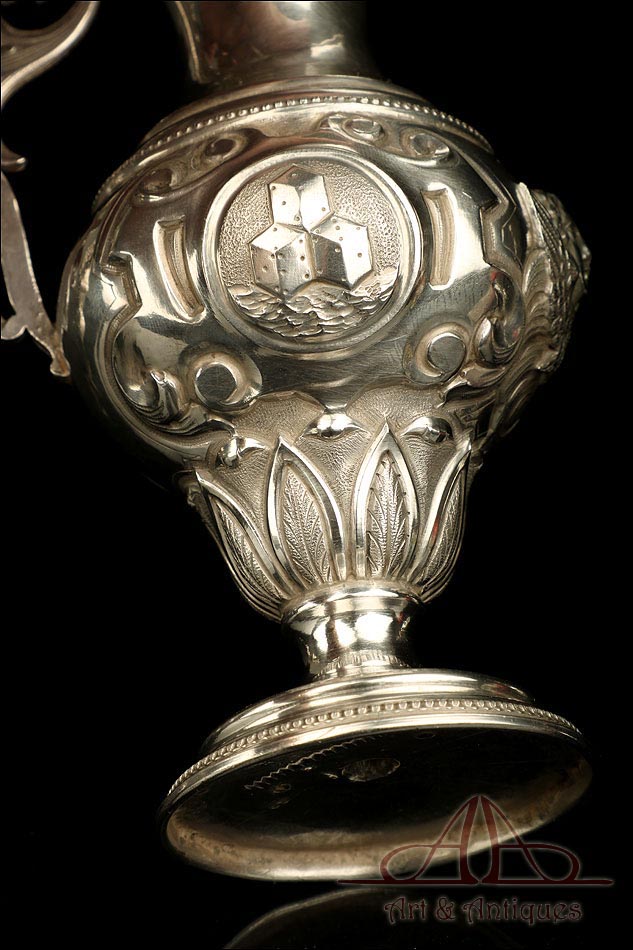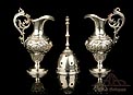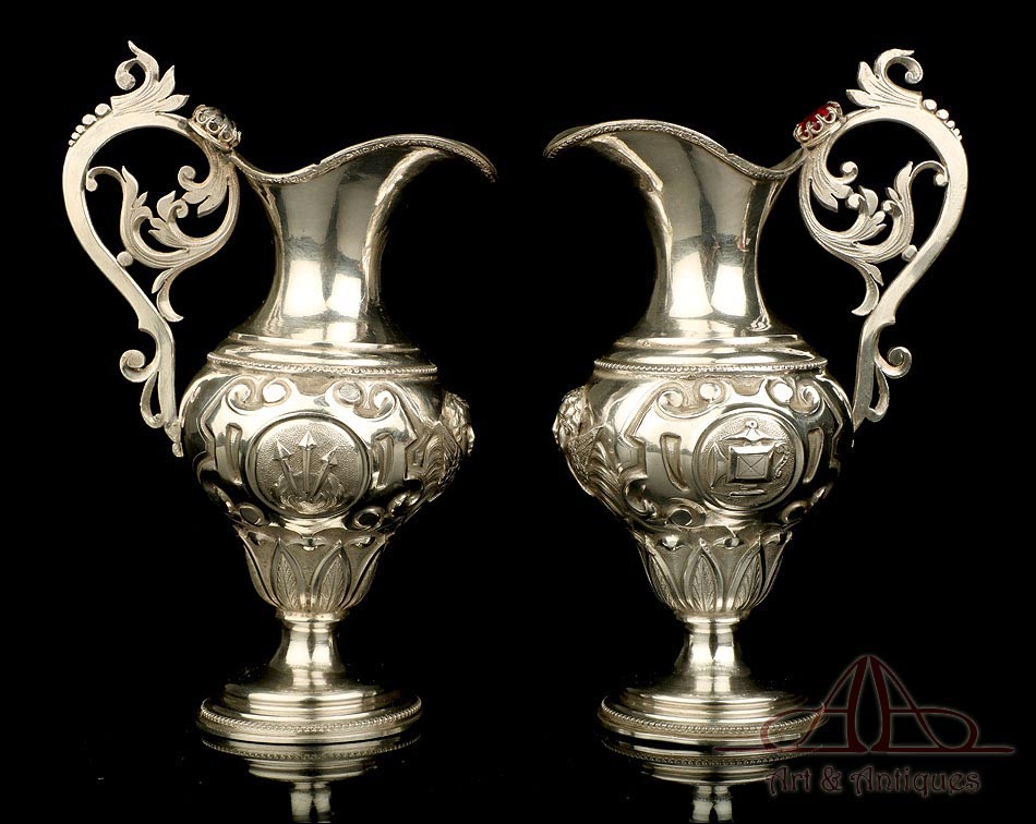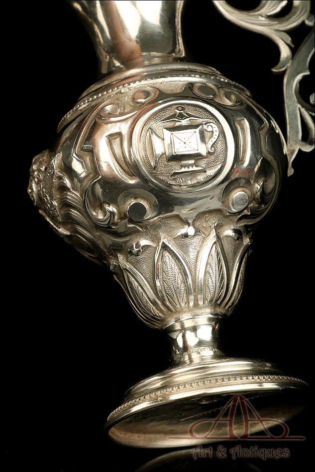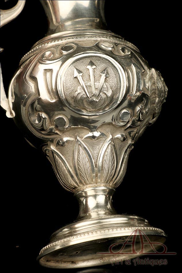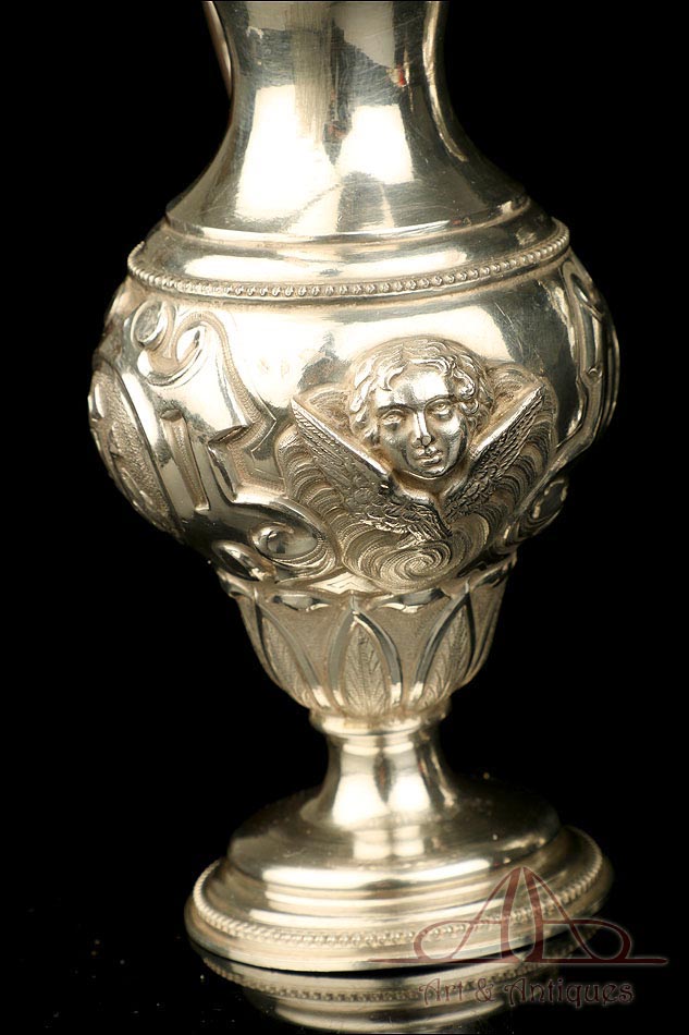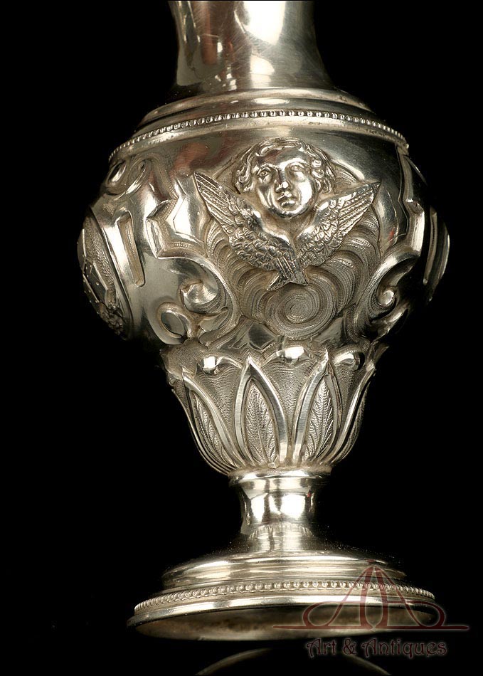 Los amantes de la platería religiosa sabrán apreciar la belleza y originalidad de este rarísimo modelo de vinajeras litúrgicas antiguas con campanilla en plata maciza.