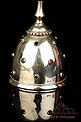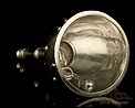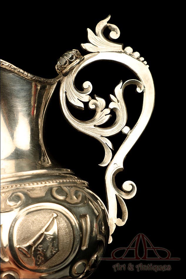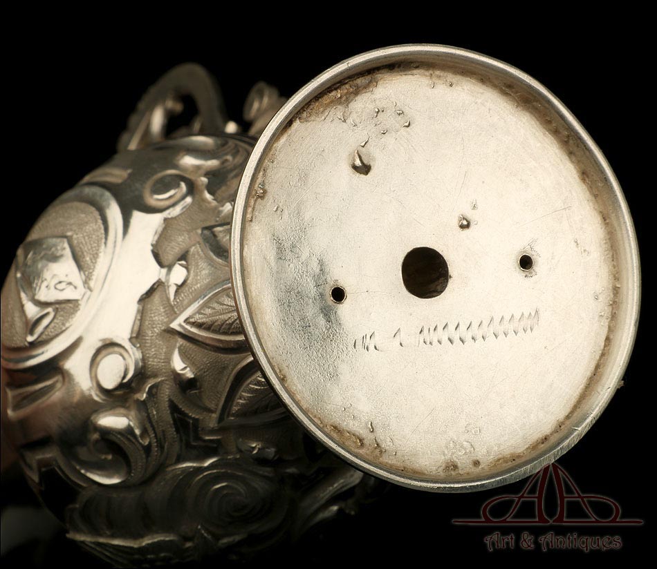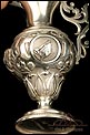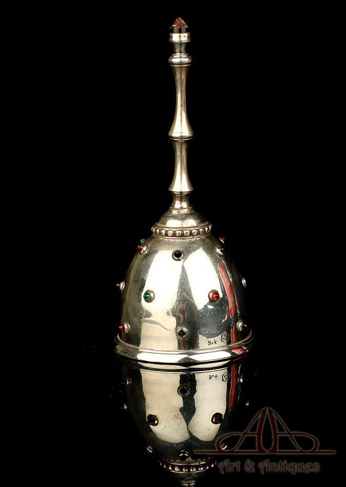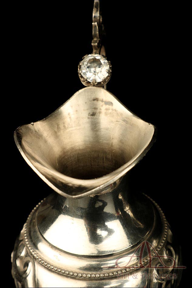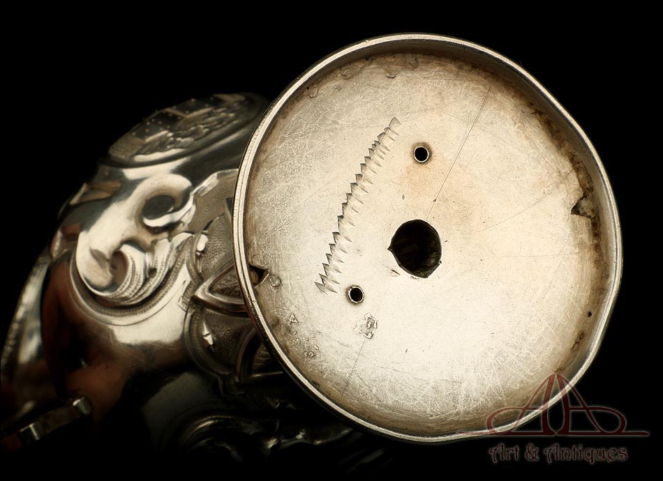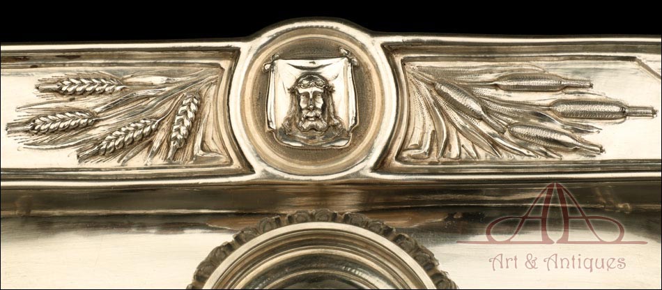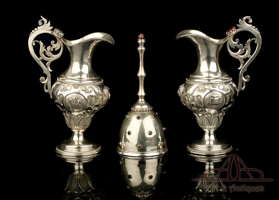 Los amantes de la platería religiosa sabrán apreciar la belleza y originalidad de este rarísimo modelo de vinajeras litúrgicas antiguas con campanilla en plata maciza.