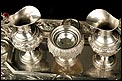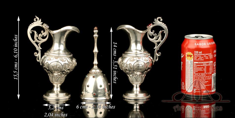 Medidas: Vinajeras: Ancho de la Base: 5,2 cm. Altura: 15,5 cm. Campanilla: Ancho: 6 cm. Altura: 14 cm.