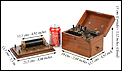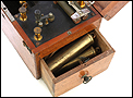 Si abrimos la caja, en su interior encontraremos una placa de color negro con múltiples elementos y mecanismos montados sobre su superficie. Podemos ver piezas de latón y metal plateado, y pomos y tiradores de madera negra. El cajón lateral, por su parte, contiene cables y dos cilindros de latón para aplicar las corrientes. Además de la caja, este aparato también consta de una base de madera de haya con una bobina de inducción sobre ella. La base lleva montados varias piezas de latón y está marcada con una serie de letras negras, impresas sobre fondo blanco.