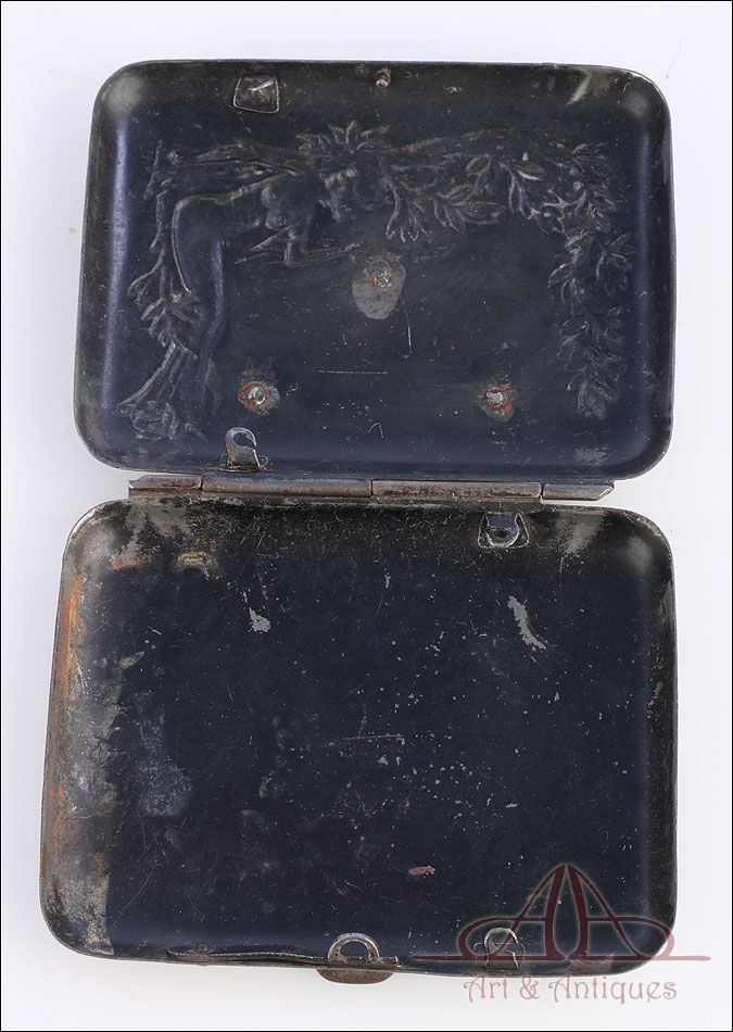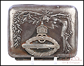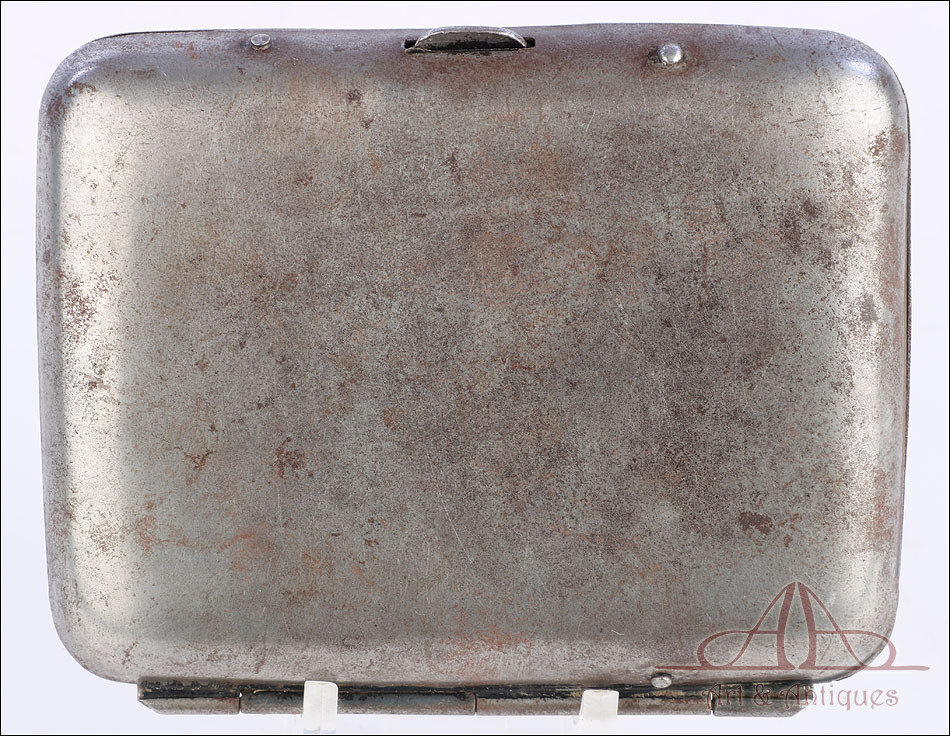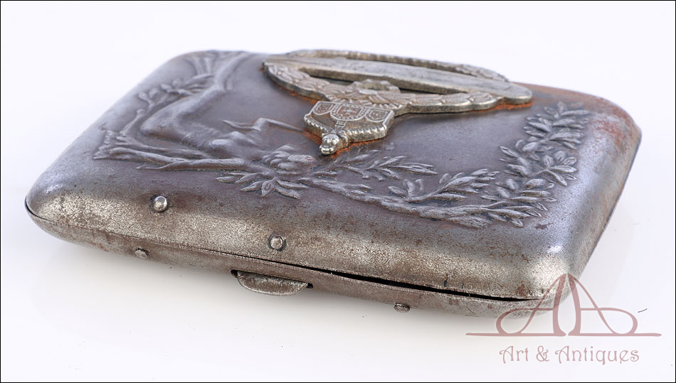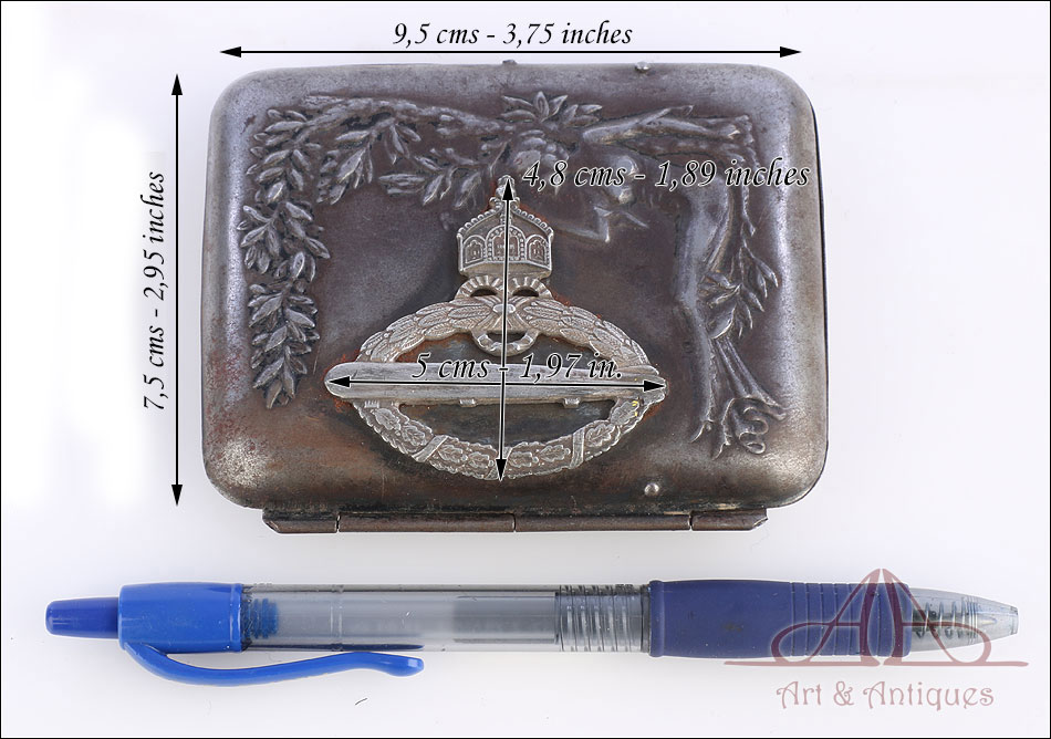 Muy rara insignia de tripulante de zepelines de la Marina Imperial Alemana, fabricada en Alemania durante la 1ª GM. La insignia aparece engastada en una pitillera de los años 20 con decoración modernista en relieve. Es muy posible que el dueño la engastara en la pitillera después de la guerra, para poderla conservar y utilizar en tiempos de paz. Se trata de una pieza de metal formada por una corona de laurel y de hojas de roble, con una corona encima y un zepelín en el centro. Es una insignia muy difícil de encontrar y rara, perfecta para formar parte de una buena colección.