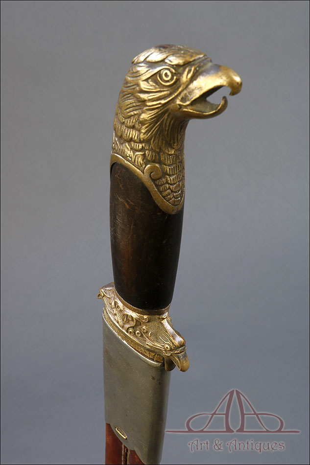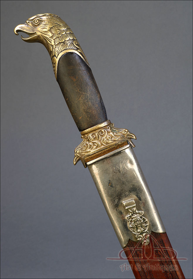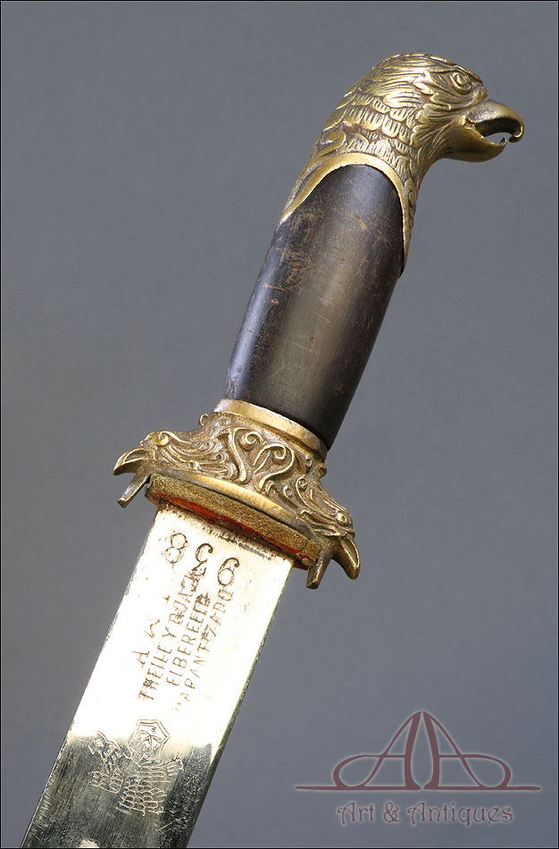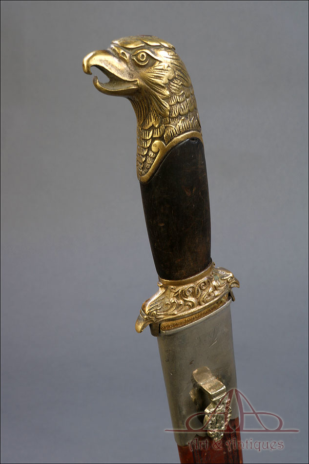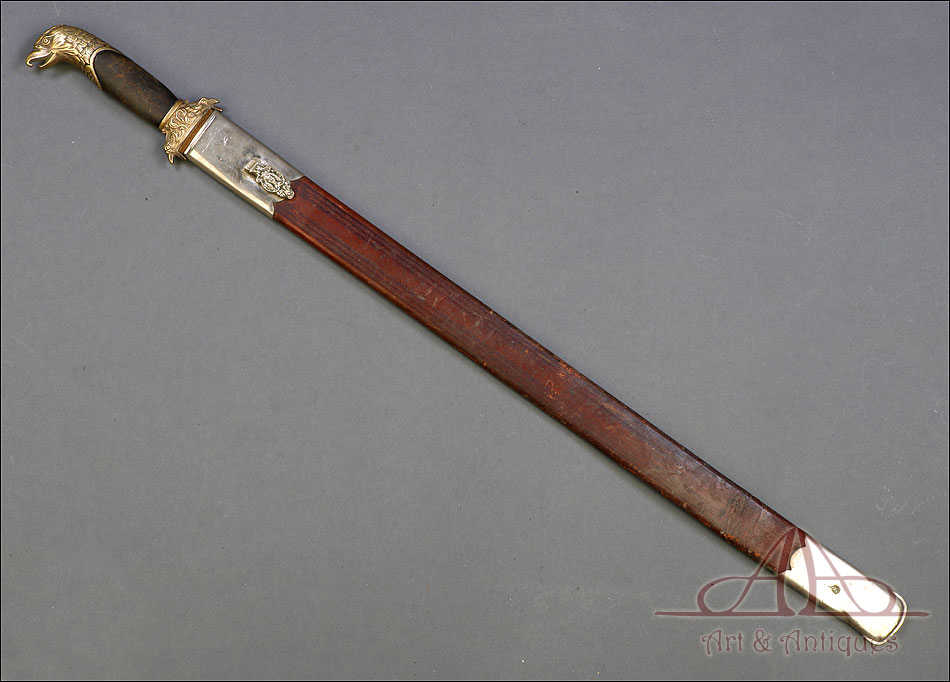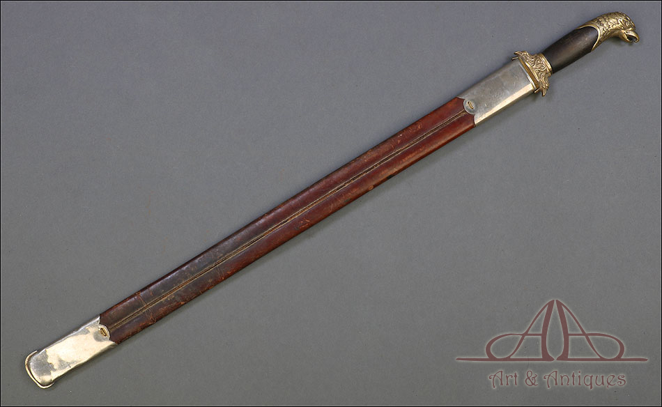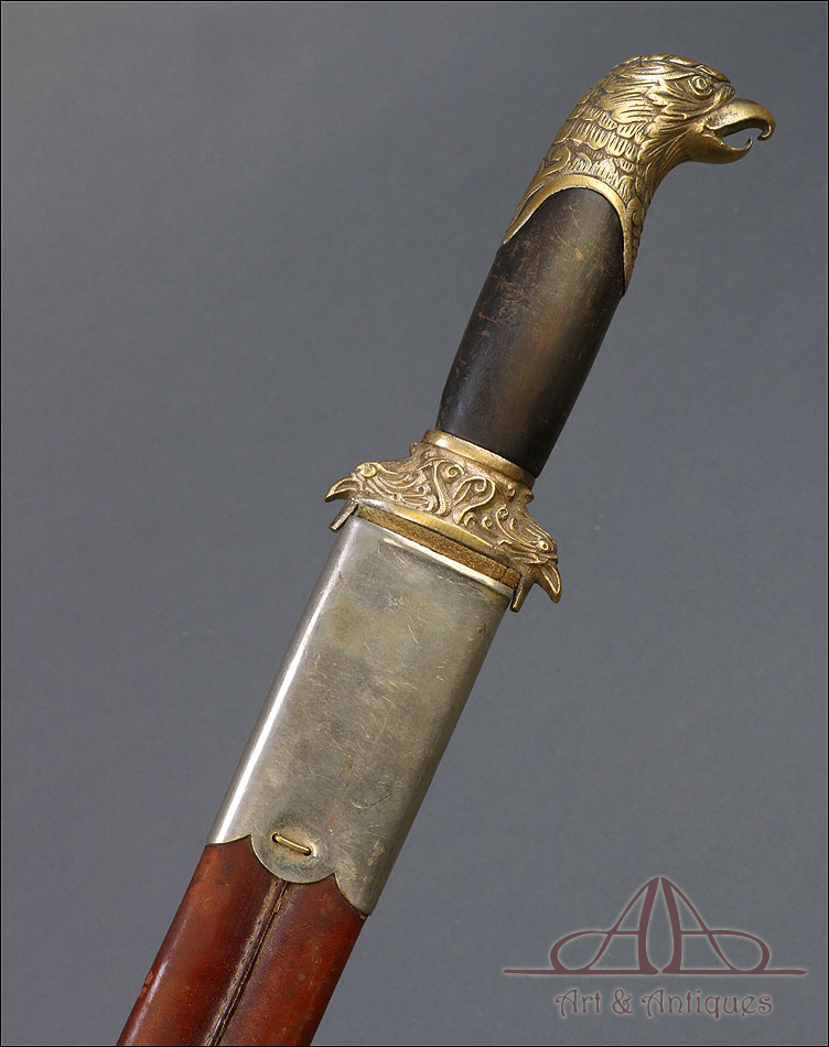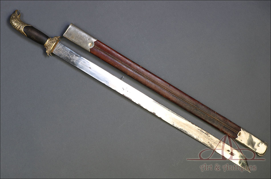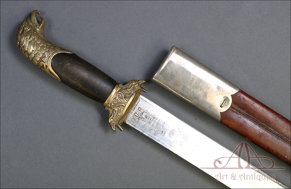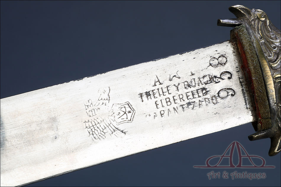 Fantástico machete cubano para oficial de infantería español en Cuba, fabricado en 1890 y en buen estado de conservación. Esta histórica pieza fue fabricada en Alemania; por aquel entonces, algunos fabricantes de armas alemanes forjaban este tipo de armas para su exportación al ejército español en Cuba. El machete consta de una temible hoja de acero (probablemente niquelada en época posterior), en cuya parte superior podemos ver el nombre del fabricante y la localidad alemana donde se encontraba grabados en el metal: THEILE Y QUACK – ELBERFELD – GARANTIZADO, así como el número 938. El machete lleva empuñadura de madera y bronce, con pomo y cruz en forma de cabeza de águila y puño de madera oscura. La vaina que protege la hoja es original de la época y está fabricada en cuero repujado, con boquilla y batiente de acero.