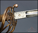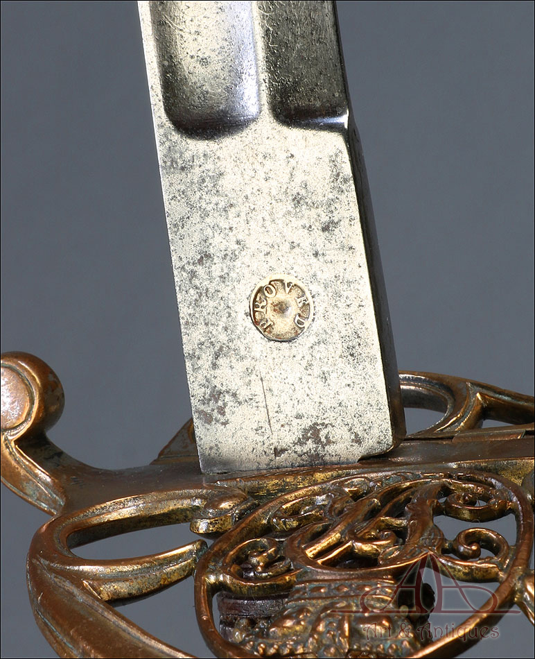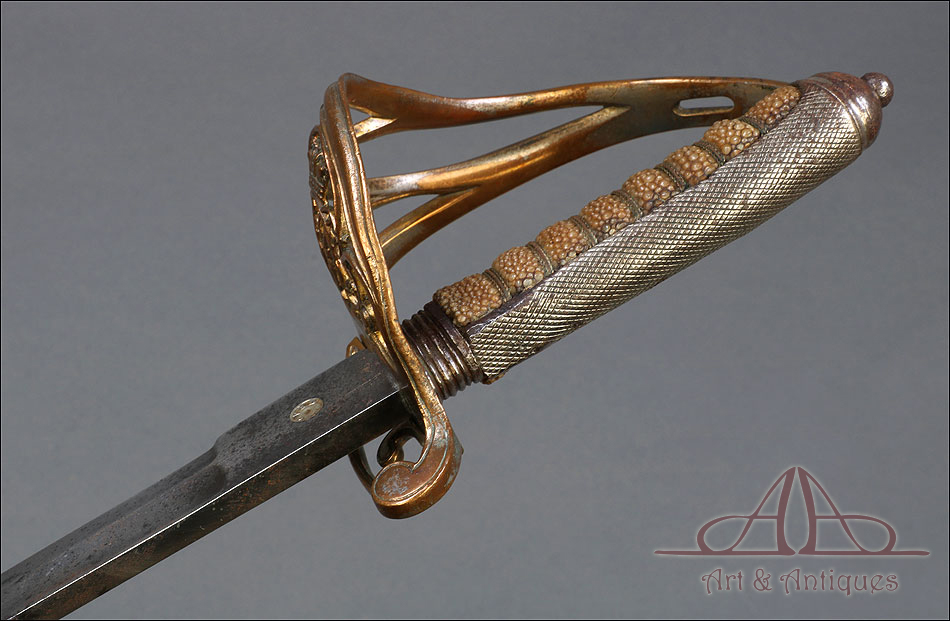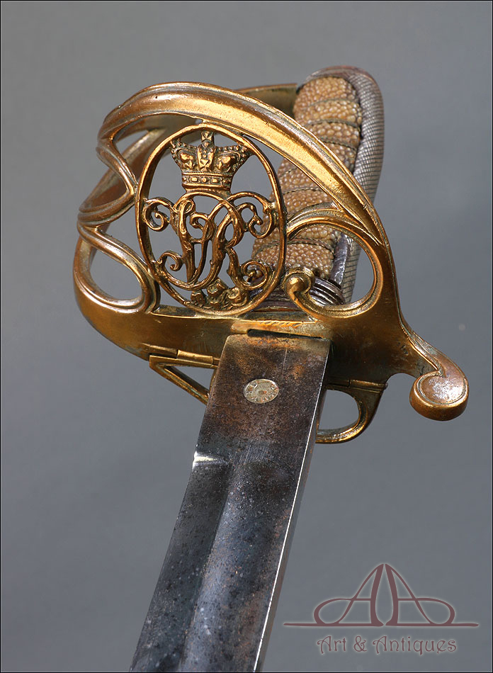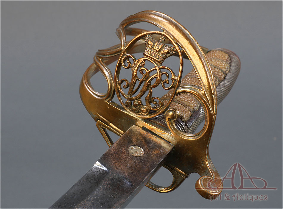 Antigua espada de oficial de infantería británica mod. 1822, en buen estado de conservación y de época victoriana. La espada lleva hoja de acero y empuñadura de metal dorada, ambas con un diseño elegante y atractivo. La hoja tiene grabado un sello circular cerca de la cruz, con la inscripción PROVED. La empuñadura lleva puño revestido de una pasta o resina de color ámbar, con superficie rugosa para facilitar el agarre. Conserva el torzal de época en buenas condiciones. El guardamano de metal dorado lleva cazoleta en celosía con las iniciales VR, con una imagen de la corona real encima. La espada es una pieza exclusiva, llena de encanto y de gran potencial decorativo.