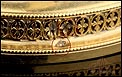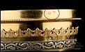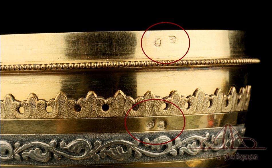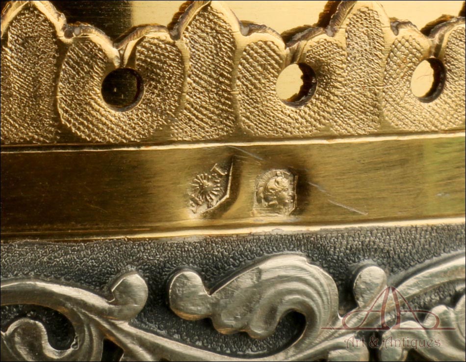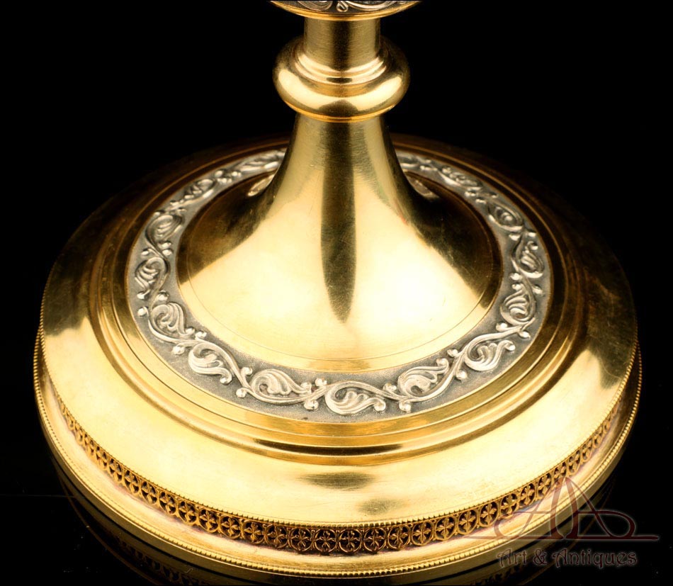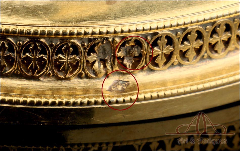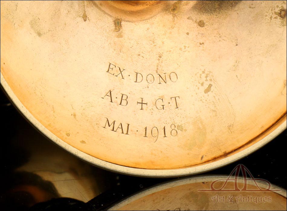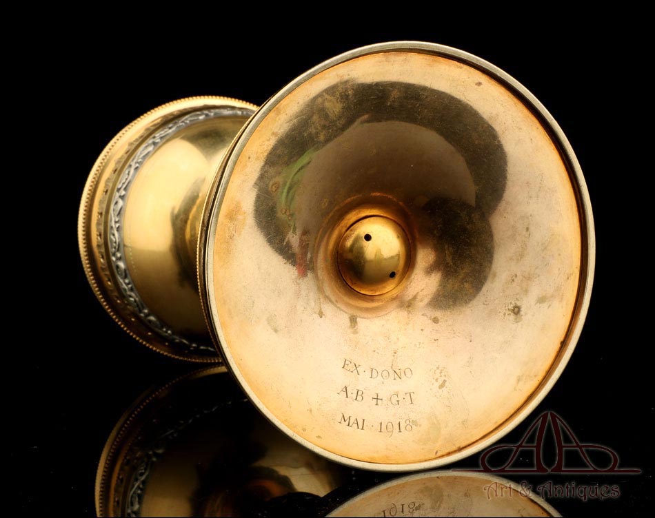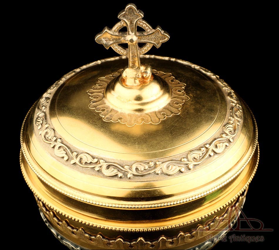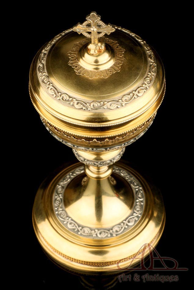 Hermoso copón antiguo en plata dorada maciza realizado en Francia en el siglo XIX, en excelente estado de conservación y de imponente presencia. Este copón lleva una inscripción grabada a mano en el interior de la base: EX DONO AB + GT MAY 1918. Es muy posible que fuera donado a alguna iglesia en la fecha indicada. En el borde de la copa y en la base encontramos también el contraste de la plata y el sello del platero, con sus iniciales. El copón tiene base circular, con una cenefa de plata sin dorar y un borde de cruces grabadas como única decoración. La cenefa está formada por volutas encadenadas y es sencilla y elegante. Este detalle está presente también en el nudo principal, la sobrecopa y la tapa. La combinación de la plata lisa y dorada aporta interés y atractivo a esta pieza, creando un diseño tan sobrio como especial.
