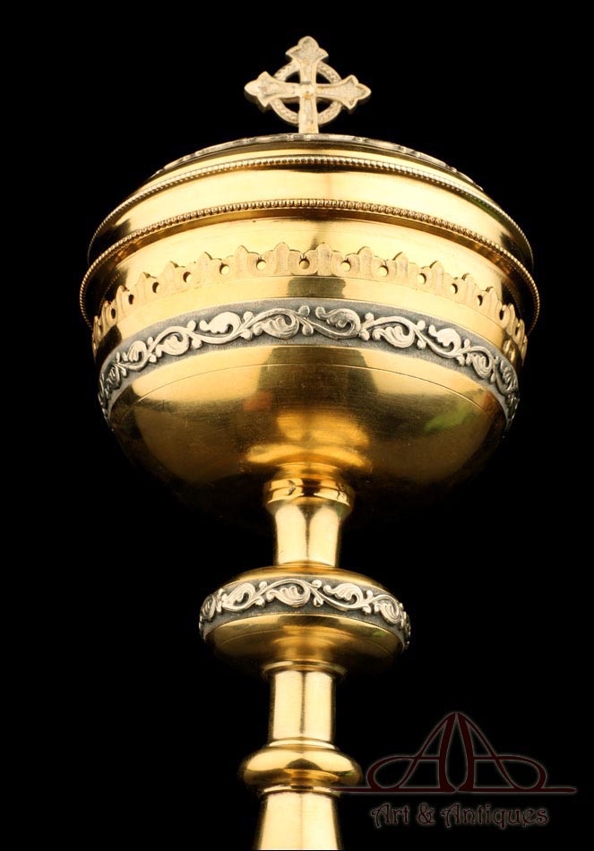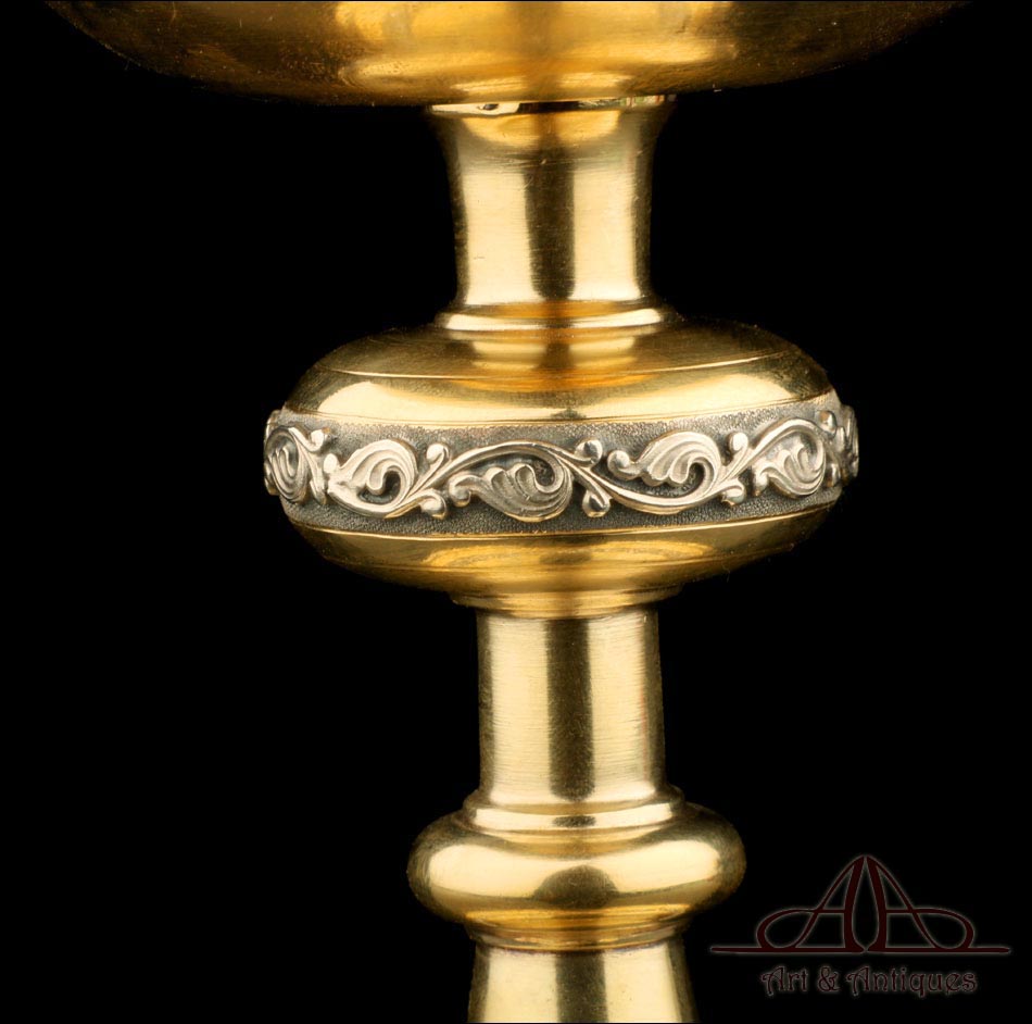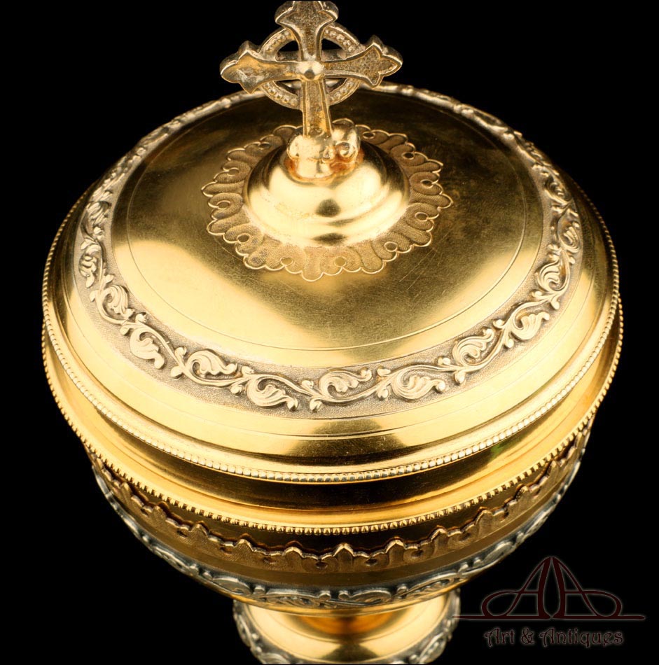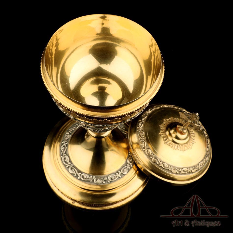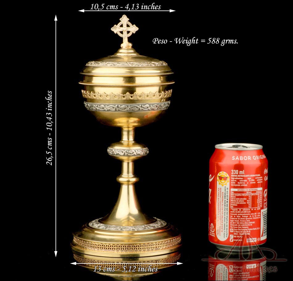 Este copón antiguo en plata dorada es un artículo exclusivo, muy bello y con más de cien años de antigüedad. Una pieza muy especial para coleccionistas y amantes de la platería religiosa.