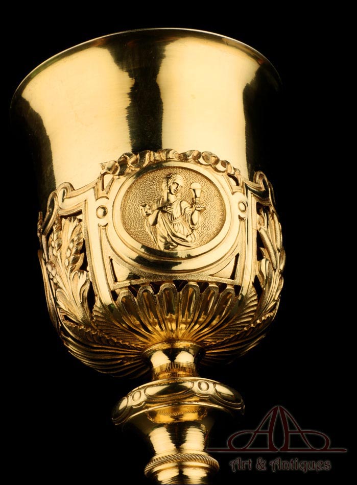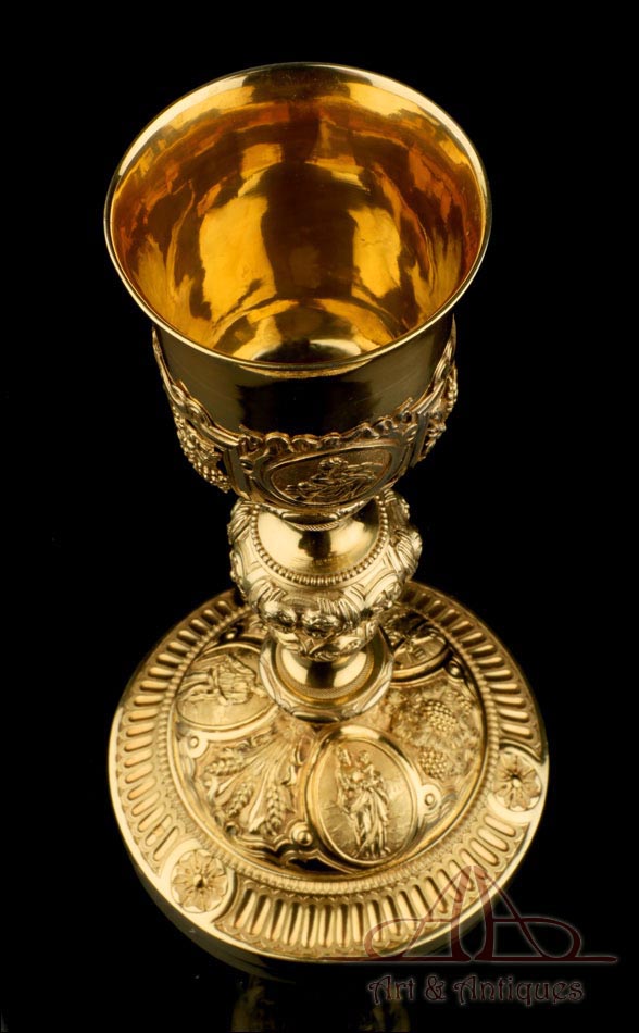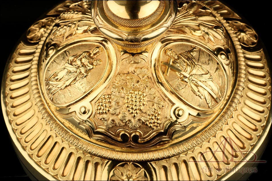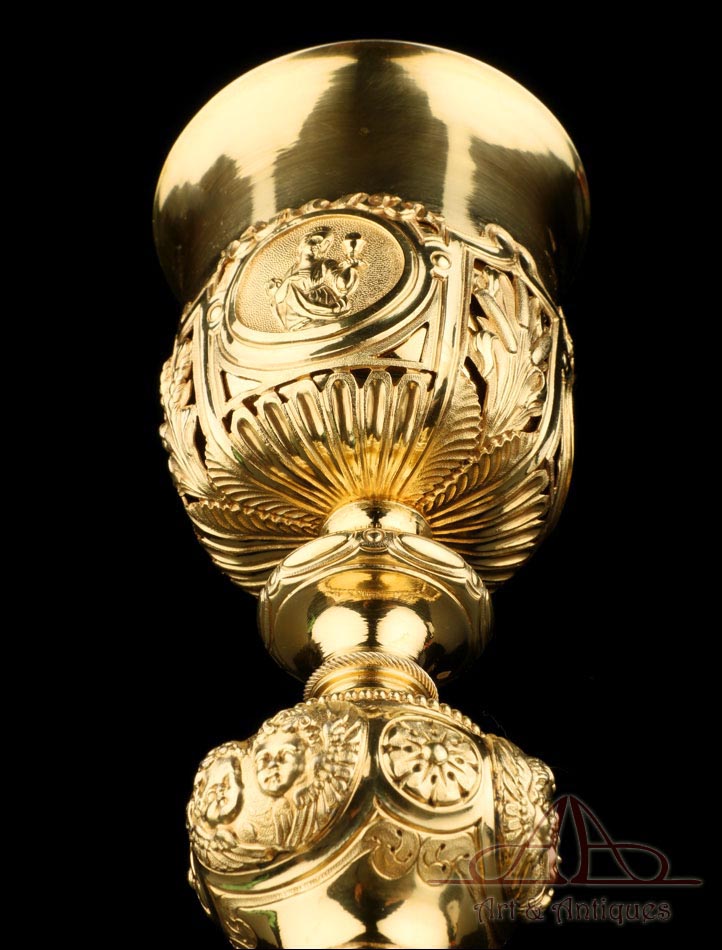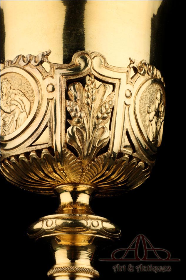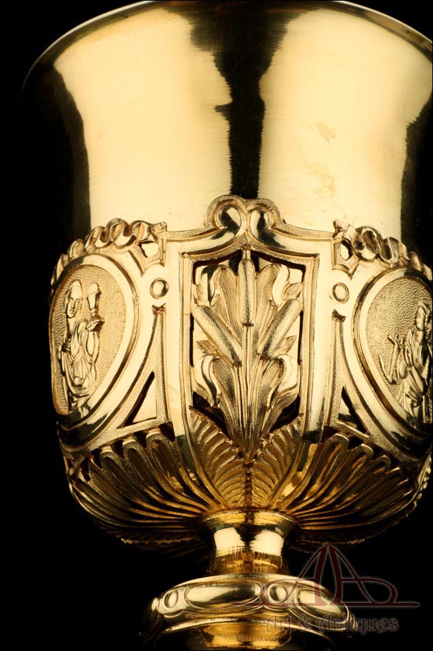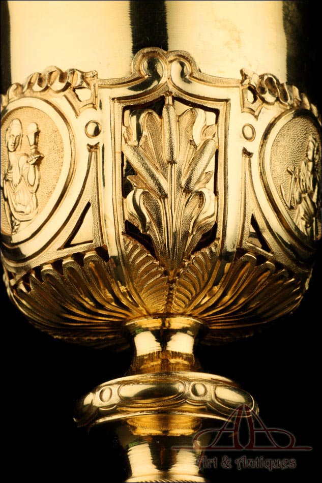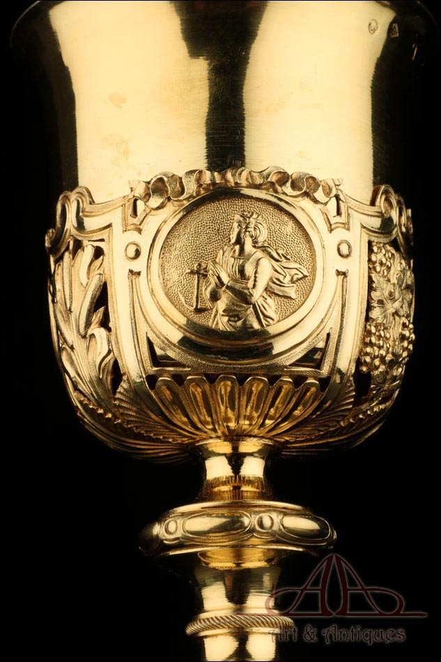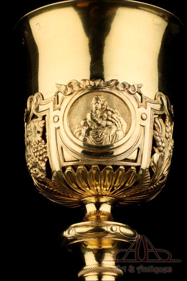 Fantástico cáliz antiguo en plata maciza dorada realizado en Francia en 1820 y en excelente estado de conservación. Se trata de una pieza muy hermosa, que destaca por preciosa decoración figurativa realizada a mano. El cáliz lleva una amplia base circular con profusión de motivos grabados y en relieve. Podemos ver tres medallones ovalados con figuras de cuerpo entero que representan a Jesucristo con la cruz, a San José y a la Virgen María con el Niño. En el tallo, el nudo principal está decorado con cabezas de querubines y motivos florales. La sobrecopa, por su parte, lleva tres pequeños medallones circulares con figuras femeninas representadas en tres cuartos. Las figuras son las tres Virtudes Teologales: la Fe, la Esperanza y la Caridad. Los medallones están separados por tres símbolos clásicos de la liturgia cristiana: los racimos de uva, las espigas de trigo y los juncos. Todas las partes del cáliz llevan contrastes que identifican la plata de París y el sello del platero.