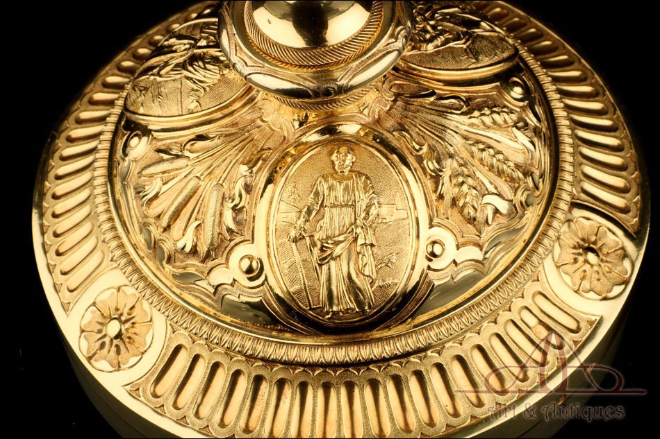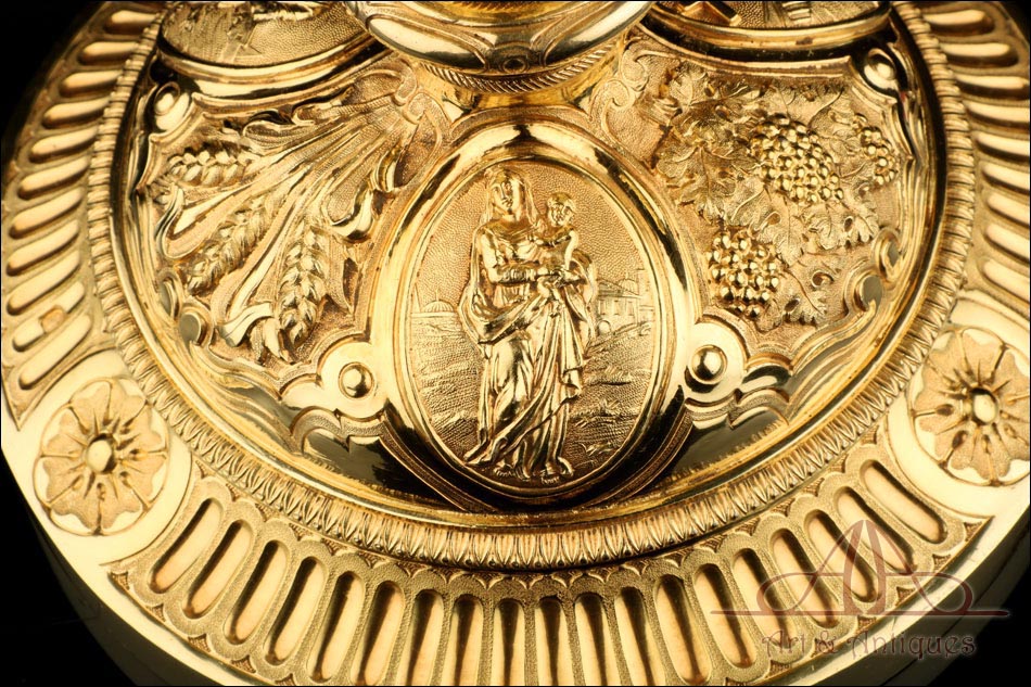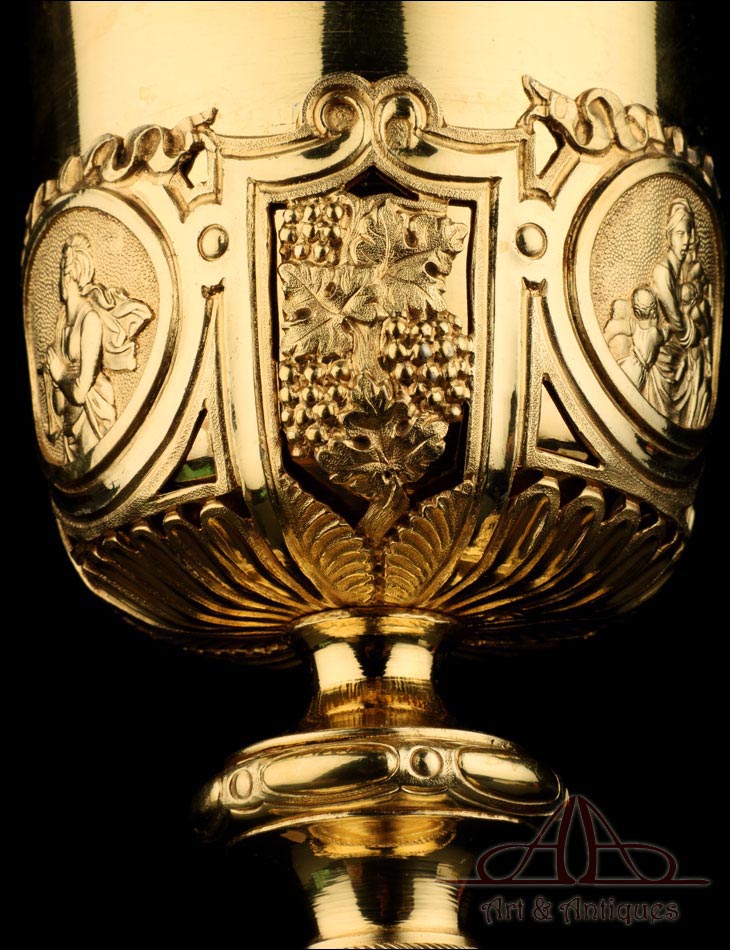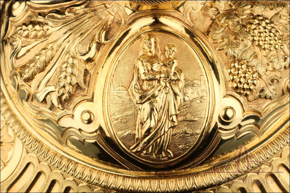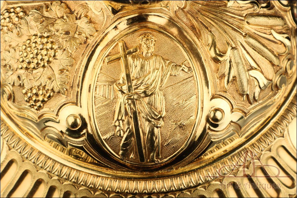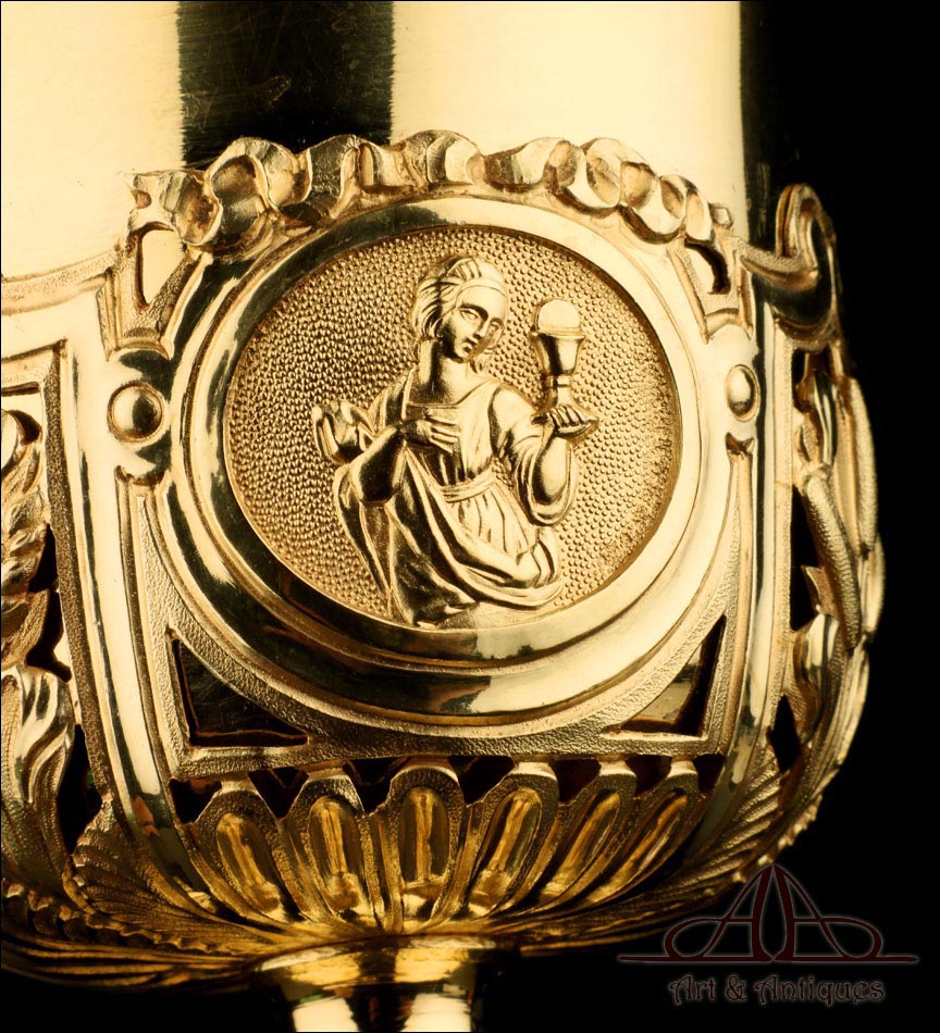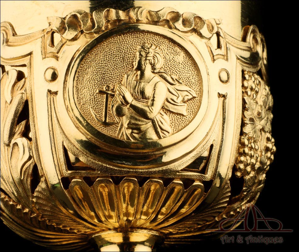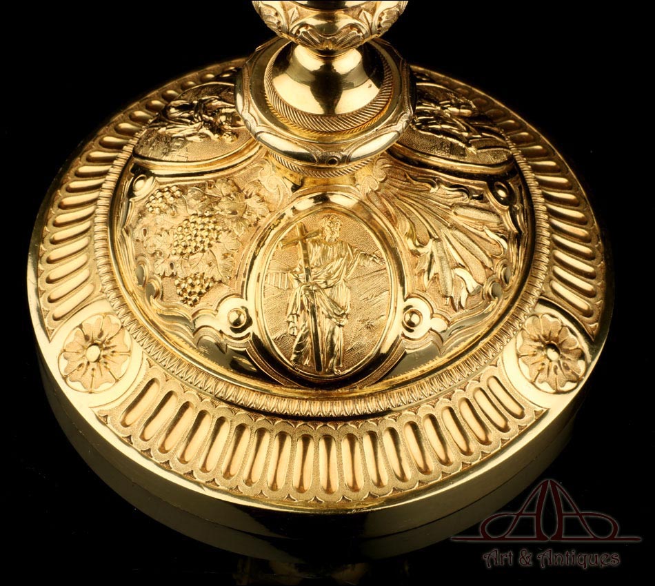 Fantástico cáliz antiguo en plata maciza dorada realizado en Francia en 1820 y en excelente estado de conservación. Se trata de una pieza muy hermosa, que destaca por preciosa decoración figurativa realizada a mano. El cáliz lleva una amplia base circular con profusión de motivos grabados y en relieve. Podemos ver tres medallones ovalados con figuras de cuerpo entero que representan a Jesucristo con la cruz, a San José y a la Virgen María con el Niño. En el tallo, el nudo principal está decorado con cabezas de querubines y motivos florales. La sobrecopa, por su parte, lleva tres pequeños medallones circulares con figuras femeninas representadas en tres cuartos. Las figuras son las tres Virtudes Teologales: la Fe, la Esperanza y la Caridad. Los medallones están separados por tres símbolos clásicos de la liturgia cristiana: los racimos de uva, las espigas de trigo y los juncos. Todas las partes del cáliz llevan contrastes que identifican la plata de París y el sello del platero.