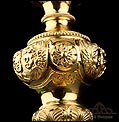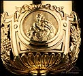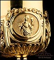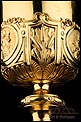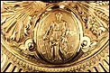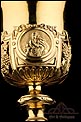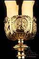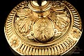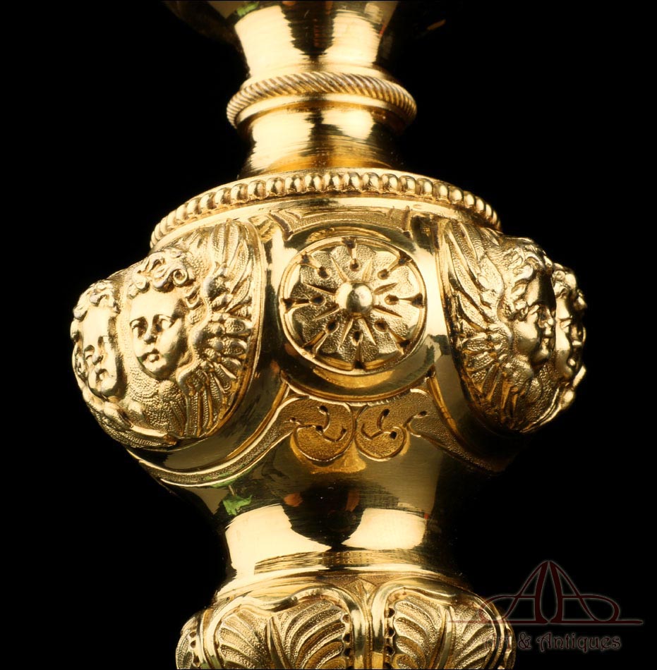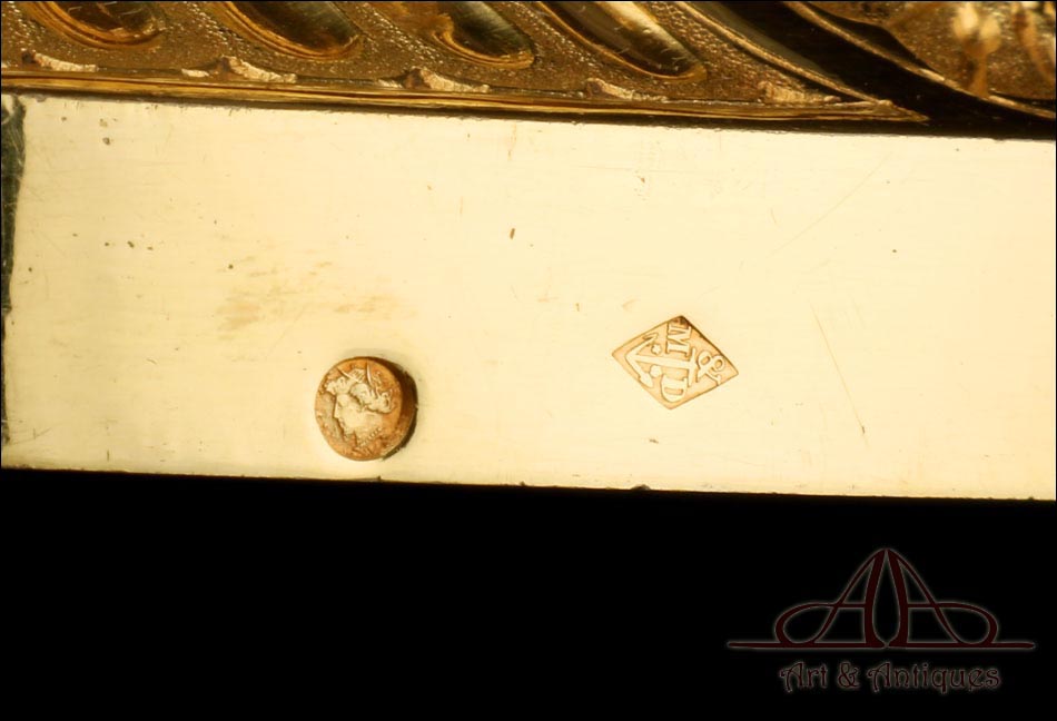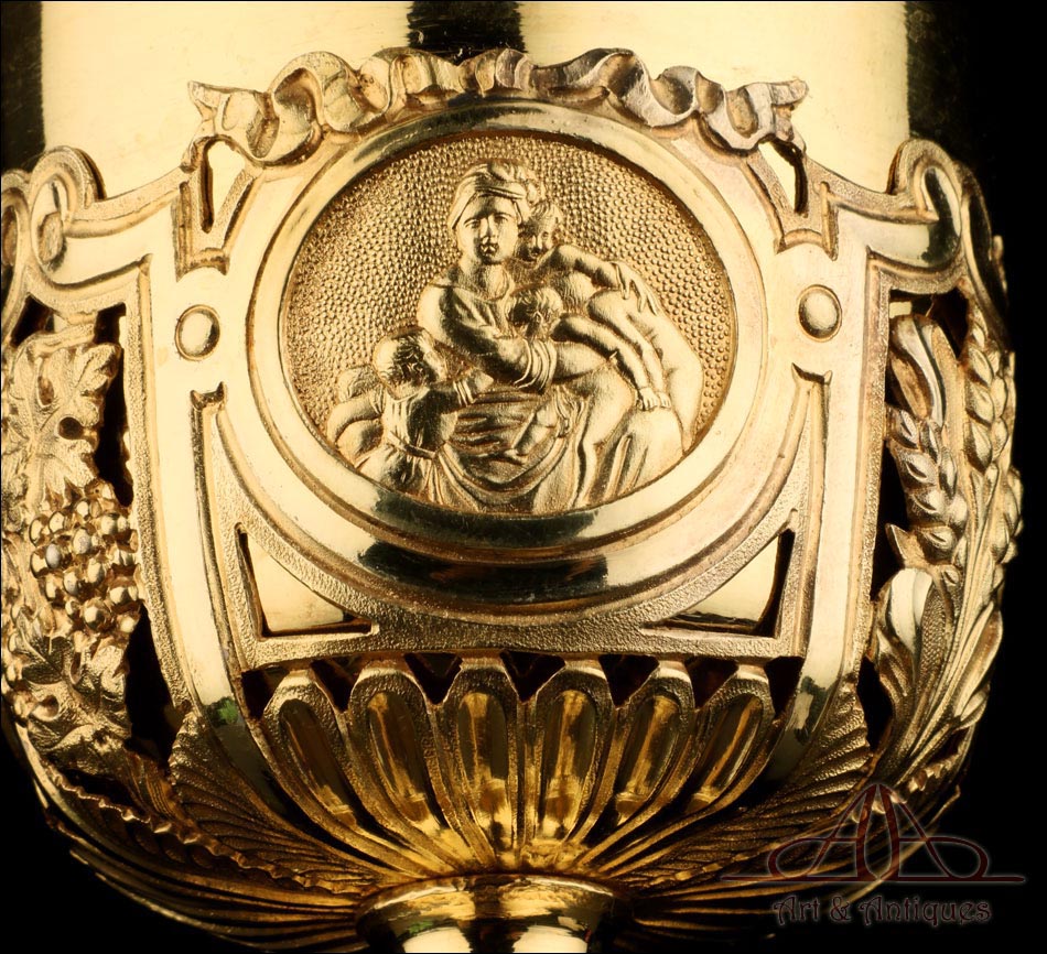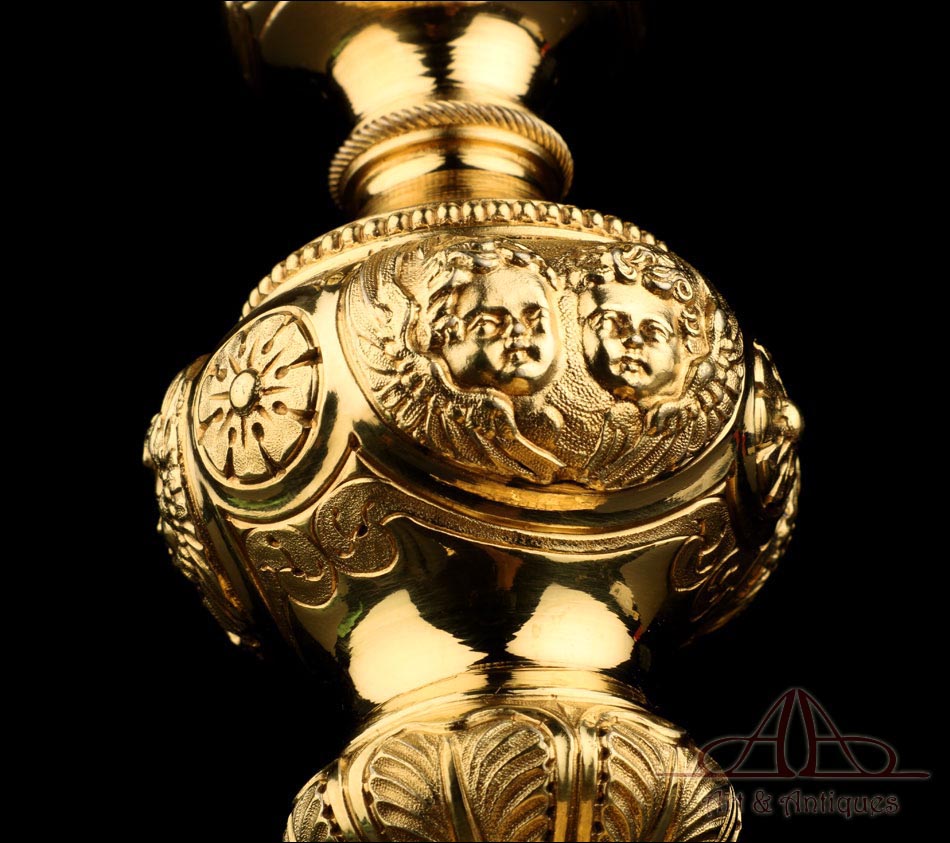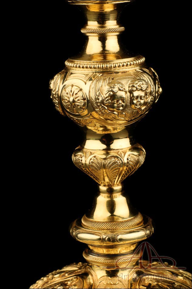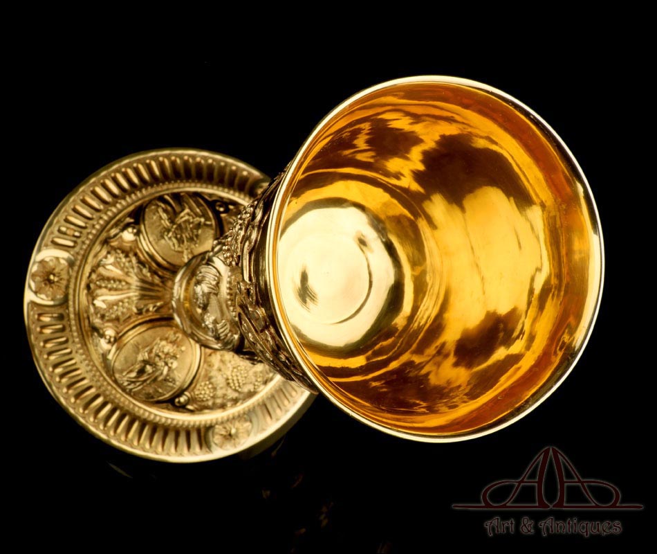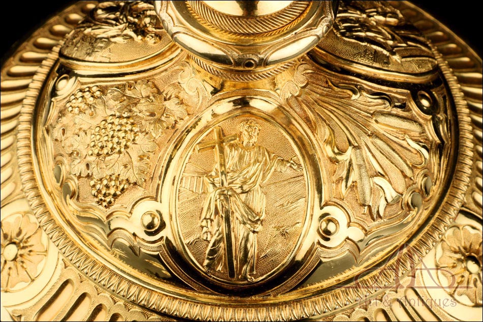 Fantástico cáliz antiguo en plata maciza dorada realizado en Francia en 1820 y en excelente estado de conservación. Se trata de una pieza muy hermosa, que destaca por preciosa decoración figurativa realizada a mano. El cáliz lleva una amplia base circular con profusión de motivos grabados y en relieve. Podemos ver tres medallones ovalados con figuras de cuerpo entero que representan a Jesucristo con la cruz, a San José y a la Virgen María con el Niño. En el tallo, el nudo principal está decorado con cabezas de querubines y motivos florales. La sobrecopa, por su parte, lleva tres pequeños medallones circulares con figuras femeninas representadas en tres cuartos. Las figuras son las tres Virtudes Teologales: la Fe, la Esperanza y la Caridad. Los medallones están separados por tres símbolos clásicos de la liturgia cristiana: los racimos de uva, las espigas de trigo y los juncos. Todas las partes del cáliz llevan contrastes que identifican la plata de París y el sello del platero.