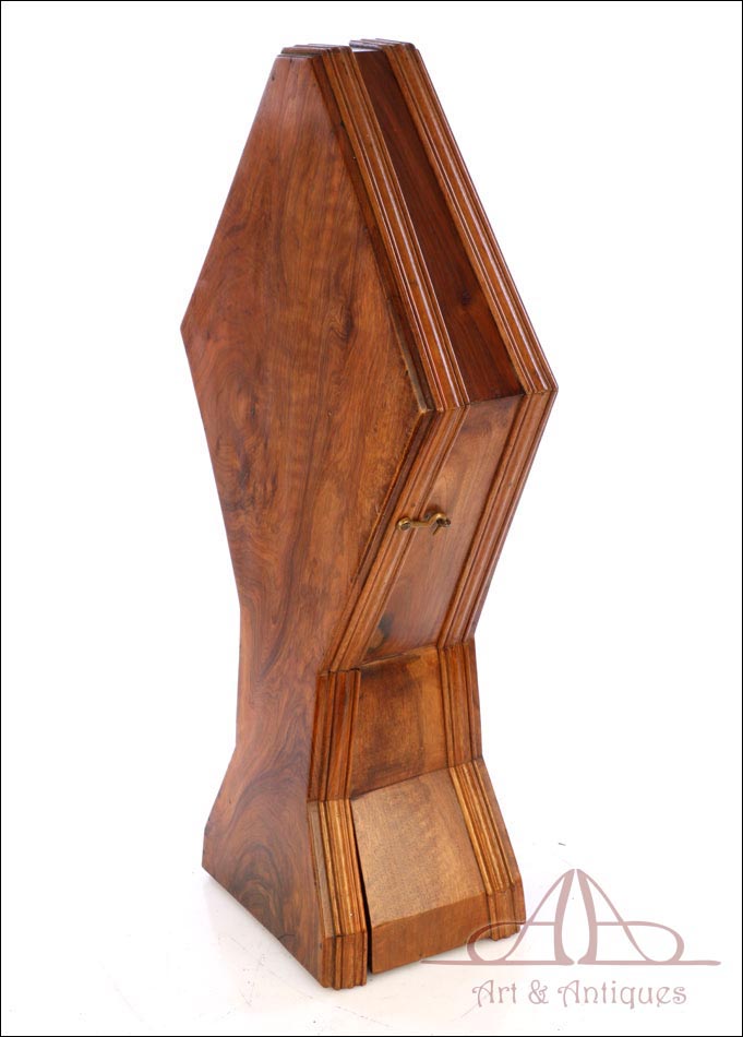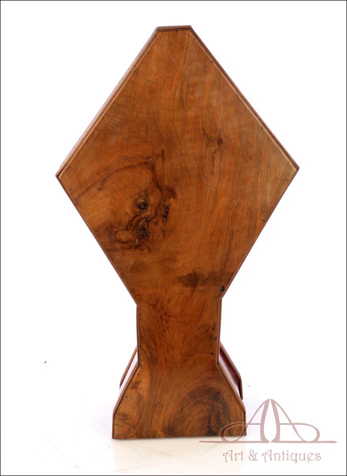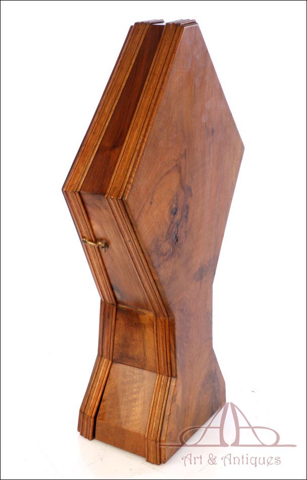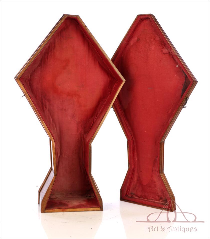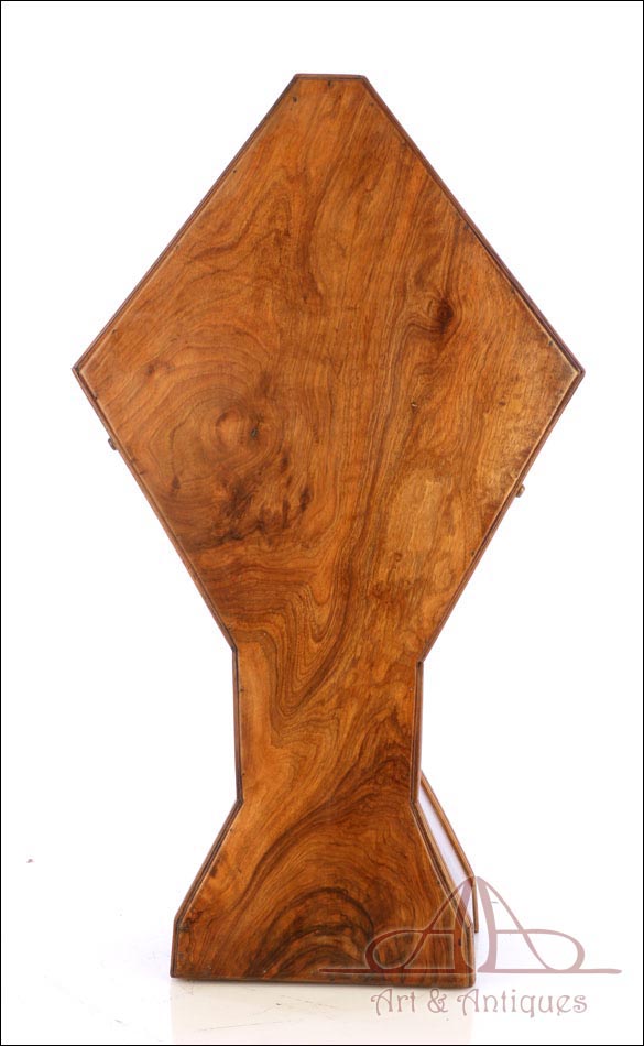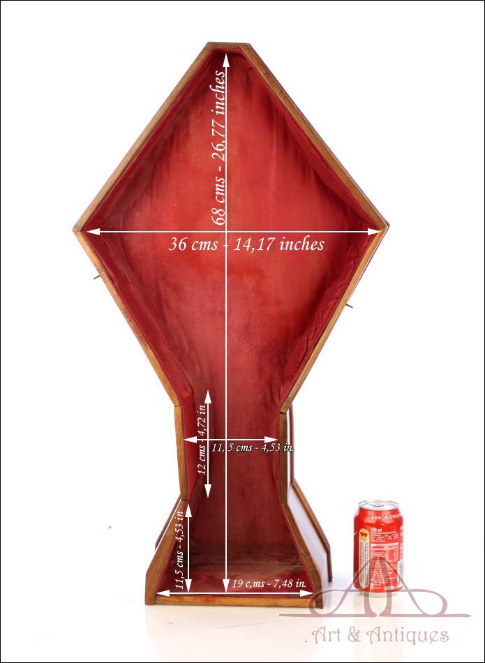 Bellísimo y antiguo estuche para custodia de hasta 68 cm, fabricado en madera de olivo y original del siglo XIX. El estuche es una pieza magnífica de por sí, tanto por su excelente estado de conservación como por la hermosa madera de la que está fabricado. Se trata de madera de olivo maciza, una especie que se caracteriza por su dureza, su resistencia y su belleza. Sobre un fondo castaño dorado en distintos tonos, la madera del estuche muestra una preciosa e intrincada veta llena de nudos y dibujos oscuros. Los bordes del estuche están adornados con molduras fresadas que le aportan carácter y nobleza. El cierre es un gancho de latón, en buen estado y original. En el interior, el estuche conserva el forro de satén rojo original de época, muy bien conservado y completo.
