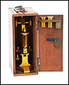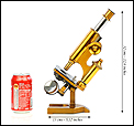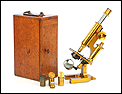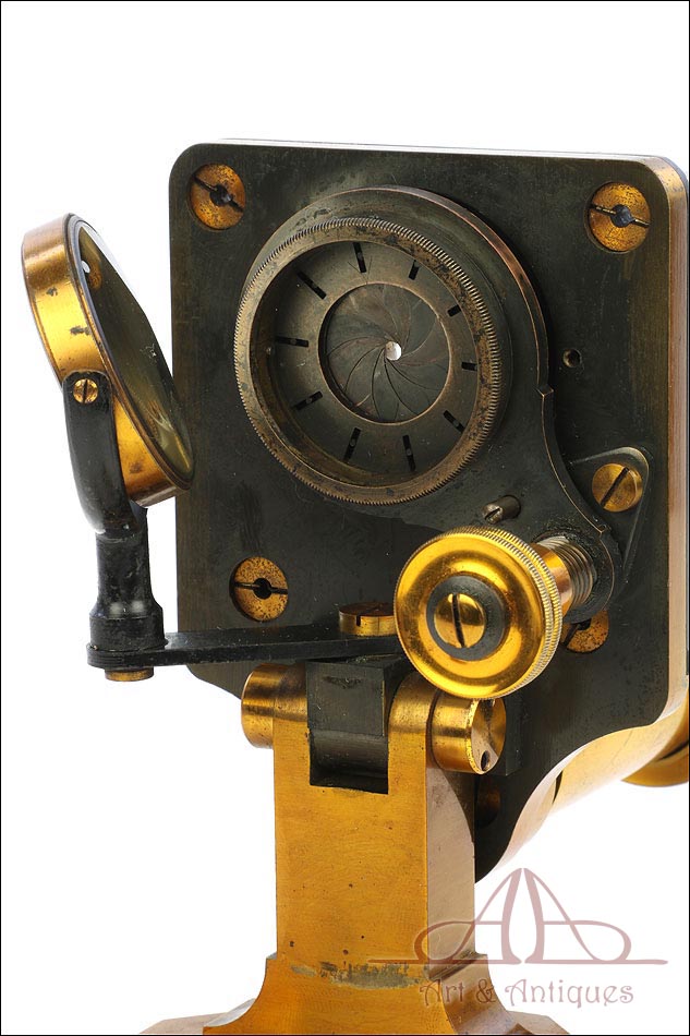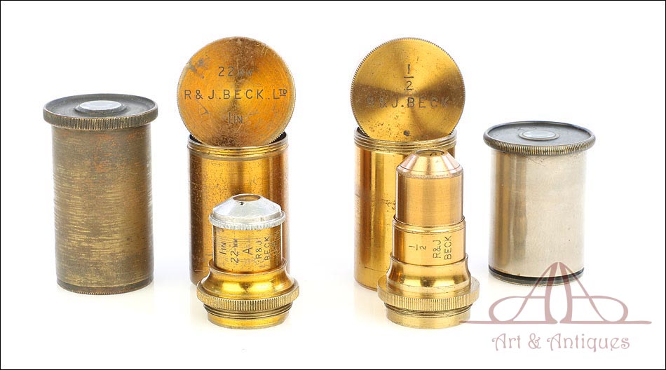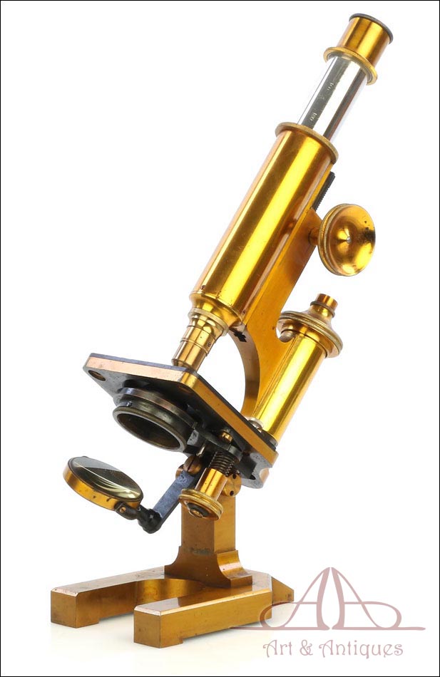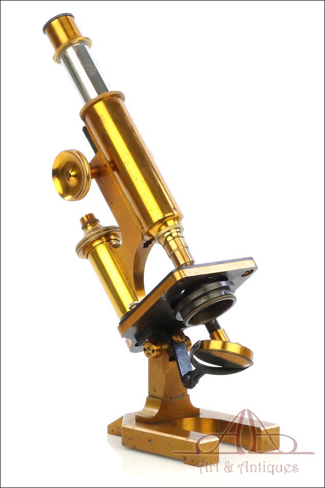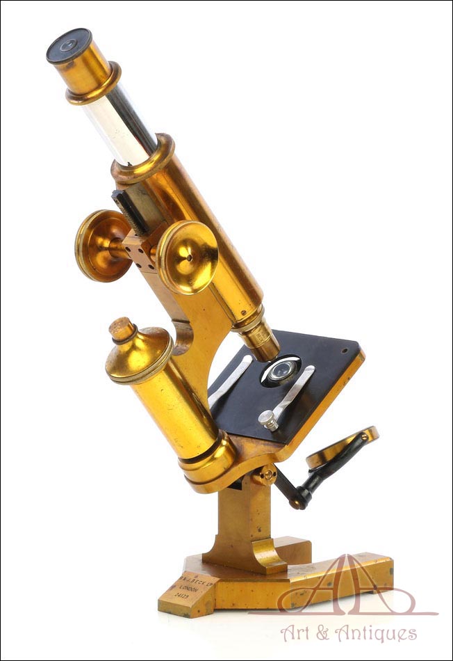 Magnífico y antiguo microscopio compuesto R & J Beck fabricado en Inglaterra circa 1890, muy bien conservado y funcionando. El microscopio se presenta en su estuche original de madera de caoba, con cerradura y llave en perfecto funcionamiento. Incluye un juego de dos oculares y dos objetivos; los objetivos están marcados con el nombre del fabricante en el cuerpo y en las fundas de latón. El microscopio está fabricado íntegramente en latón y conserva la laca protectora transparente original, que aporta al metal una pátina cálida y noble. Las únicas piezas que no son de latón son la pletina para muestras, el diafragma y el soporte del espejo, todas ellas fabricadas en metal esmaltado en negro.