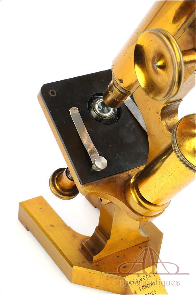 Los amantes de los microscopios de época sabrán apreciar la belleza y la autenticidad de este antiguo microscopio compuesto R & J Beck, en fantásticas condiciones.