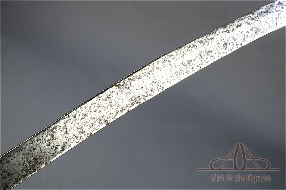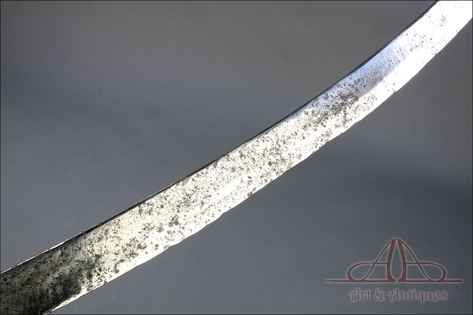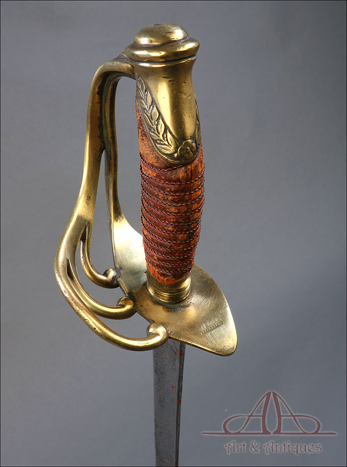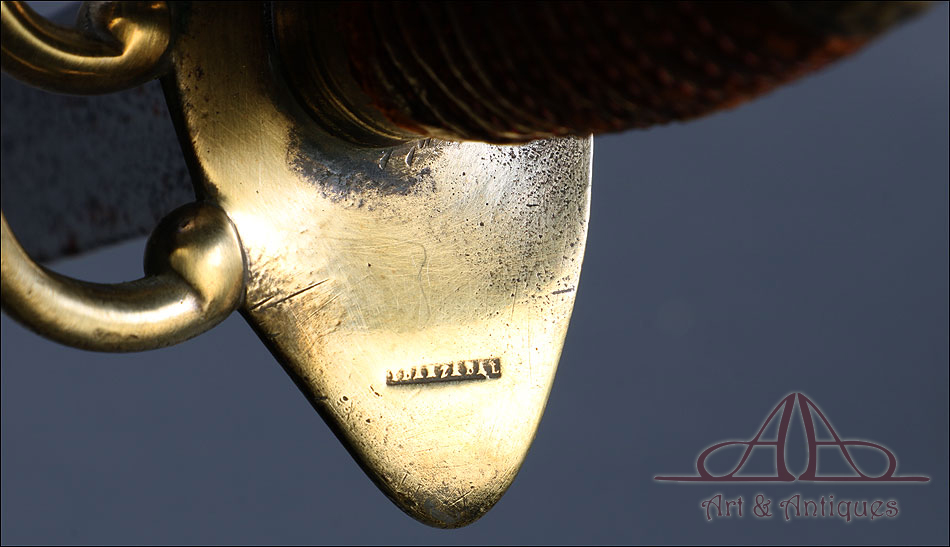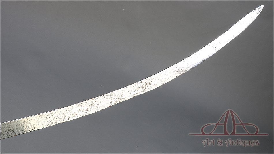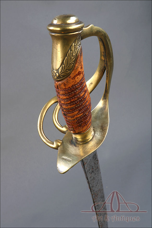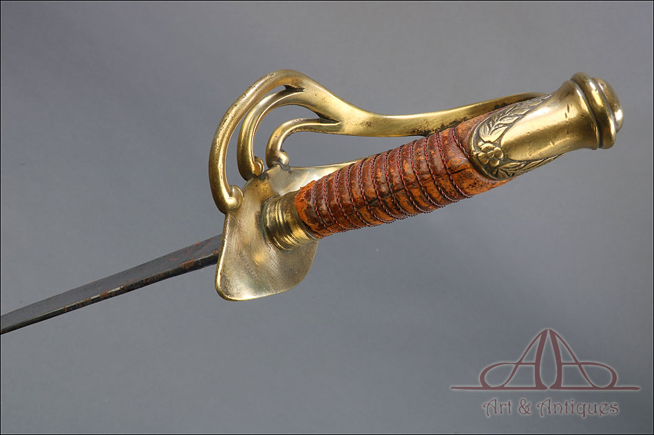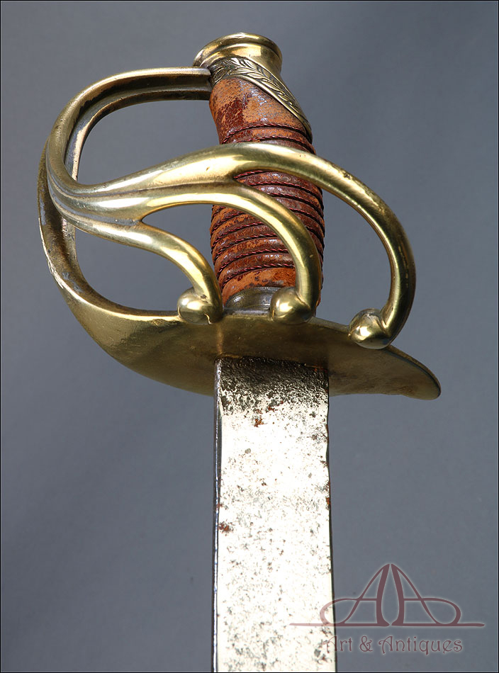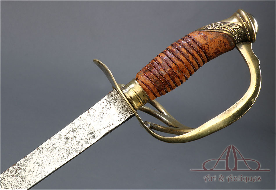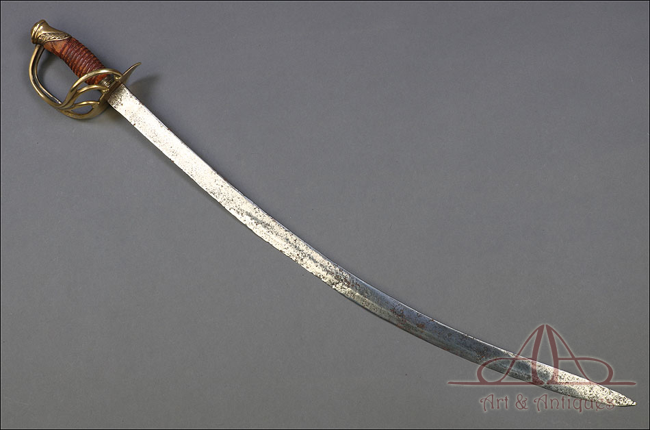 Antiguo sable español de oficial de artillería mod. 1842, fabricado en España en el siglo XIX y bien conservado. El sable monta hoja de acero; la superficie del metal muestra los signos del paso del tiempo y el uso, testigos de la autenticidad y el pasado del arma. La empuñadura de latón es de gran belleza, con un diseño fluido, sencillo y elegante que aporta un plus de belleza al sable. El guardamano se divide en tres gavilanes curvos que se unen a la cruz; esta lleva grabado el sello de Ibarzábal, el famoso fabricante español de armas. La parte superior del puño está revestida de latón y lleva grabado un precioso motivo de flores y hojas. El puño es de madera revestida en cuero; tanto el cuero como el torzal han sido renovados.