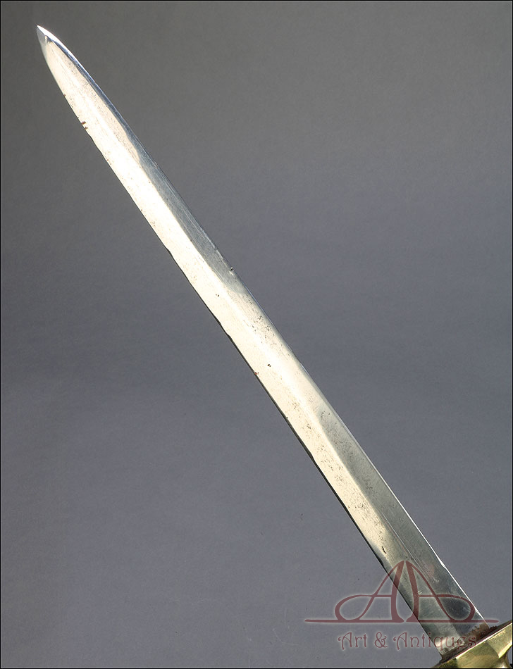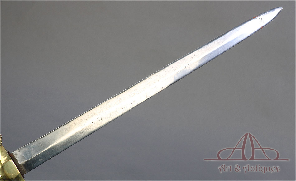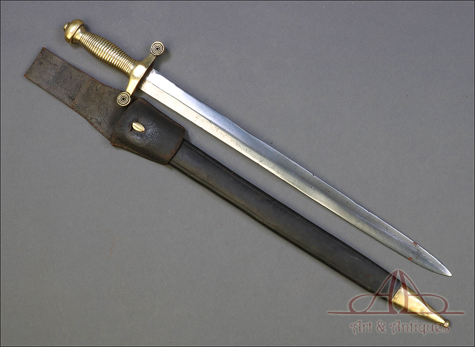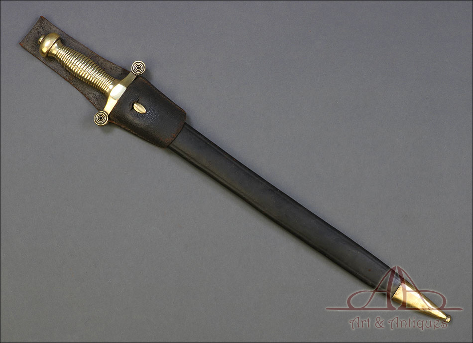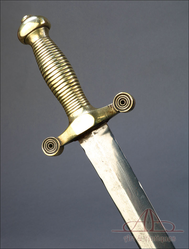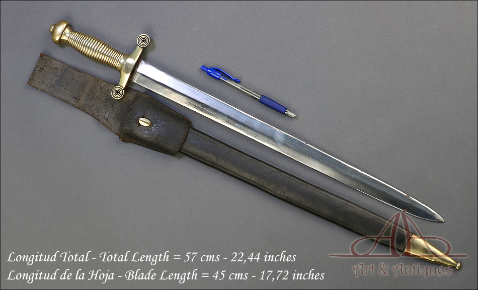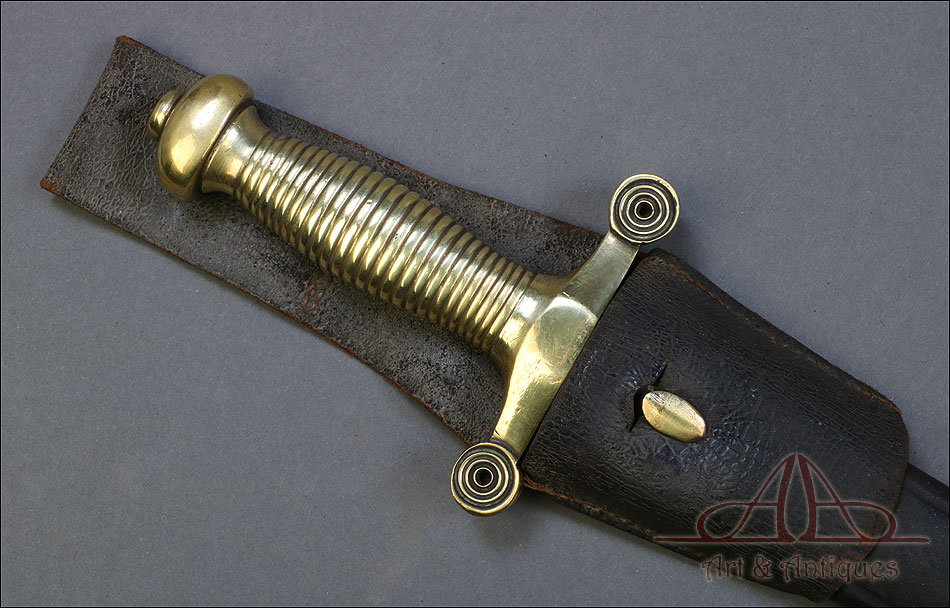 Soberbio machete francés modelo 1855 para zapador bombero, fabricado en Francia circa 1860 y en muy buen estado. Los zapadores bomberos franceses (Sapieurs-Pompiers) eran un cuerpo militar, cuyos regimientos fueron destinados a la lucha contra el fuego a partir del año 1833. El machete que vemos en las imágenes es parte del uniforme oficial de los miembros del cuerpo, y a pesar de su antigüedad ha llegado a nosotros en muy buenas condiciones. Es un arma de precioso y sobrio diseño, con hoja de acero y empuñadura de latón. La hoja aparece pulida y brillante, sin rastros de óxido y magníficamente conservada. Lo mismo cabe decir de la empuñadura, con puño ahusado y cruz recta. El machete se presenta con su vaina original de cuero oscuro, en muy buen estado y con contera de latón.