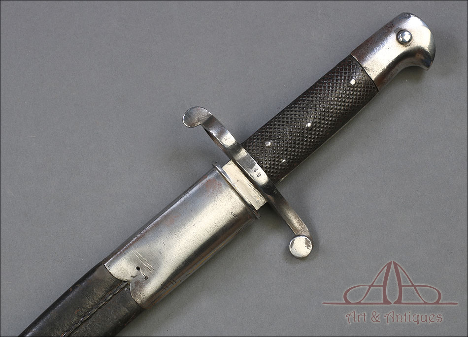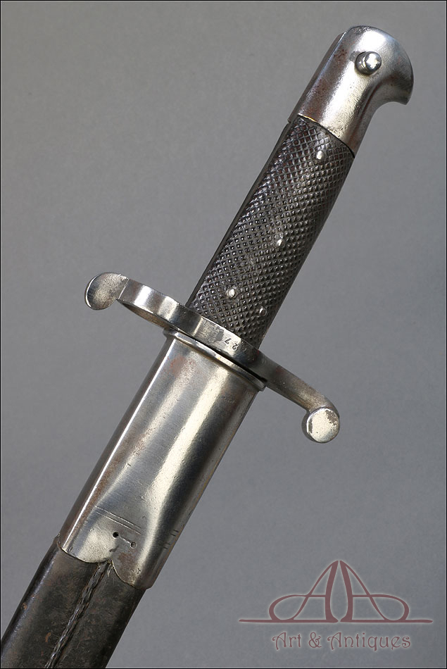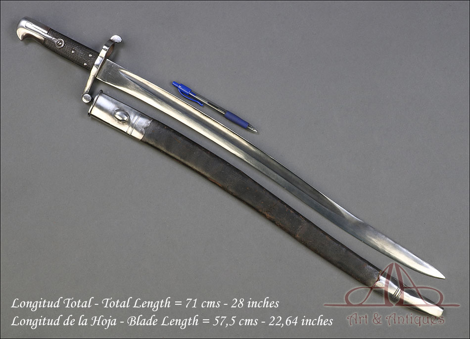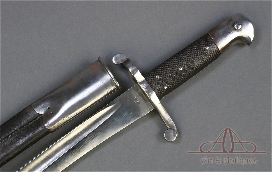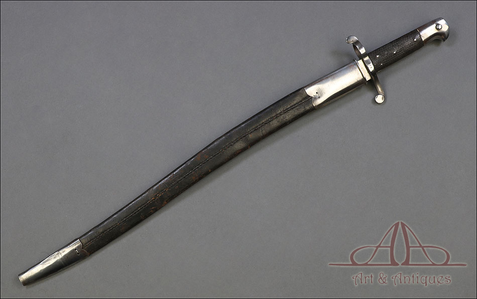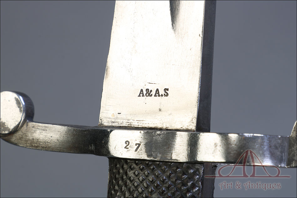 Antigua espada-bayoneta británica modelo 1856 para el fusil Enfield, fabricada en UK circa 1860. Se trata de un arma original de época, muy hermosa y en magníficas condiciones. Lleva hoja tipo yatagán, con el característico diseño ligeramente ondulado típico de los cuchillos turcos que le dan nombre. La hoja lleva una rara marca de fabricante: A & A.S., correspondiente a August and Albert Schnitzler de Solingen, Alemania. Este detalle sugiere que la espada-bayoneta fue fabricada en este país para ser exportada después al Reino Unido, algo bastante habitual en la época. La hoja de la espada se muestra lisa y brillante, sin rastros de óxido o deterioro. La empuñadura está igualmente bien conservada, con el puño de madera negra original en muy buen estado y la cruz grabada con el número de serie. La espada-bayoneta se acompaña de su vaina original, fabricada en cuero negro y con la contera y el brocal de acero.