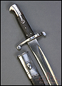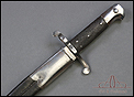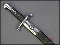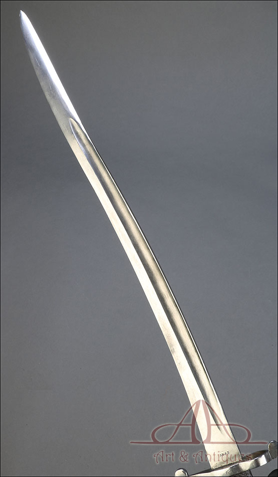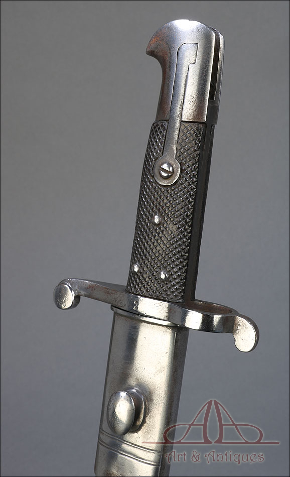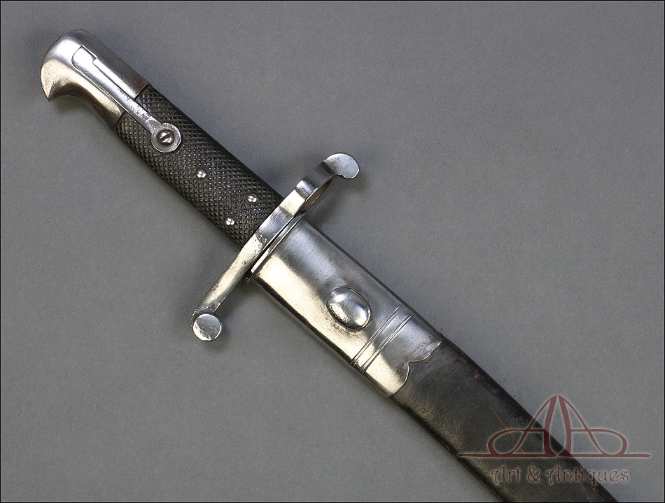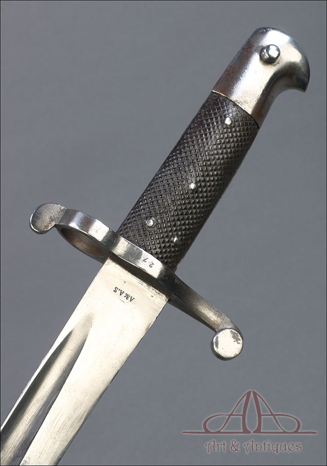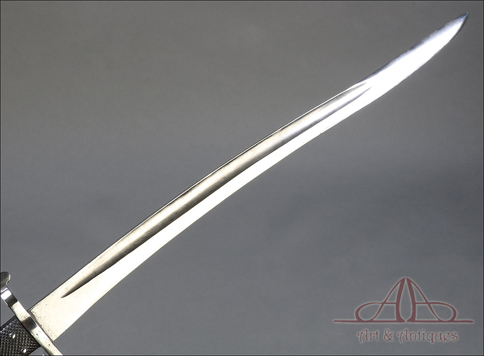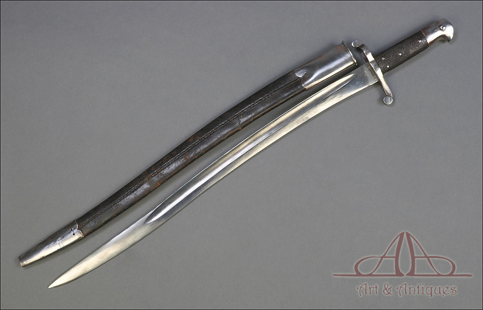 Antigua espada-bayoneta británica modelo 1856 para el fusil Enfield, fabricada en UK circa 1860. Se trata de un arma original de época, muy hermosa y en magníficas condiciones. Lleva hoja tipo yatagán, con el característico diseño ligeramente ondulado típico de los cuchillos turcos que le dan nombre. La hoja lleva una rara marca de fabricante: A & A.S., correspondiente a August and Albert Schnitzler de Solingen, Alemania. Este detalle sugiere que la espada-bayoneta fue fabricada en este país para ser exportada después al Reino Unido, algo bastante habitual en la época. La hoja de la espada se muestra lisa y brillante, sin rastros de óxido o deterioro. La empuñadura está igualmente bien conservada, con el puño de madera negra original en muy buen estado y la cruz grabada con el número de serie. La espada-bayoneta se acompaña de su vaina original, fabricada en cuero negro y con la contera y el brocal de acero.
