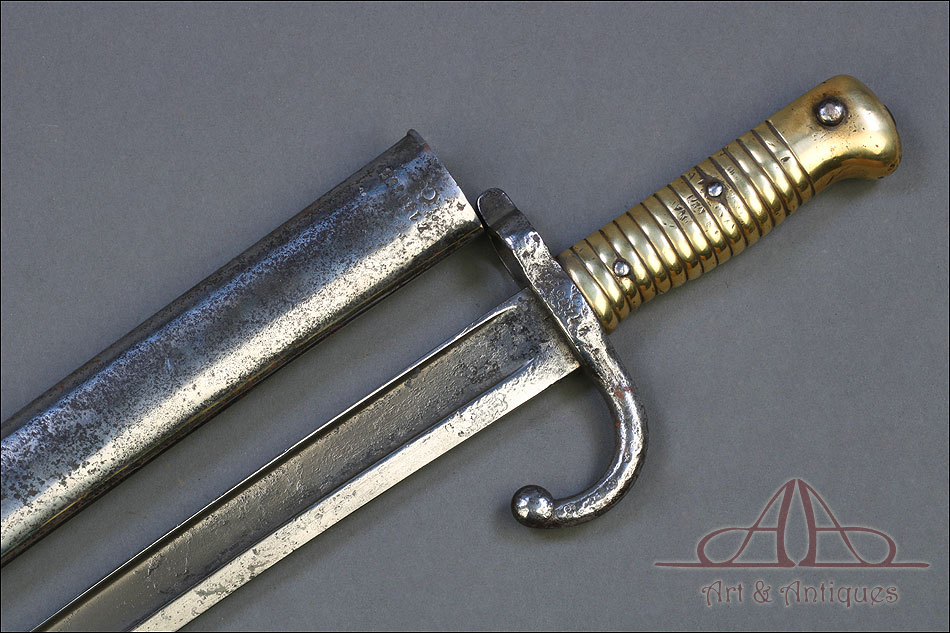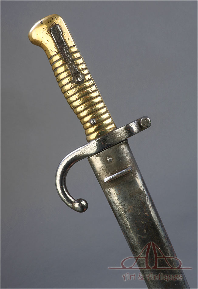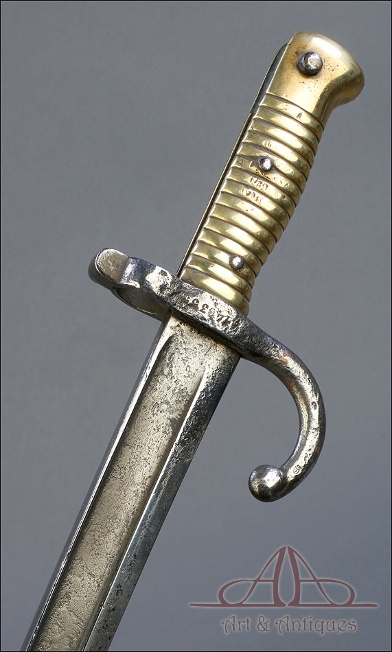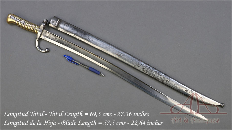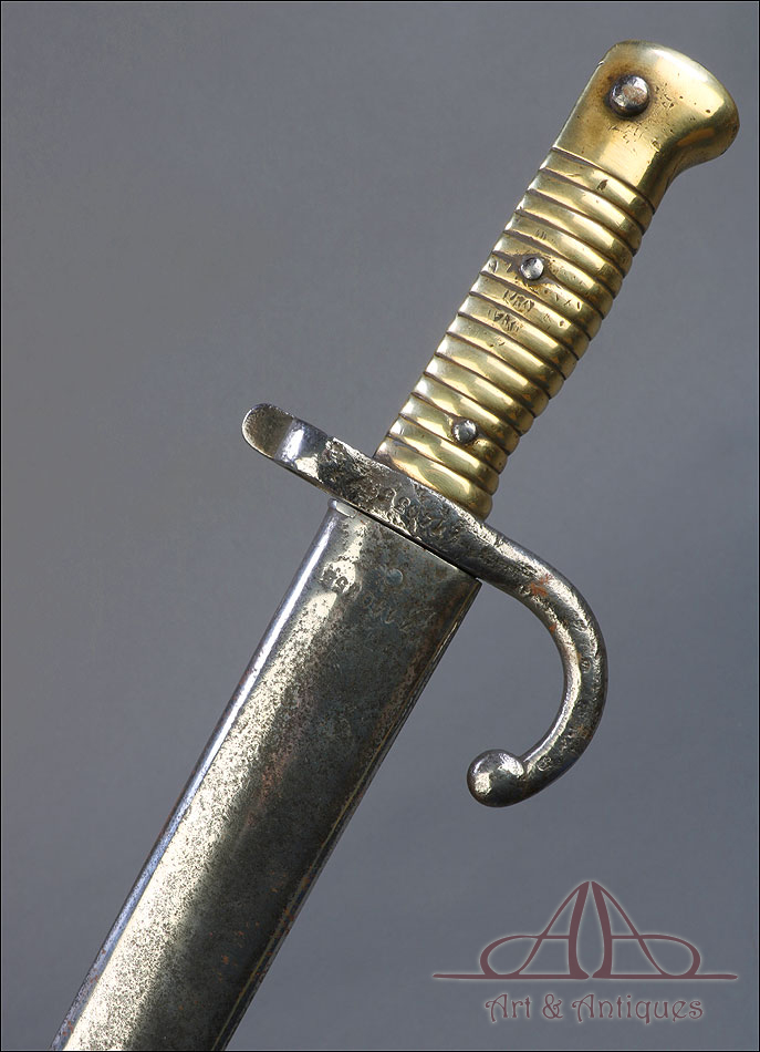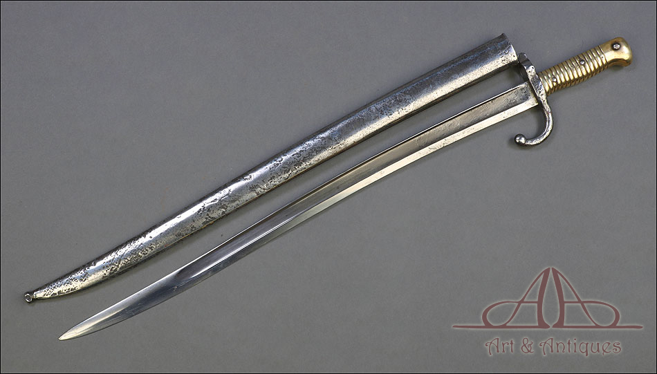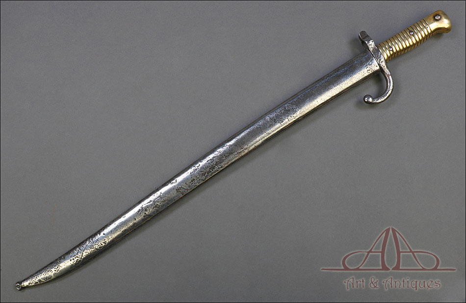 Antigua espada bayoneta francesa mod. 1866 para fusil Chassepot, fabricada en Francia circa 1870. Esta fascinante arma monta hoja de acero yatagán y empuñadura de acero y latón, y va acompañada de su vaina original, también de acero. La hoja lleva la marca grabada a mano en elegante letra cursiva, actualmente ilegible; está bien conservada, con la pátina otorgada por el paso del tiempo y el uso que también queda patente en la vaina. Ambas piezas llevan grabado el número de serie: 140355, lo que certifica que forman parte del mismo conjunto. El puño de la espada lleva cachas de latón con ranuras horizontales, fijadas a la base mediante remaches de acero. La cruz incluye una mordaza para sujetar la espada bayoneta al fusil y el gavilán con forma de gancho, característico de estas armas.