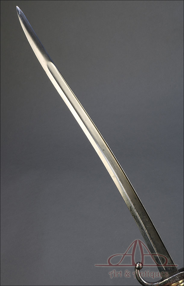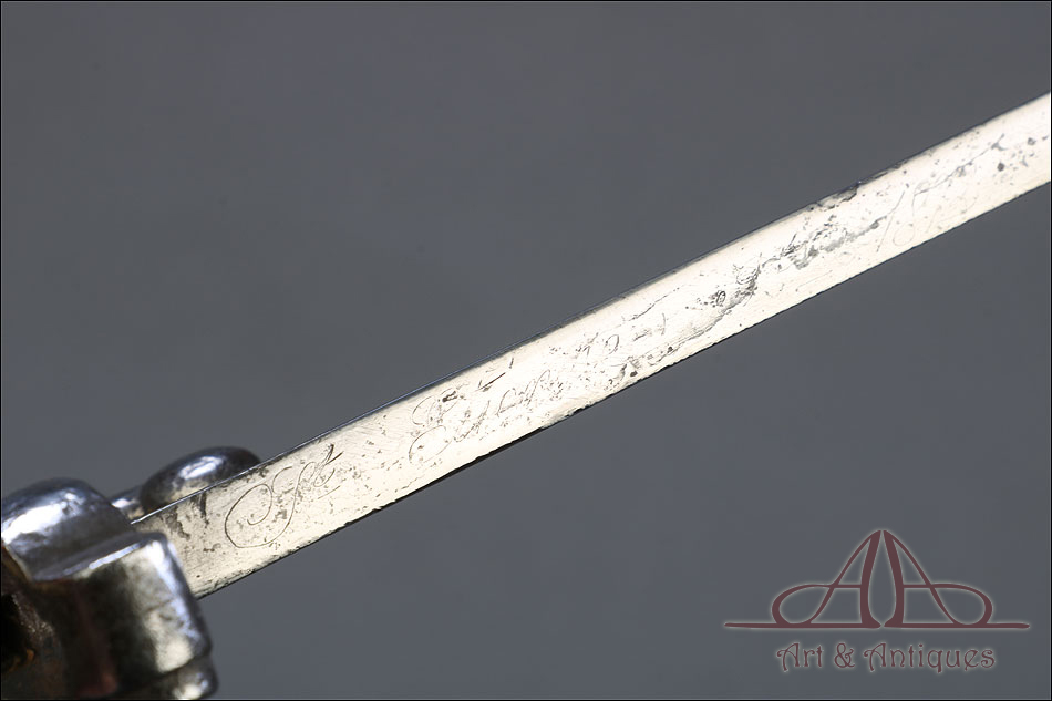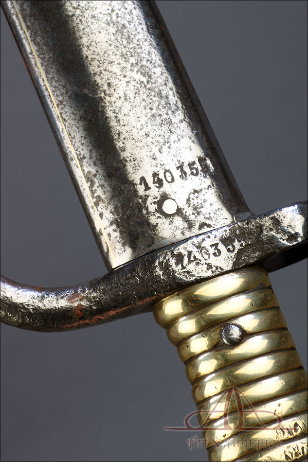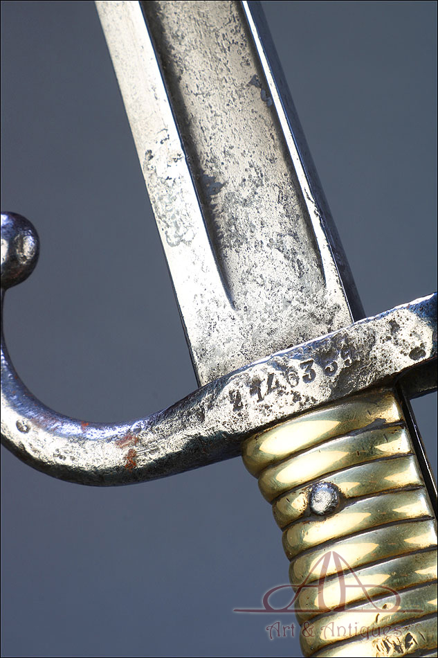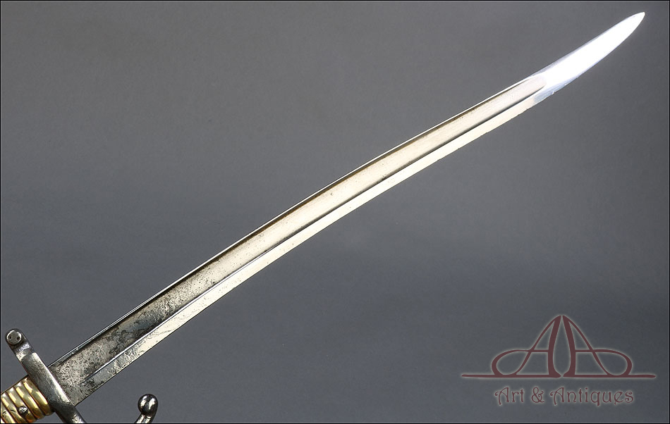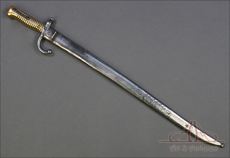 Antigua espada bayoneta francesa mod. 1866 para fusil Chassepot, fabricada en Francia circa 1870. Esta fascinante arma monta hoja de acero yatagán y empuñadura de acero y latón, y va acompañada de su vaina original, también de acero. La hoja lleva la marca grabada a mano en elegante letra cursiva, actualmente ilegible; está bien conservada, con la pátina otorgada por el paso del tiempo y el uso que también queda patente en la vaina. Ambas piezas llevan grabado el número de serie: 140355, lo que certifica que forman parte del mismo conjunto. El puño de la espada lleva cachas de latón con ranuras horizontales, fijadas a la base mediante remaches de acero. La cruz incluye una mordaza para sujetar la espada bayoneta al fusil y el gavilán con forma de gancho, característico de estas armas.