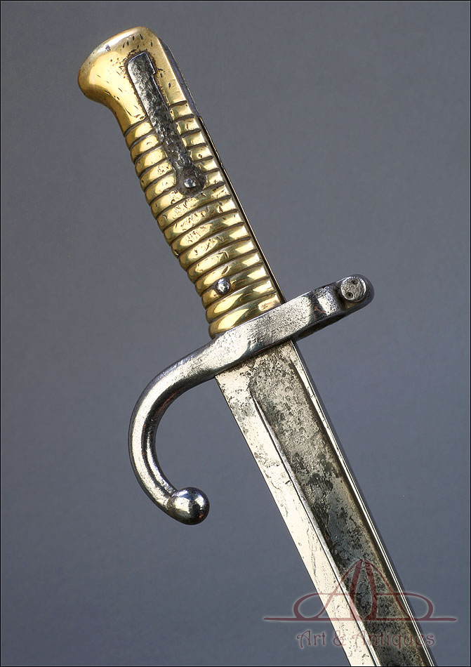 Esta impresionante espada bayoneta francesa mod. 1866 para fusil Chassepot brilla con luz propia por su antigüedad e impactante presencia.