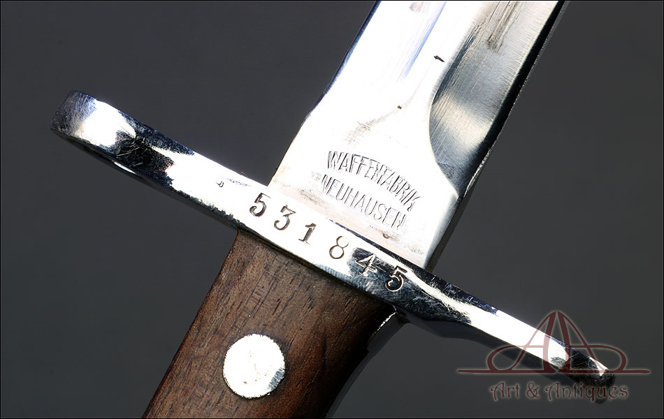 Soberbia y antigua bayoneta suiza modelo 1889 para fusil Schmidt-Rubin, fabricada en Suiza circa 1895 y en excepcional estado de conservación. La bayoneta está diseñada para ser montada en el fusil Schmidt-Rubin mod. 1898 y 1911. Tanto la hoja de acero como la empuñadura están en muy buenas condiciones: el metal muestra una superficie pulida, lisa y brillante, sin rastros de óxido o deterioro. Junto a la cruz podemos ver el nombre del fabricante, WAFFENFABRIK NEUHAUSEN, claramente grabado en letras mayúsculas. La empuñadura lleva cruz de acero recta, con un orificio en uno de los gavilanes por donde se encaja el cañón del rifle. El puño está cubierto por dos cachas de madera maciza oscura, fijadas con remaches de acero y rematadas con pomo del mismo metal. La vaina de acero con acabado negro está ligeramente desgastada, pero está en buenas condiciones y conserva la correa de cuero original.