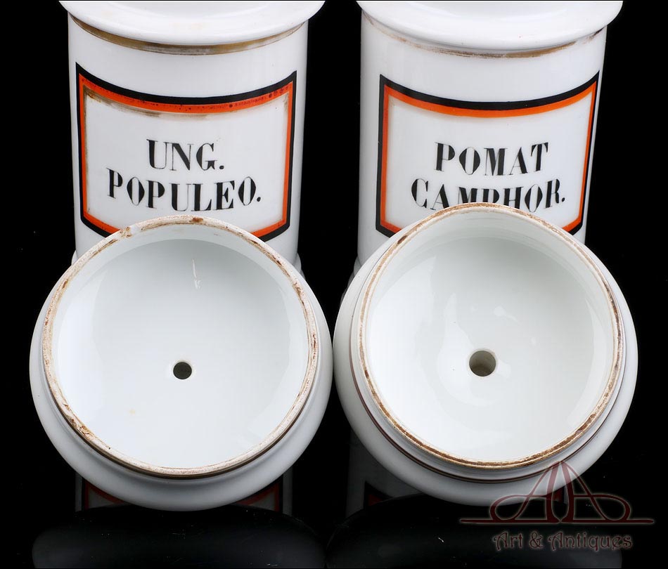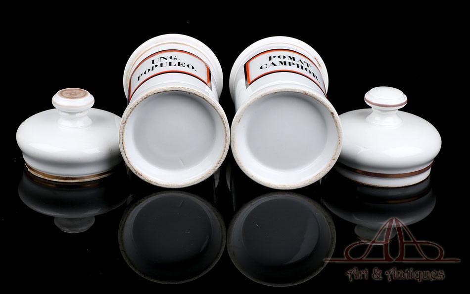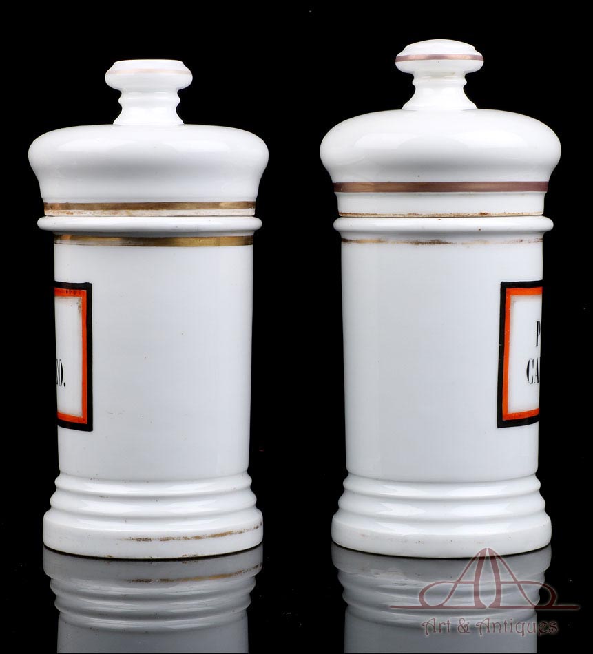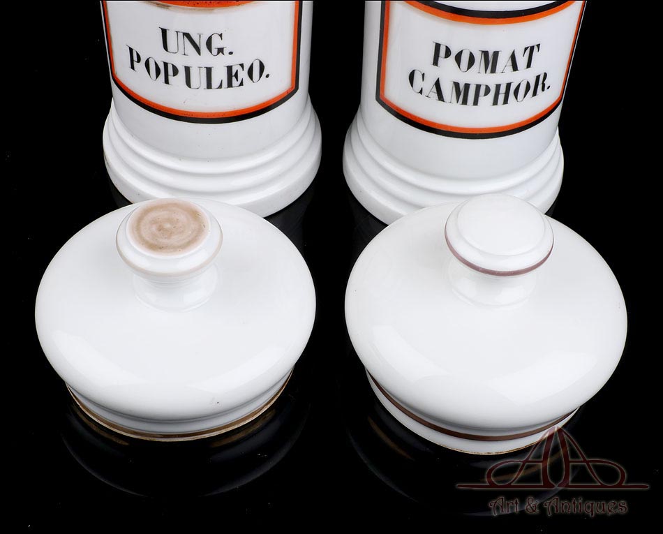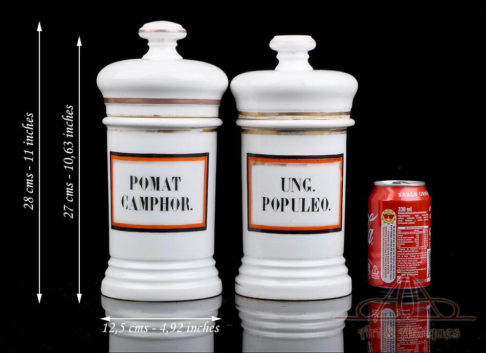 Hermosa pareja de botes de farmacia de porcelana antiguos, fabricados en España circa 1900-1930 y en muy buen estado de conservación. La porcelana no muestra pelos, desperfectos ni zonas deterioradas, conservando su blancura y su integridad. A pesar de su fragilidad y su antigüedad, ambos botes han llegado a nuestros días en fantásticas condiciones. Su diseño es muy clásico y atractivo: tienen forma cilíndrica y llevan tapas también de porcelana, coronadas por un pomo que sirve para cogerlas. En la parte delantera los botes llevan grandes etiquetas pintadas a mano, con marco cuadrado en negro, rojo y dorado e inscripciones en letras mayúsculas negras. En uno de ellos podemos leer UNG. POPULEO, mientras que en el otro aparece la inscripción POMAT CAMPHOR. Tanto en la base de los botes como en el borde de todas las piezas, incluyendo las tapas, se distingue la marca de horno que caracteriza a los objetos de porcelana artesanales: una leve tonalidad parda generada por el calor de la cocción.