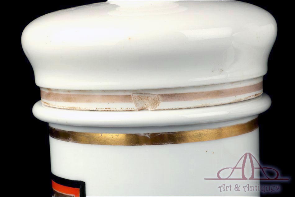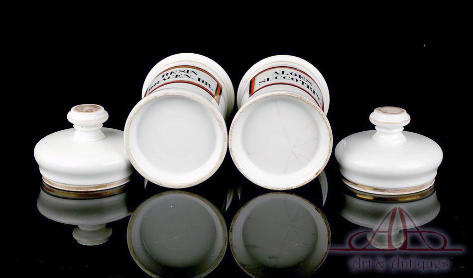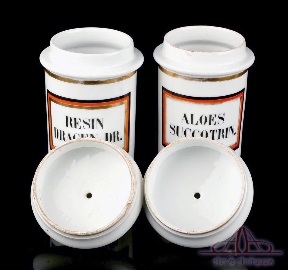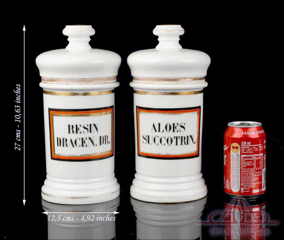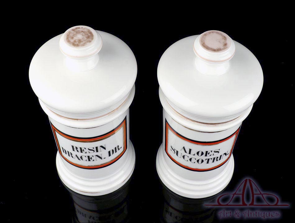 Fantástica pareja de botes de farmacia de porcelana antiguos, fabricados en España circa 1900-1930 y bien conservados. Los botes tienen un diseño clásico y elegante, aún más atractivo por la decoración pintada a mano que muestra su cara delantera. El único desperfecto que podemos encontrar es un pequeño golpe localizado en el borde de una de las tapas. Se trata de una muesca poco importante; se puede ocultar colocando el defecto en la parte trasera, de forma que no interfiera en la belleza del artículo. Sobre la fina porcelana blanca, las etiquetas pintadas en el cuerpo de los botes destacan con potencia. Ambos llevan abreviaturas en mayúsculas negras ubicadas en el interior de unos marcos cuadrados, realizados con bandas de color negro, rojo y dorado. En el borde superior de los botes y en las tapas hay también bandas doradas que hacen juego con la decoración. En uno de los botes podemos leer ALOES SUCCOTRIN.; en el otro, VERATR. SABADILL. En la base de los botes y el borde de las tapas se distingue la marca del horno, un tono ligeramente oscurecido creado por el calor generado en el proceso de cocción y que distingue a las piezas de cerámica artesanal.