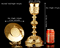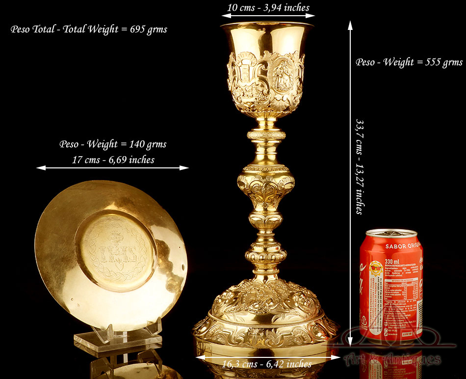 Medidas: Cáliz: Ancho de la Base: 16,3 cm. Ancho de la Copa: 10 cm. Altura: 33,7 cm. Peso: 555 g. Patena: Diámetro: 17 cm. Peso: 140 g. Peso Total: 695 g.