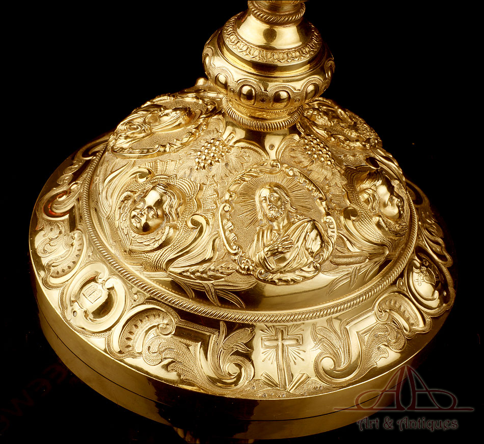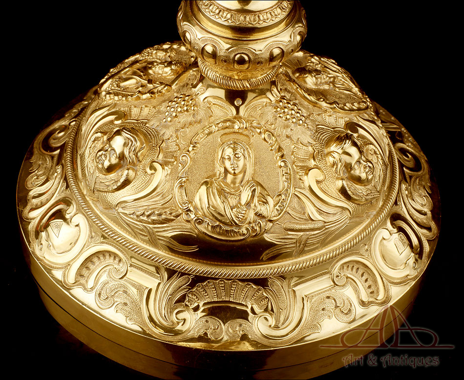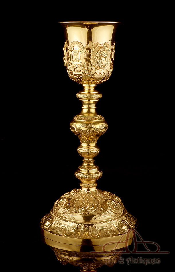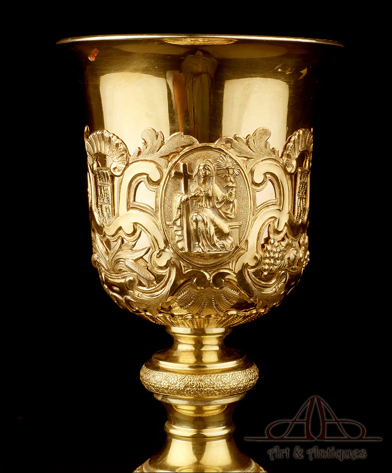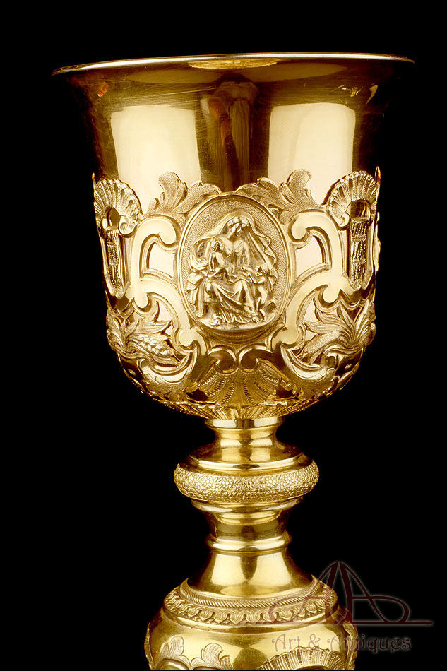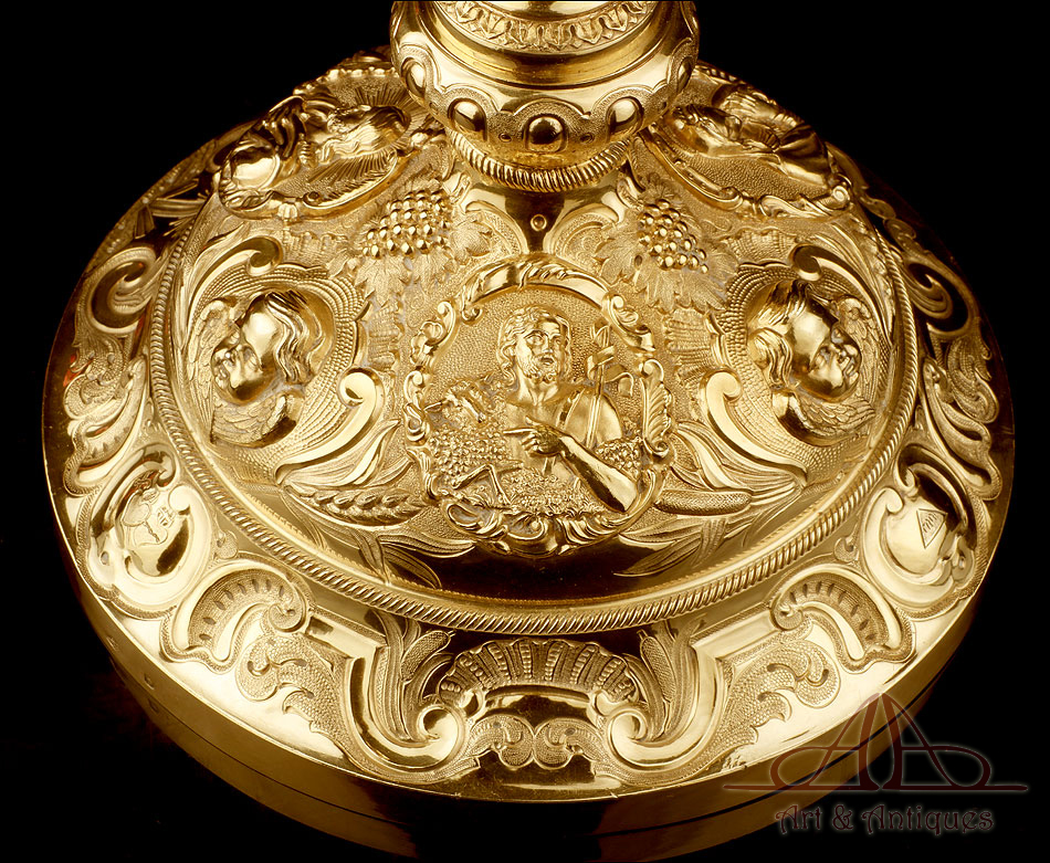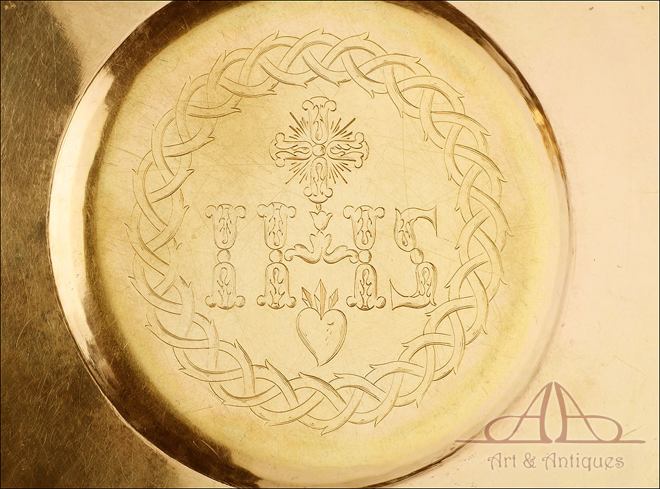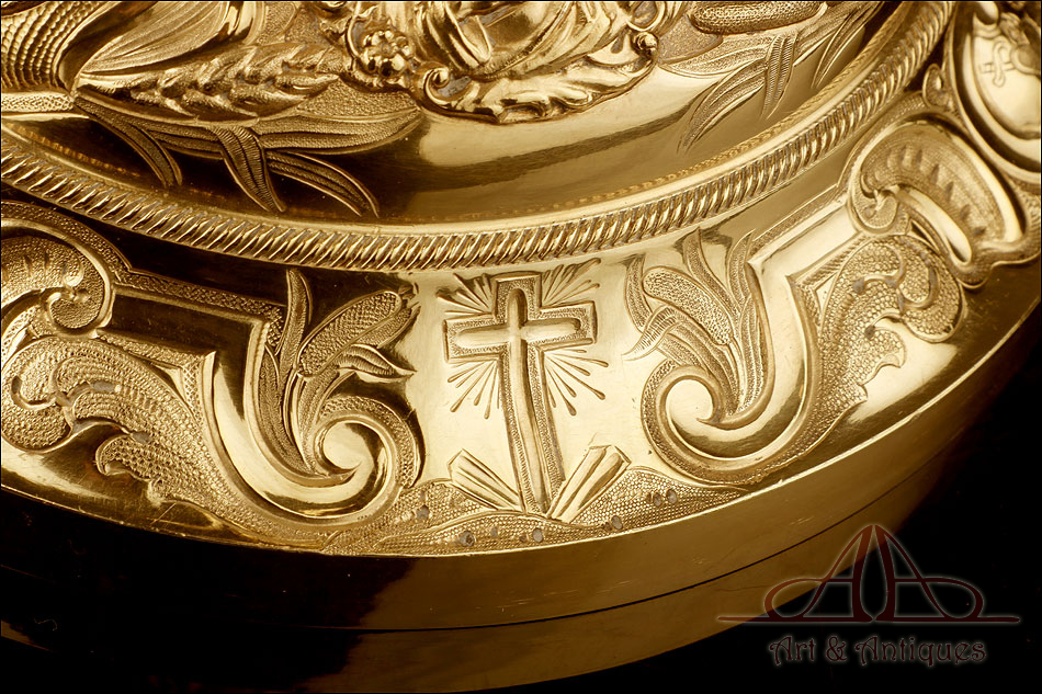 Fantásticos cáliz y patena antiguos de plata dorada fabricados en Francia en el siglo XIX, en muy buenas condiciones y con espectacular decoración grabada a mano. El cáliz, concretamente, es una pieza digna de un museo: la superficie de la pieza está totalmente cubierta por motivos en relieve o grabados en el metal, que conforman una decoración tan preciosista como magnífica. La base del cáliz es circular y amplia; el borde lleva grabados tres símbolos católicos (la Cruz en el Calvario, el Sagrado Corazón atravesado por una lanza y el Ojo de la Providencia), separados por hermosas volutas superpuestas.